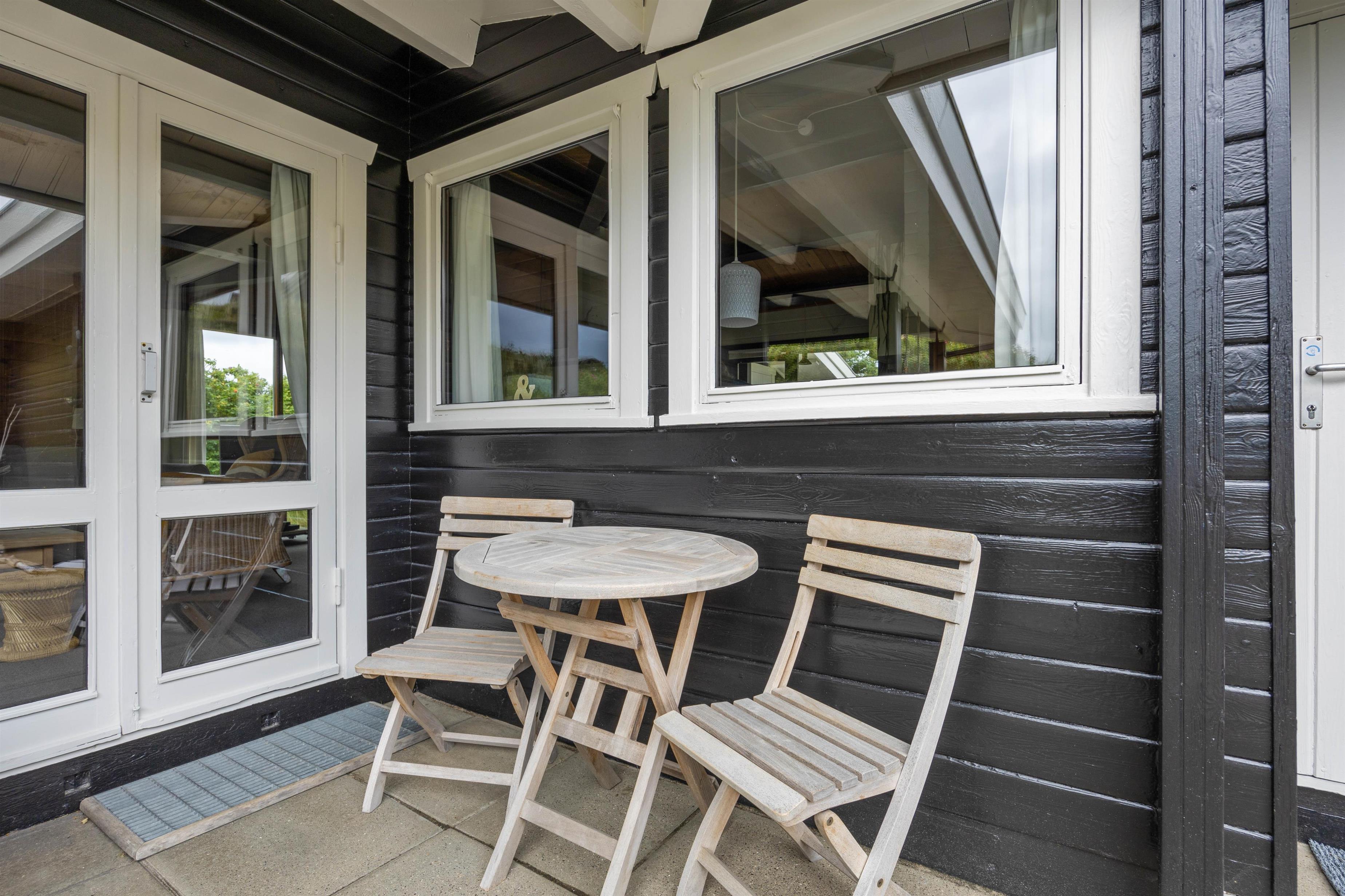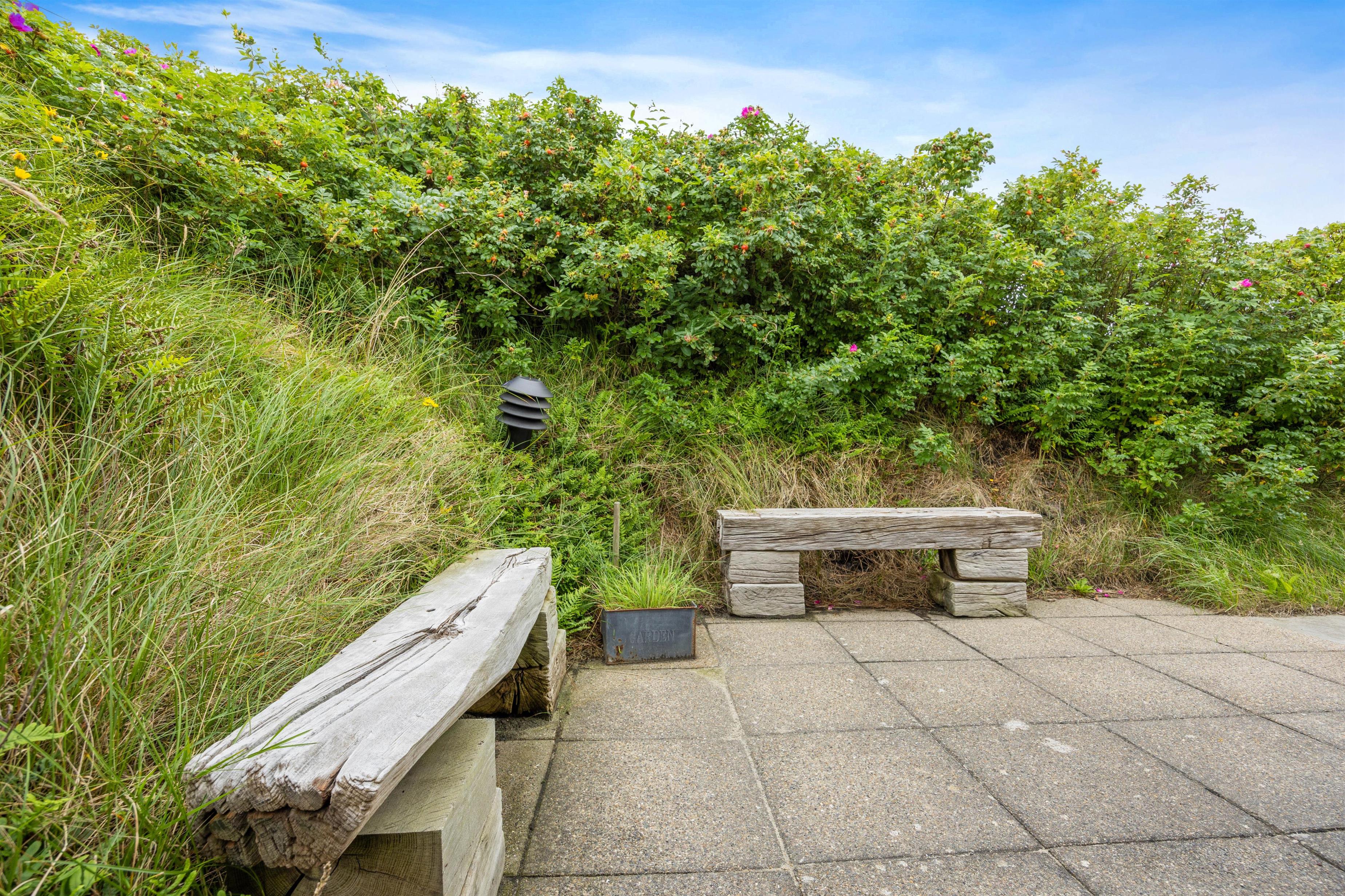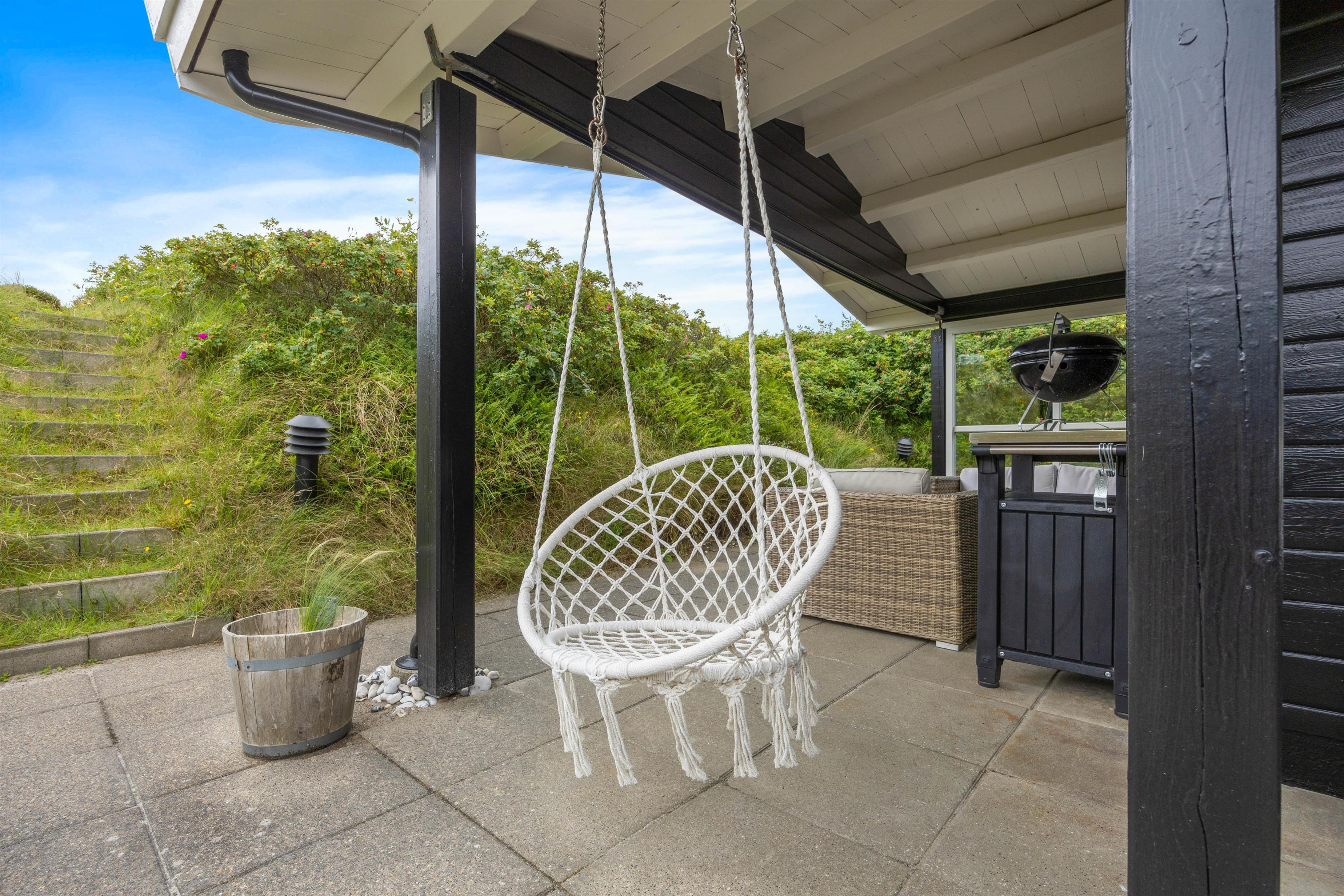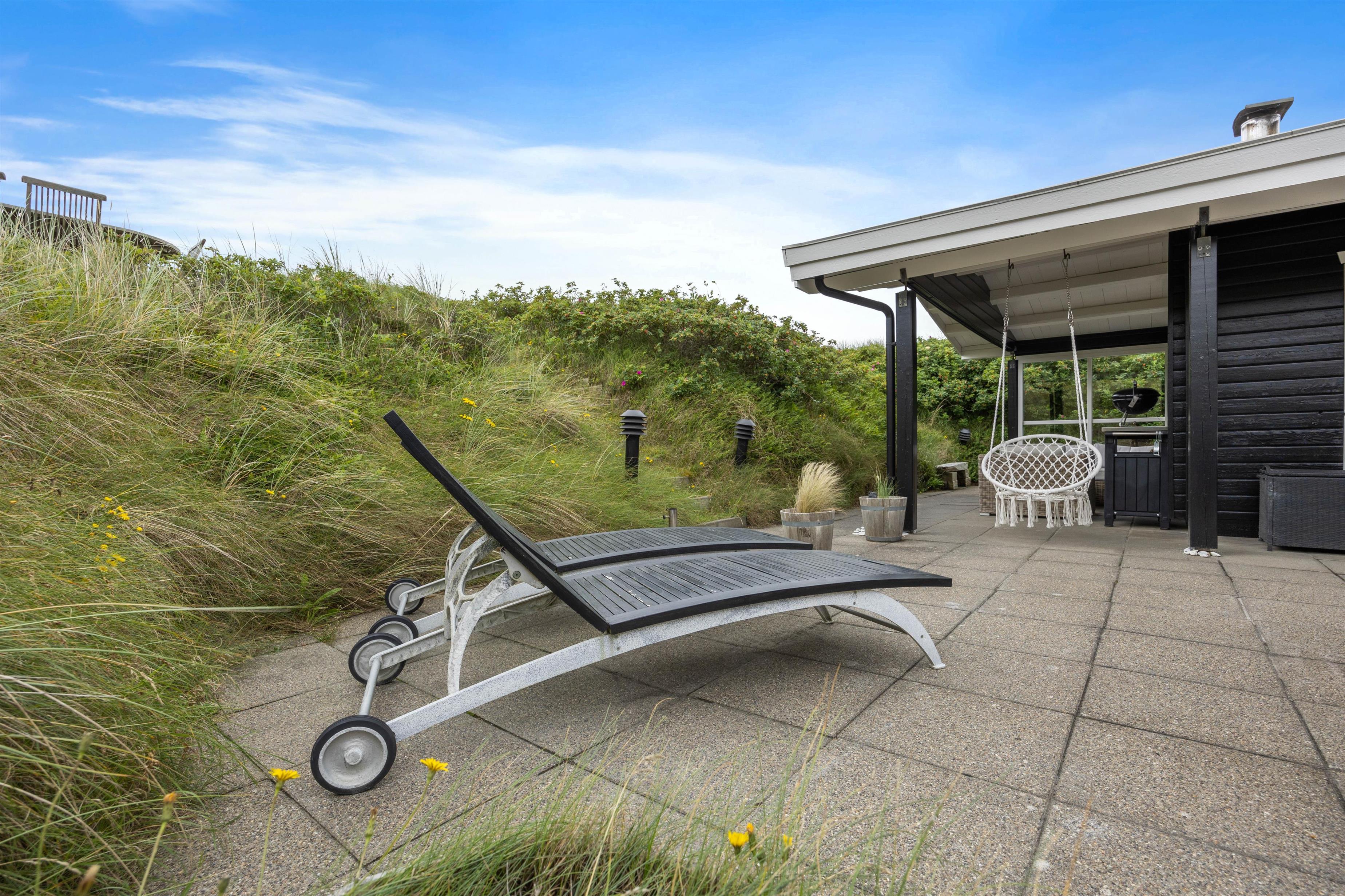 Husets største terrasse mod syd er godt i læ af klitten og huset, så her vil I nemt kunne finde en lækrog, og skulle der falde en dråbe sommerregn kan I krybe ind i læ i loungemøblerne på den overdækkede terrasse.
