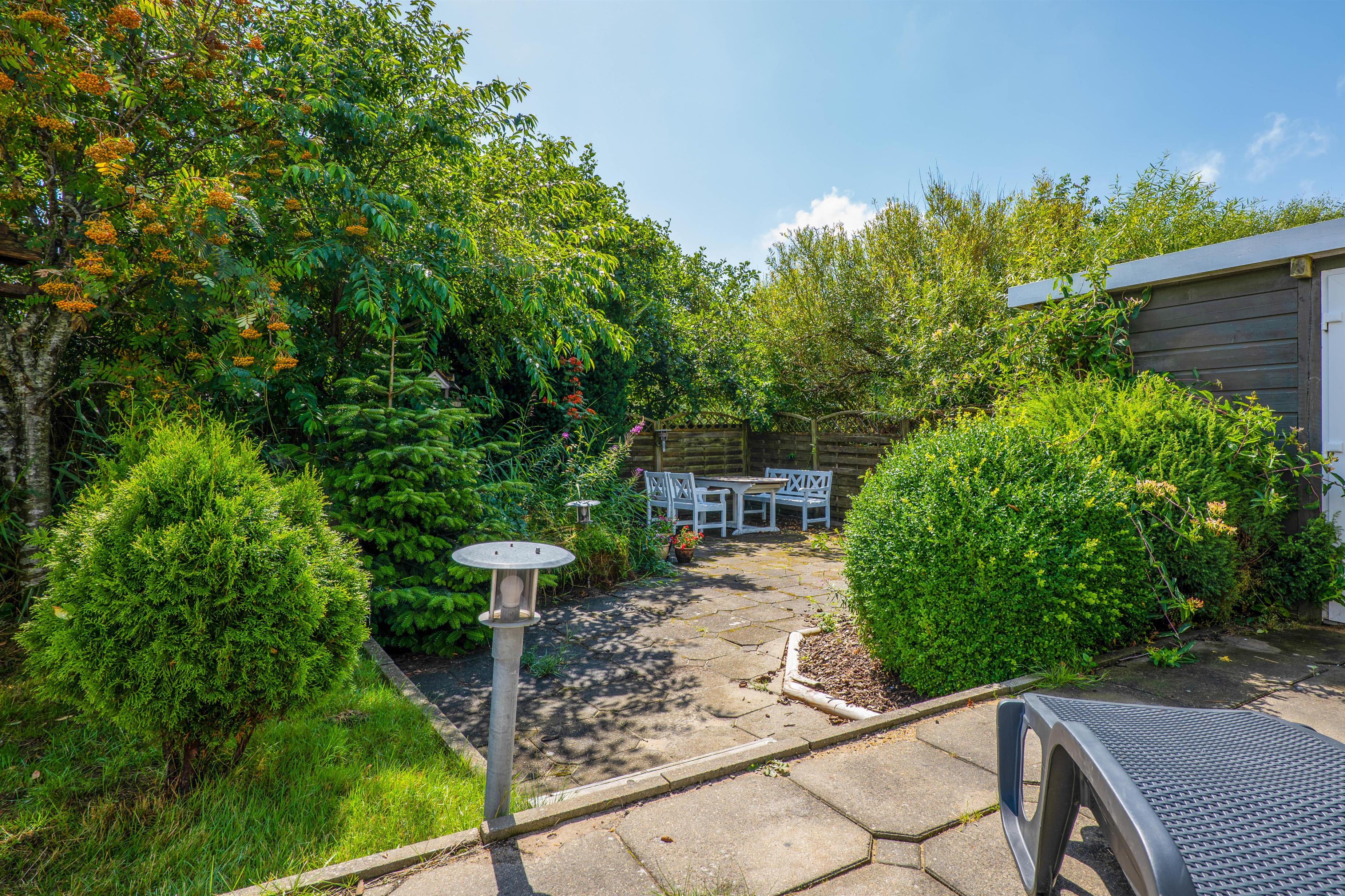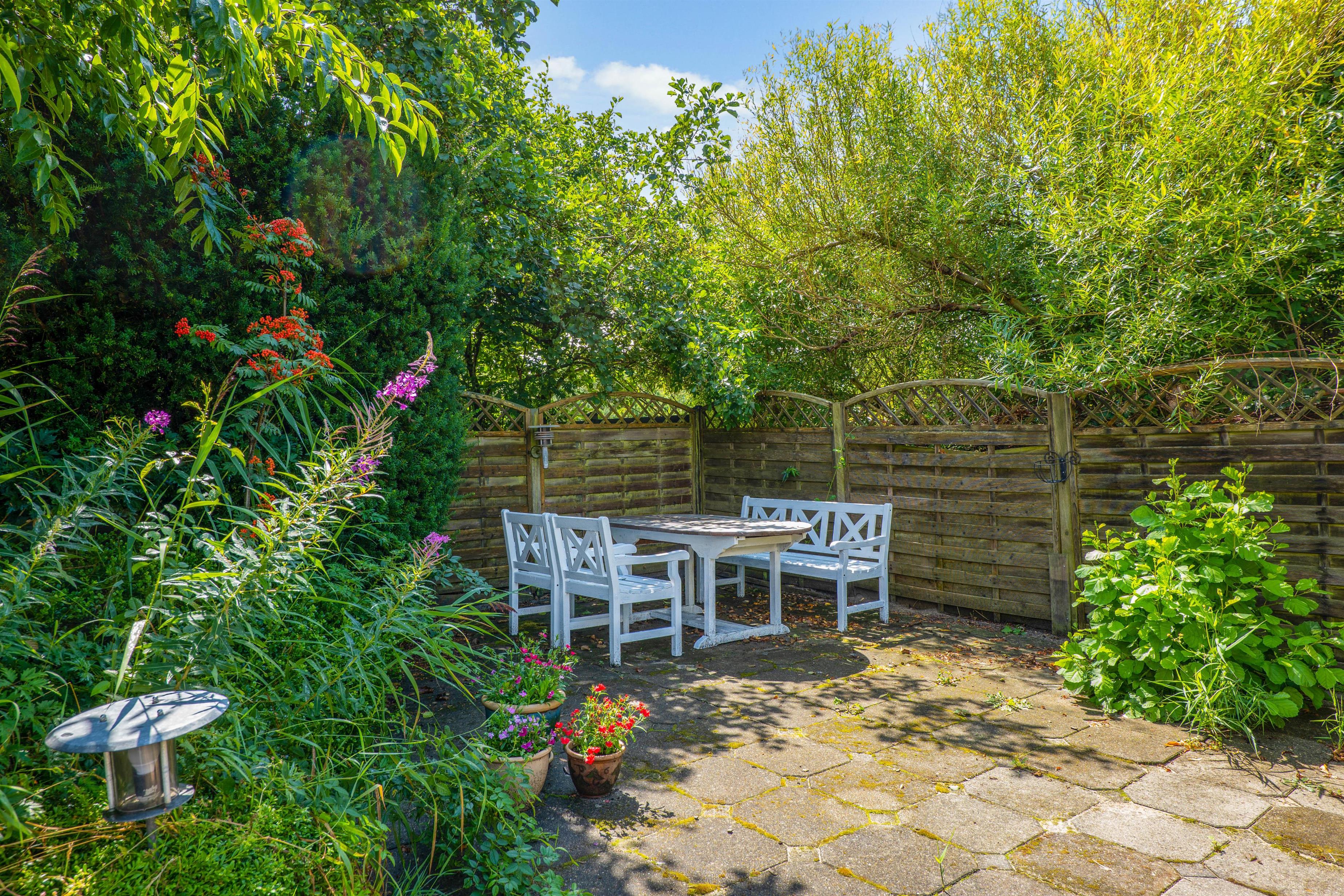 Udover den lukkede terrasse mod vest er der også 2 terrasser mod syd. Den ene terrasse er en sænket terrasse, der ligger på den sydvestlige del af grunden. Den anden terrasse ligger ved sommerhuset, og den strækker sig også til østsiden af sommerhuset, så her kan I nyde solen det meste af dagen, allerede fra morgenstunden.