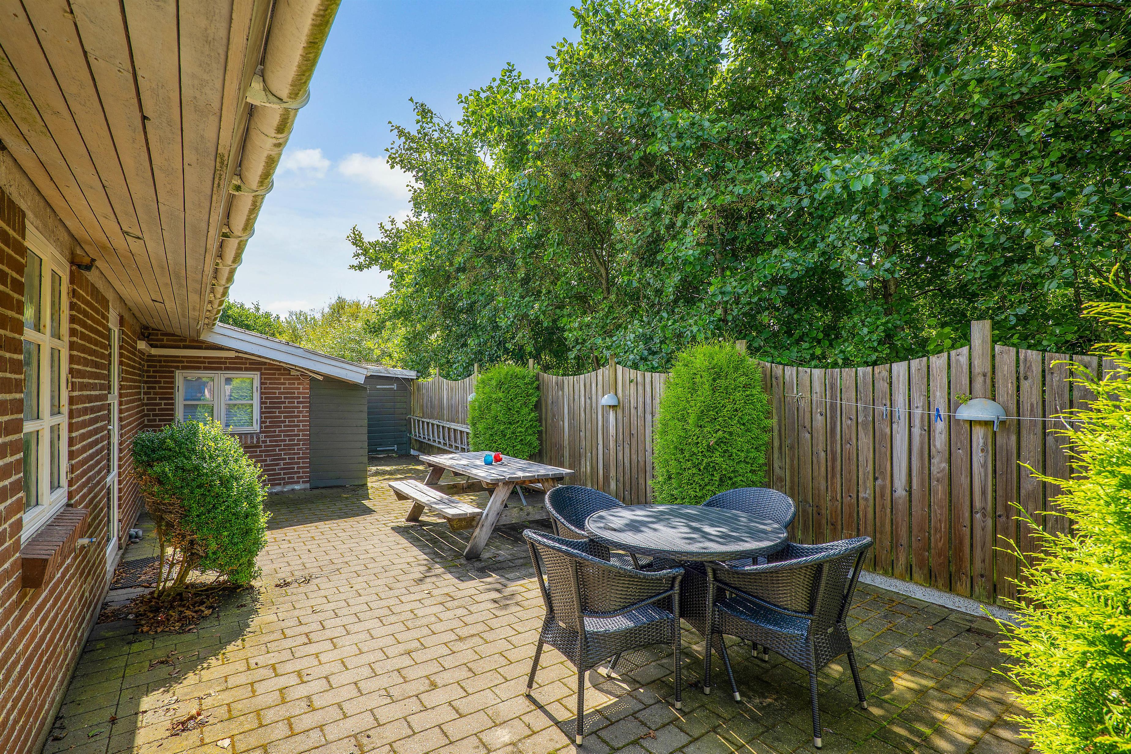 Omkring sommerhuset finder I flere terrasser, som I kan tilbringe feriens solrige og varme dage på. Mod vest har I en lukket terrasse, der er godt beskyttet mod vind, og som også giver alt det privatliv, I kunne ønske jer. På den lukkede terrasse kan I også have hunden med ud, uden at den tager på opdagelse i området.