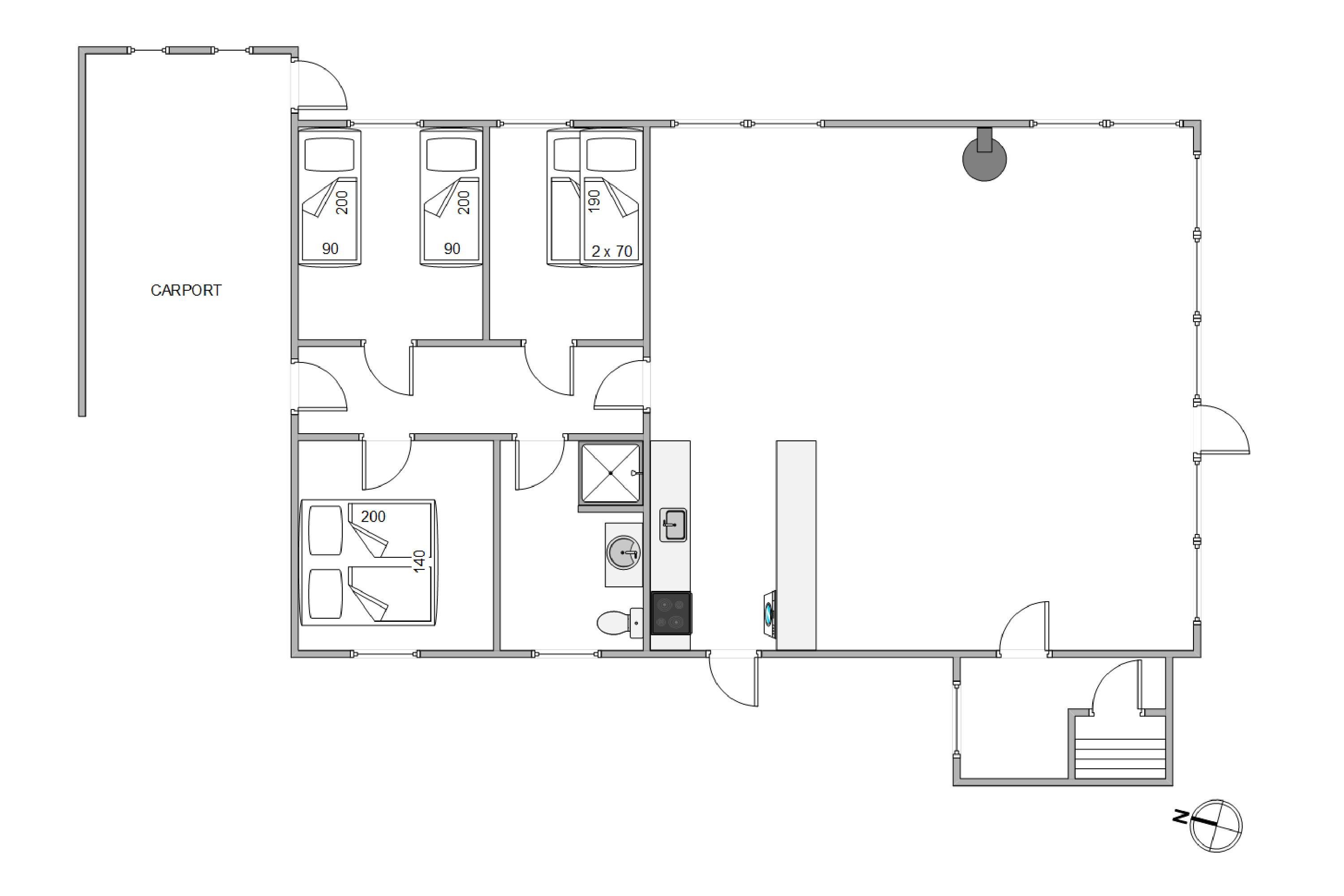 I sommerhuset er de 6 sovepladser fordelt på 3 soveværelser, der alle er belagt med gulvtæppe. På det ene soveværelse er der en dobbeltseng, på det andet er der 2 enkeltsenge, og på det tredje soveværelse er der en køjeseng. Desuden er der 1 badeværelse i sommerhuset, som er udstyret med gulvvarme og en lille sauna.