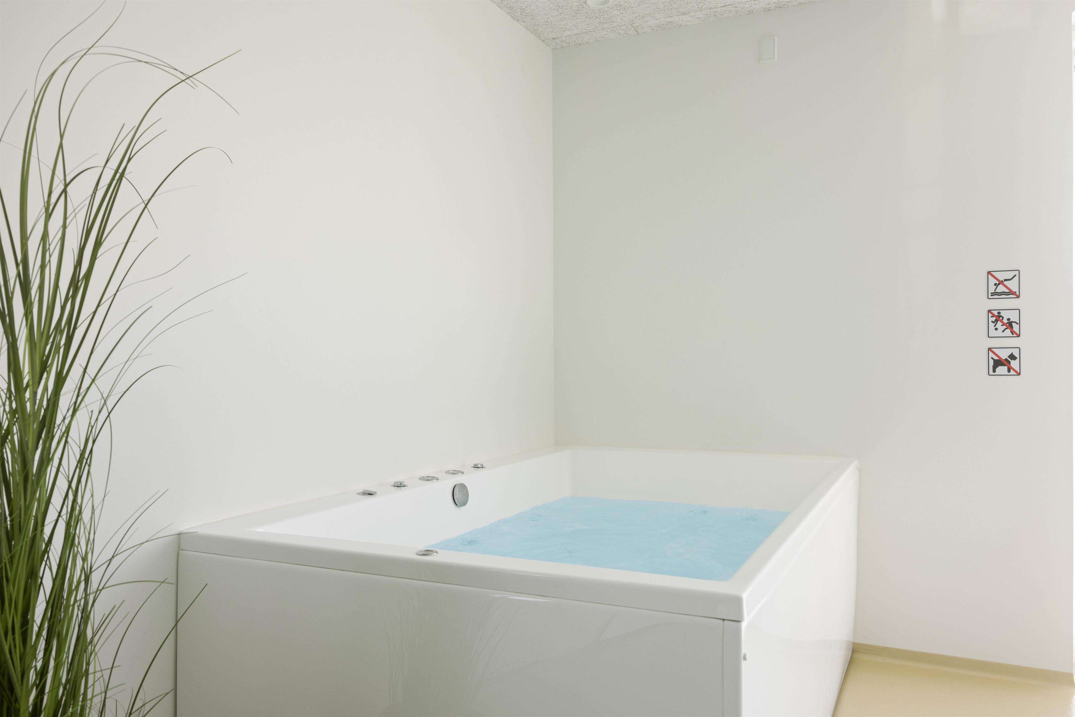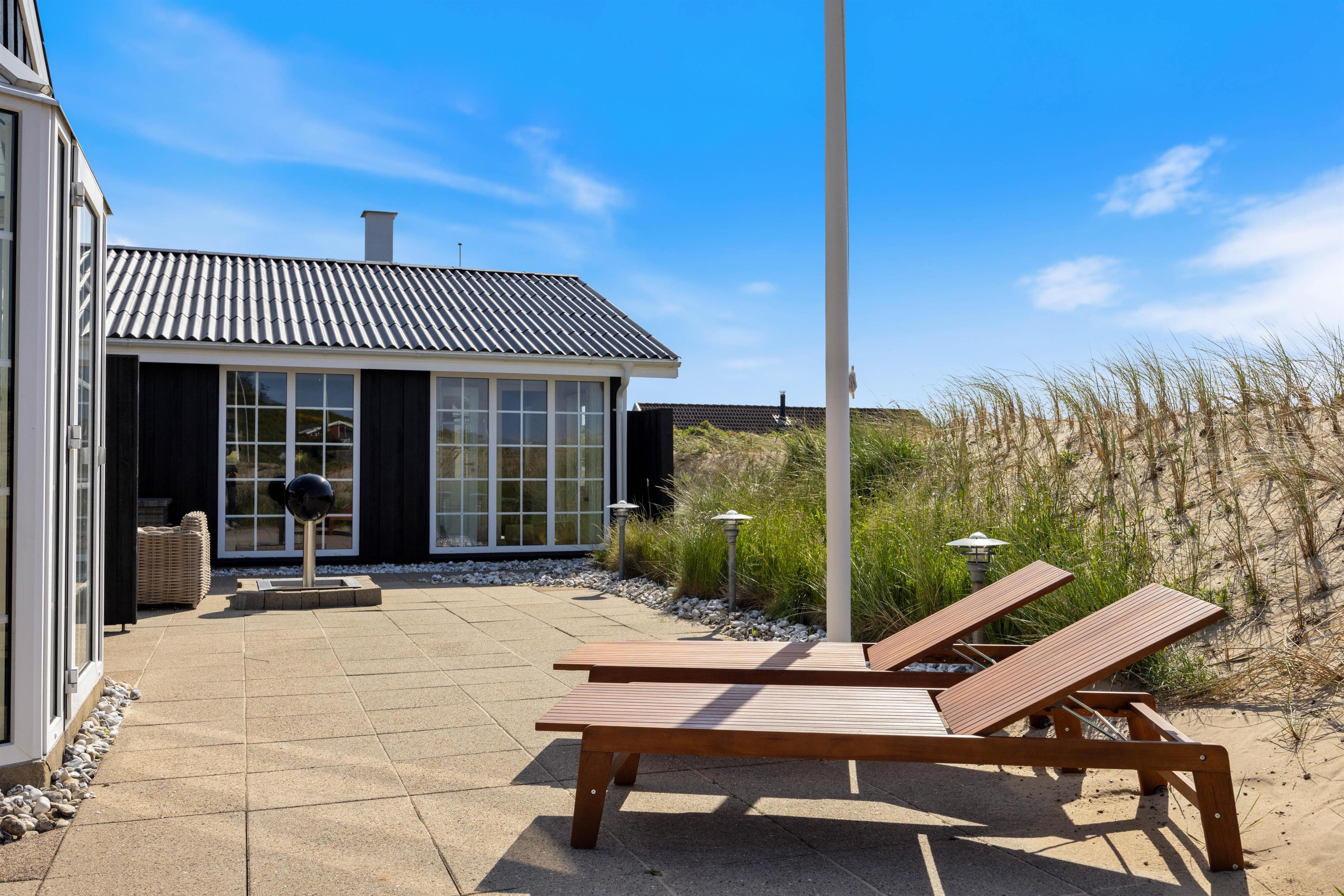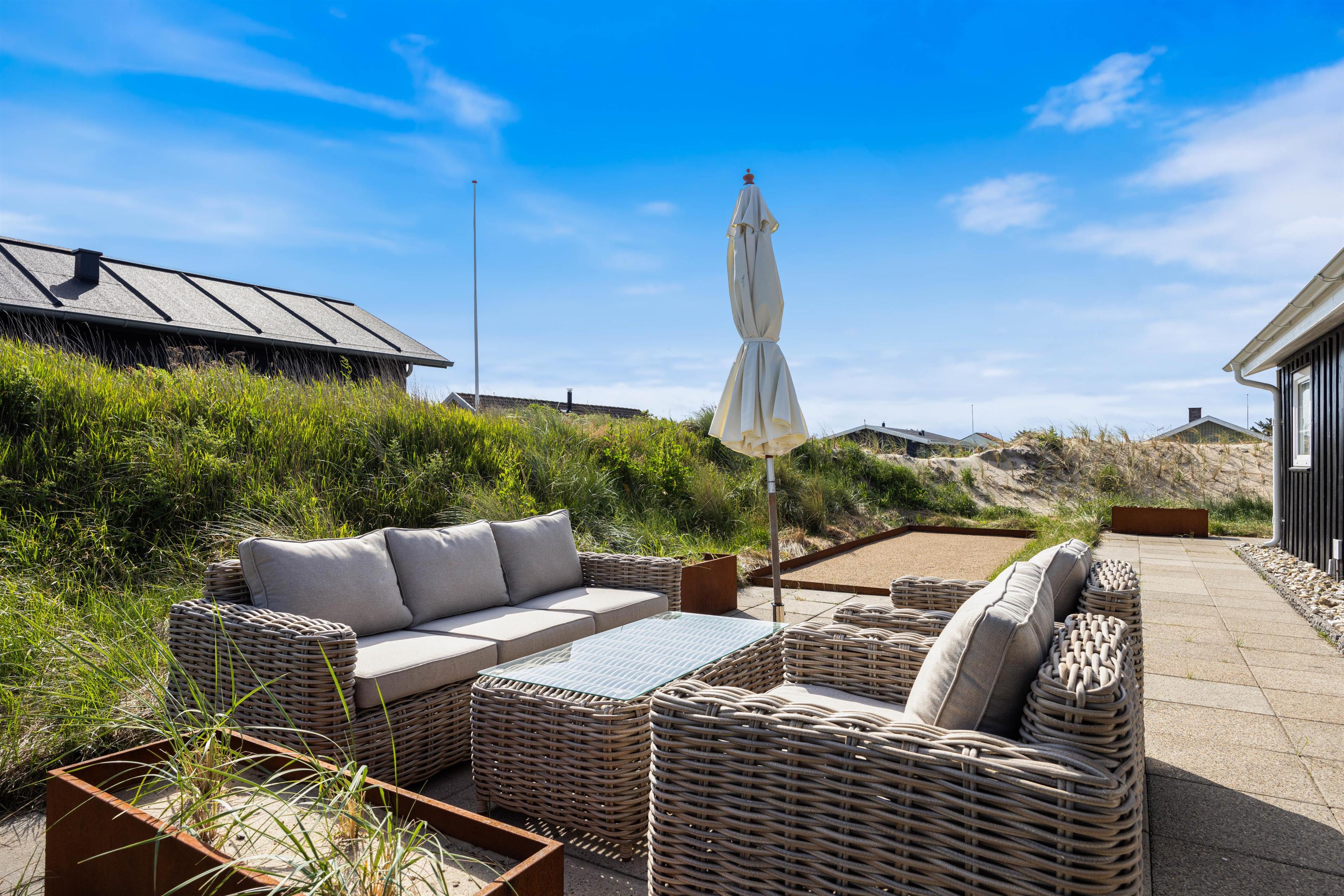 Det er ikke kun indvendigt, at sommerhuset på Nordsøvej 40 imponerer. Her er der nemlig flere forskellige terrasser og loungemøbler, hvilket sikrer, at I uanset vindretning og tidspunkt på dagen, på solrige dage kan finde et spot, hvor I kan få lidt D-vitamin. Som et ekstra lille plus har sommerhuset også en udendørs bruser med både varmt og koldt vand til et koldt gys, som I kan benytte fra maj til og med oktober. Der er direkte adgang til udebruseren og liggestolen fra husets fantastiske poolafdeling