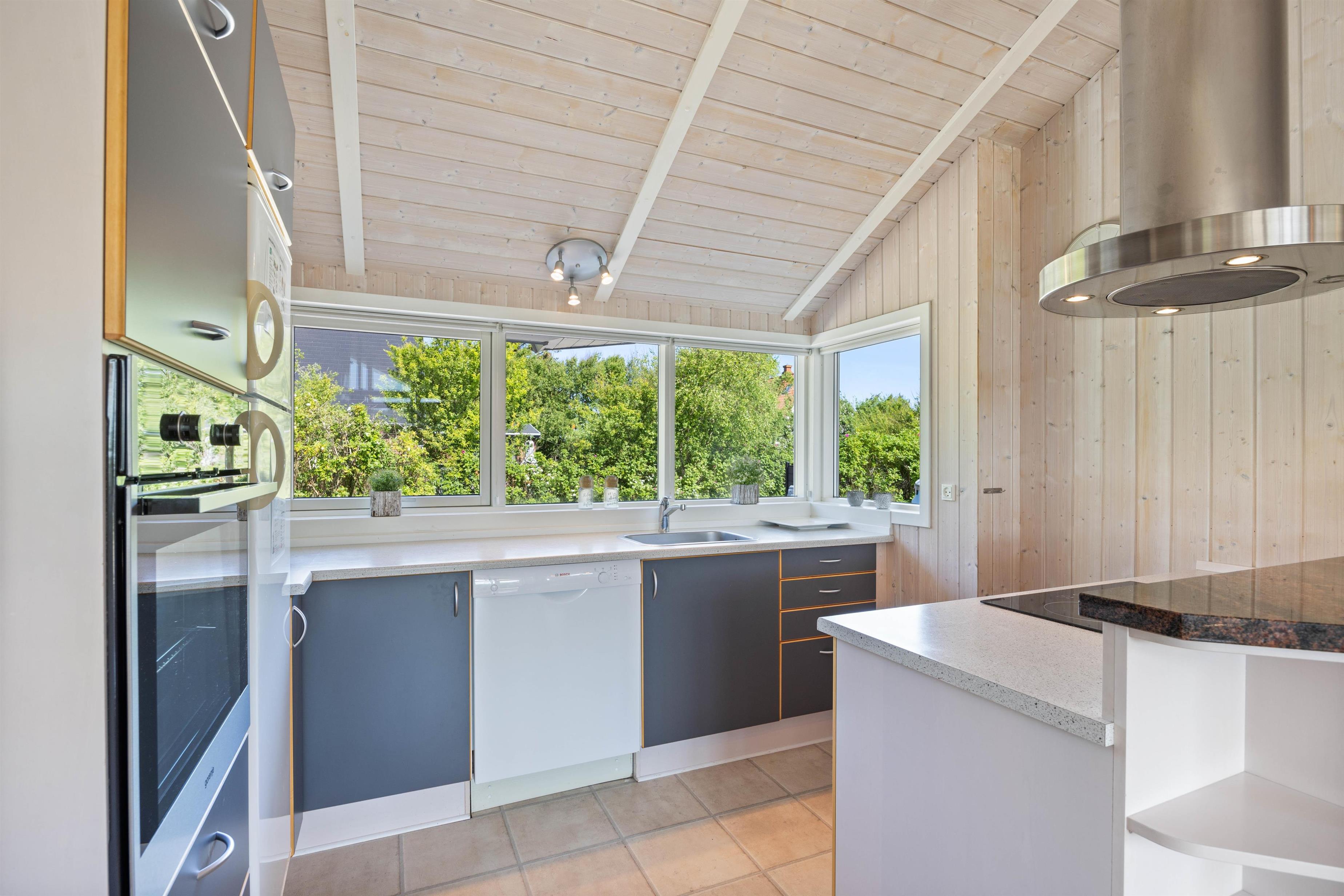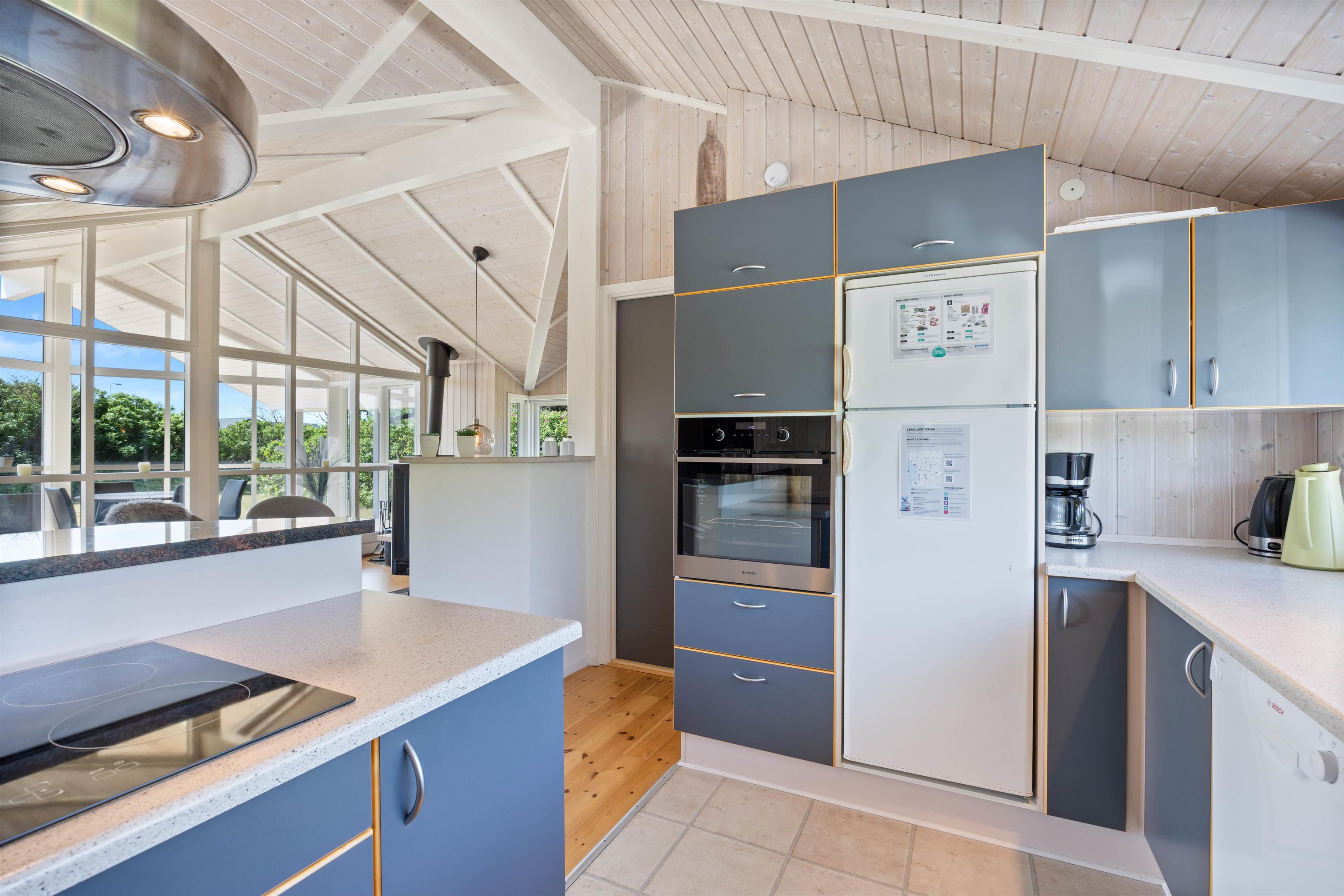 Feriehusets hjerterum er uden tvivl det funktionelle køkken, der ligger i åben forbindelse med stuen, hvor hele familien kan samles til ferieplanlægning og hygge. Spise-/opholdsstuen er med loft til kip og har store vinduespartier, hvilket giver en fantastisk rumfornemmelse. På de koldere feriedage er det oplagt at tænde op i brændeovnen, og mærke varmen brede sig i hele sommerhuset. Er brændeovnen ikke i gang, kan i benytte jer af den energibesparende luft-til-luft varmepumpe, der sørger for et godt indeklima hele året rundt.