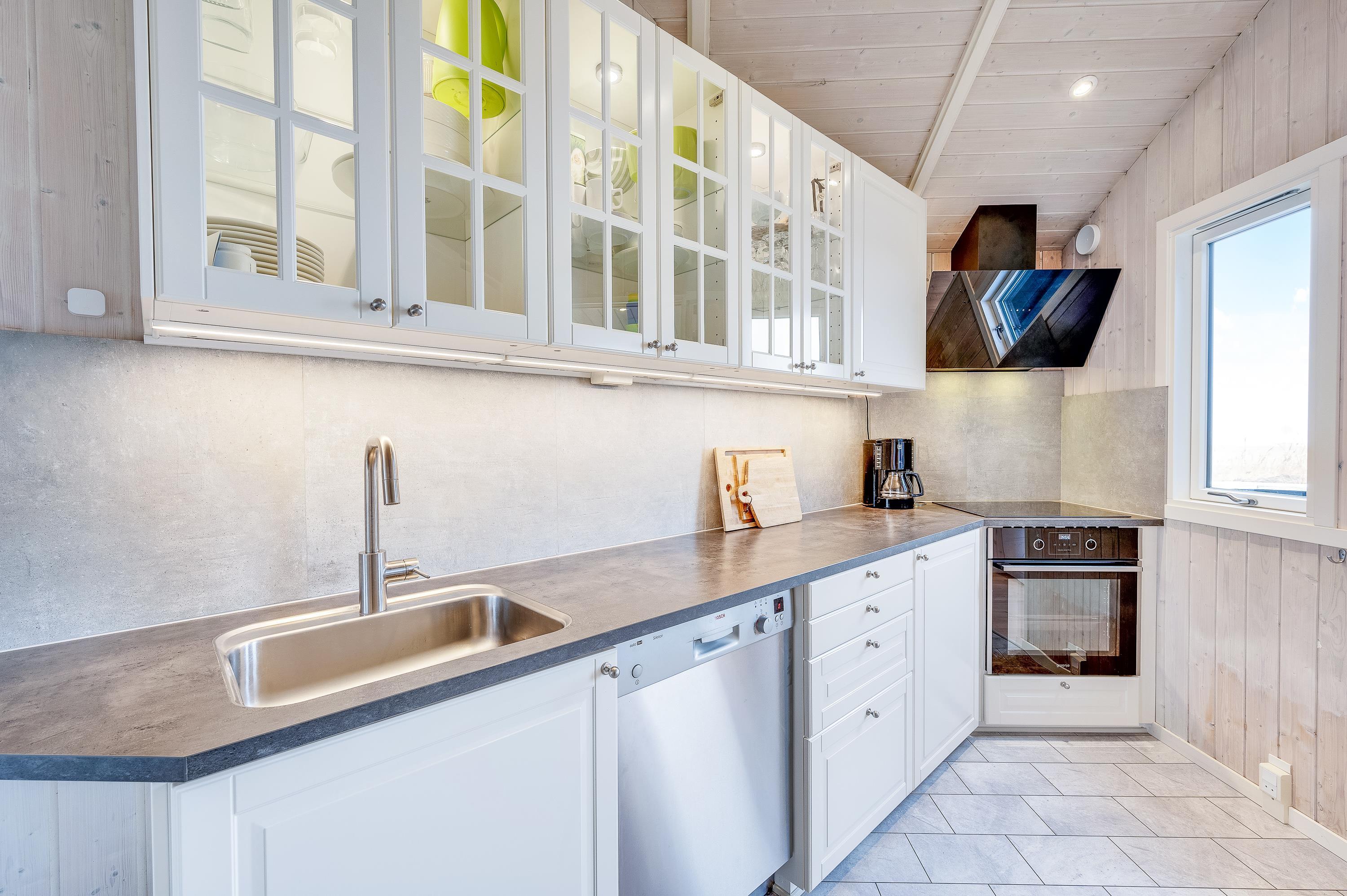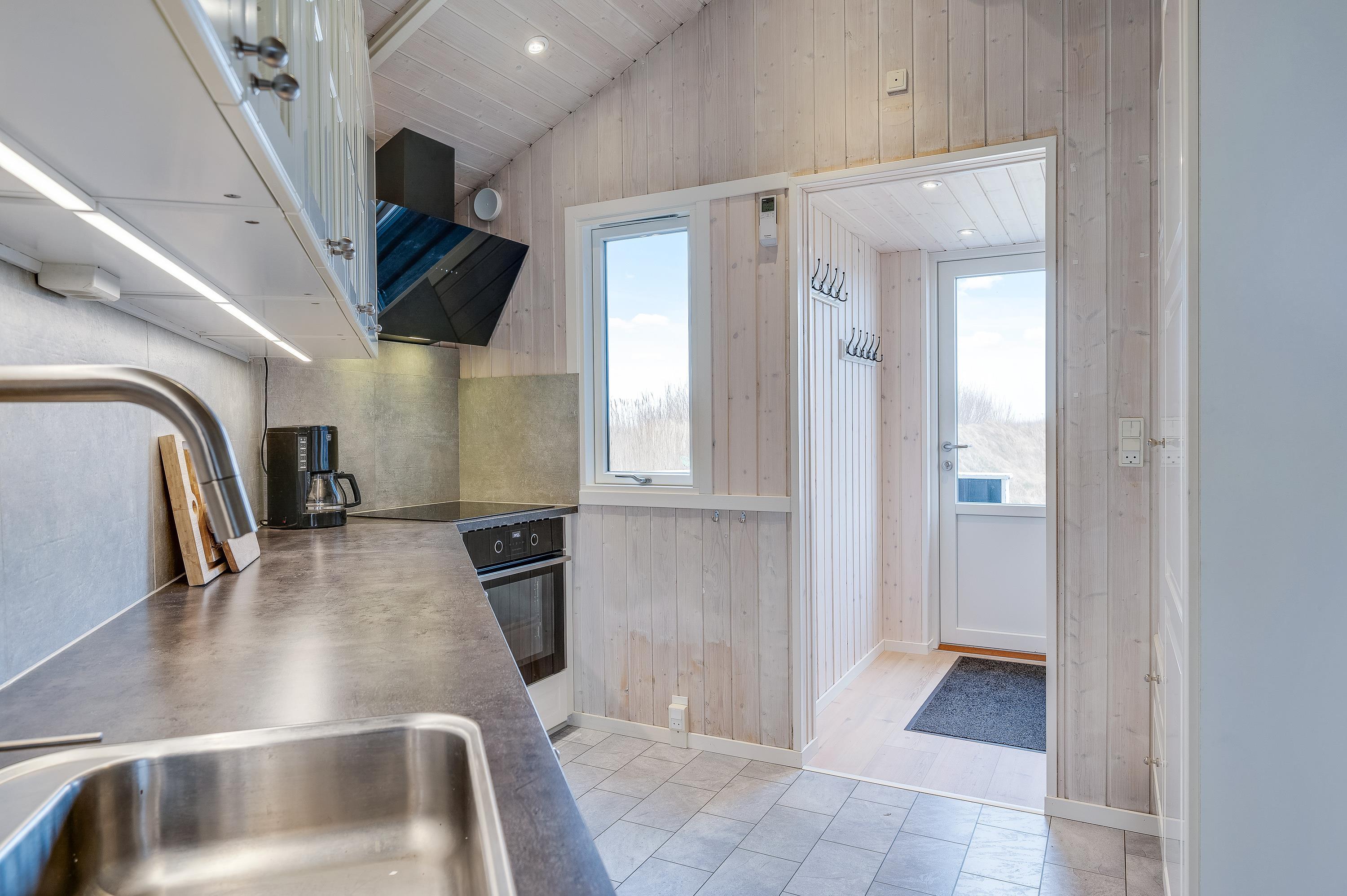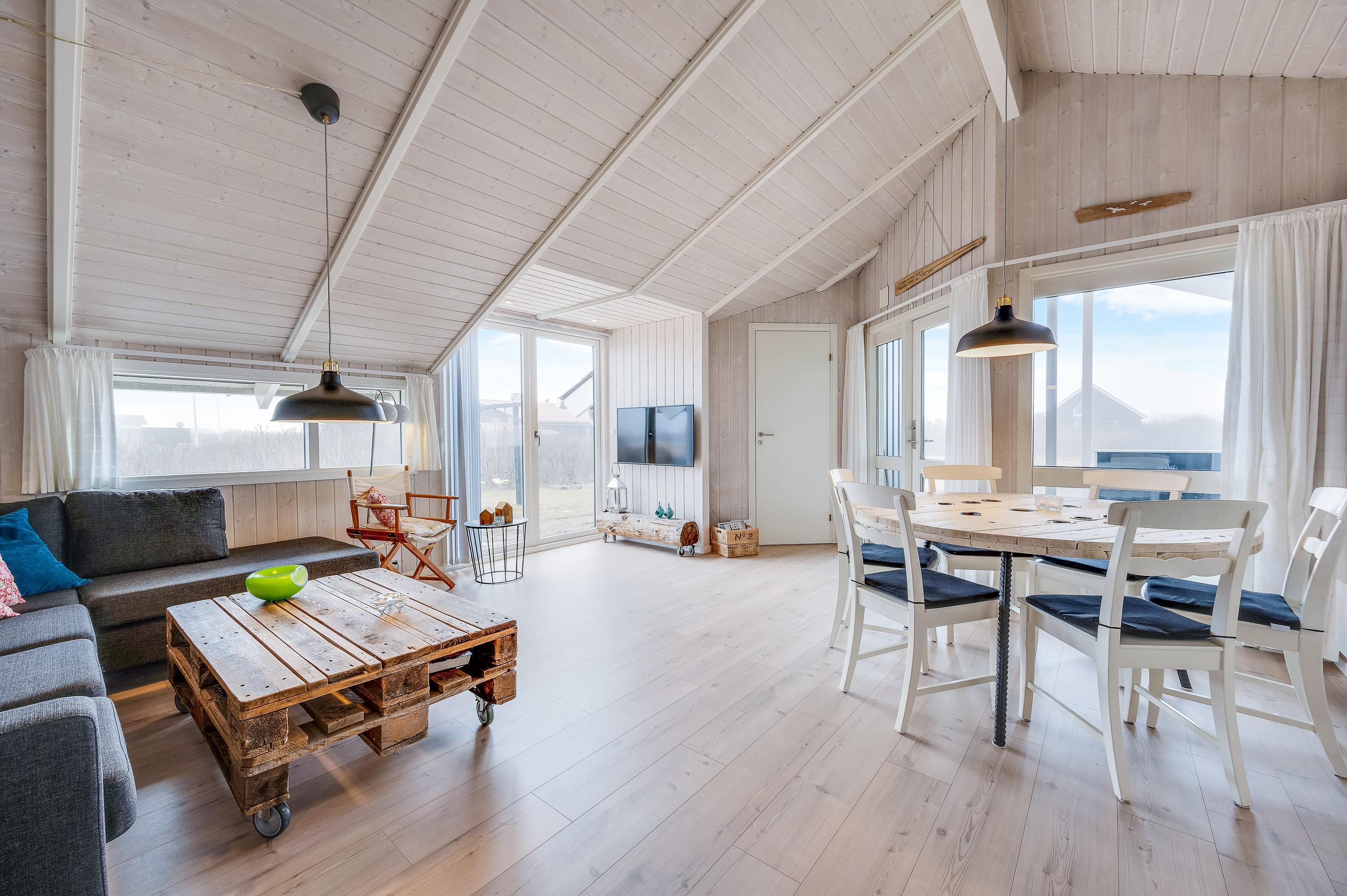 I dette hyggelige og stemningsfulde sommerhus med dets lyse træværk og naturfarver, vil I straks føle jer hjemme og komme i den rette feriestemning. Her er der tænkt over detaljerne og ikke sparet på noget: energibesparende varmepumpe, gratis lynhurtig internetforbindelse samt gratis vaskemaskine. Og i det moderne køkken koges og brases der på induktionskomfur, mens opvasken klares af opvaskemaskinen.