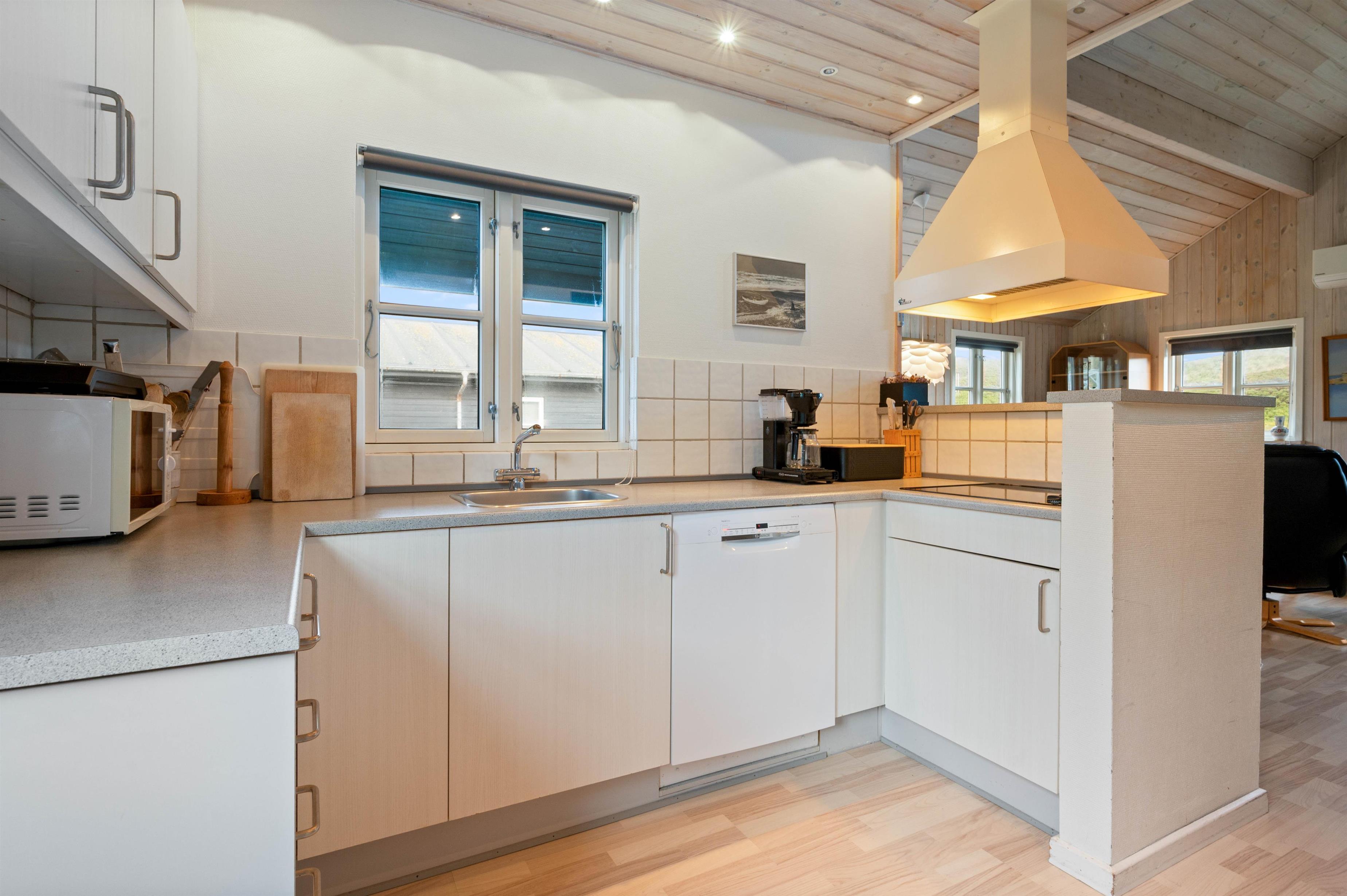 For enden af en stille, blind vej ligger dette skønne sommerhus, der med sin unikke placering har Vesterhavet som nabo. Huset fremstår lyst og indbydende med stue og spiseafdeling, der står i åben forbindelse med køkkenet. Køkkenet er pænt og funktionelt og udstyret med opvaskemaskine, mikroovn og køleskab med 40 liters frysekapacitet.