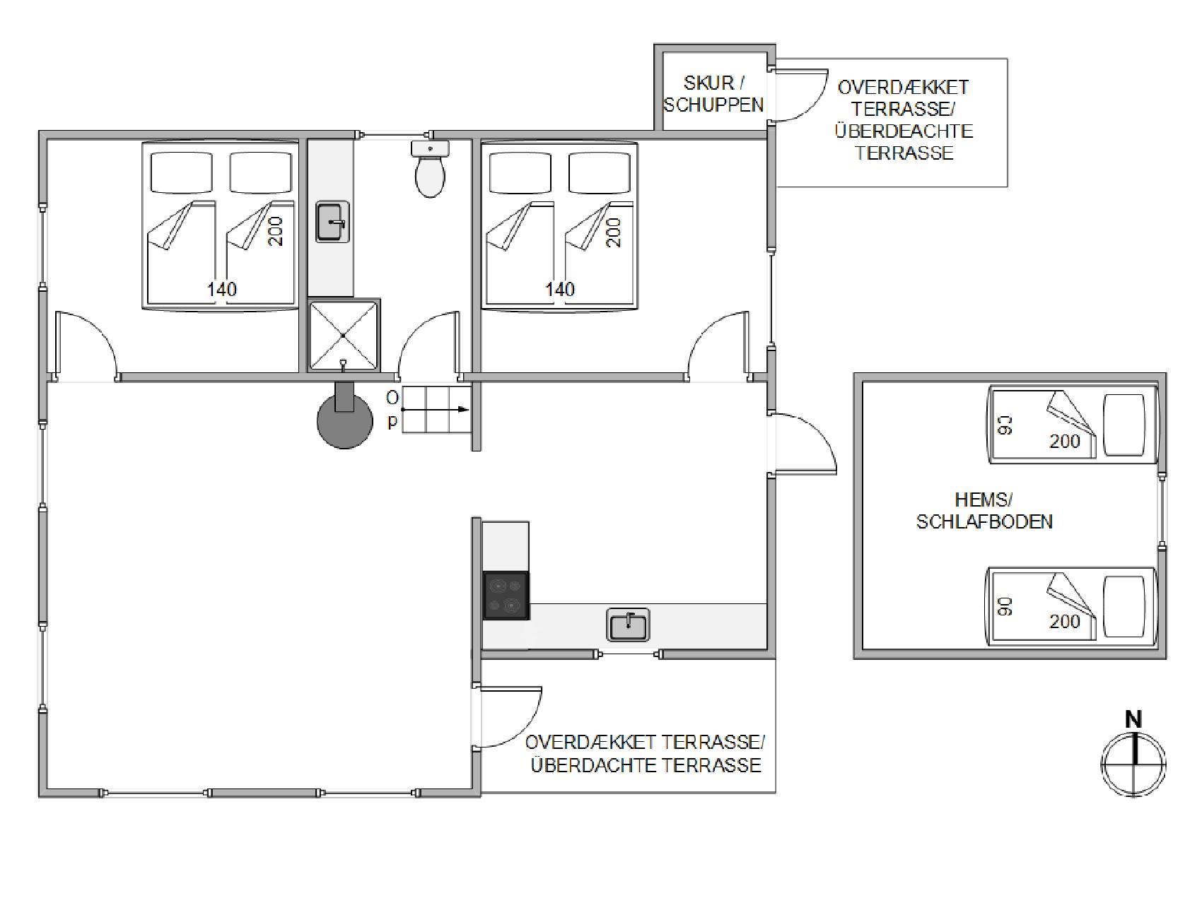 Sommerhuset råder over to gode soveværelser, der begge er indrettet med komfortable dobbeltsenge. Herudover er der en hems med yderligere to sengepladser. Disse sengepladser vil med garanti være i høj kurs hos familiens yngste. I finder desuden et flot og lyst badeværelse med bruseniche og vaskemaskine på adressen.