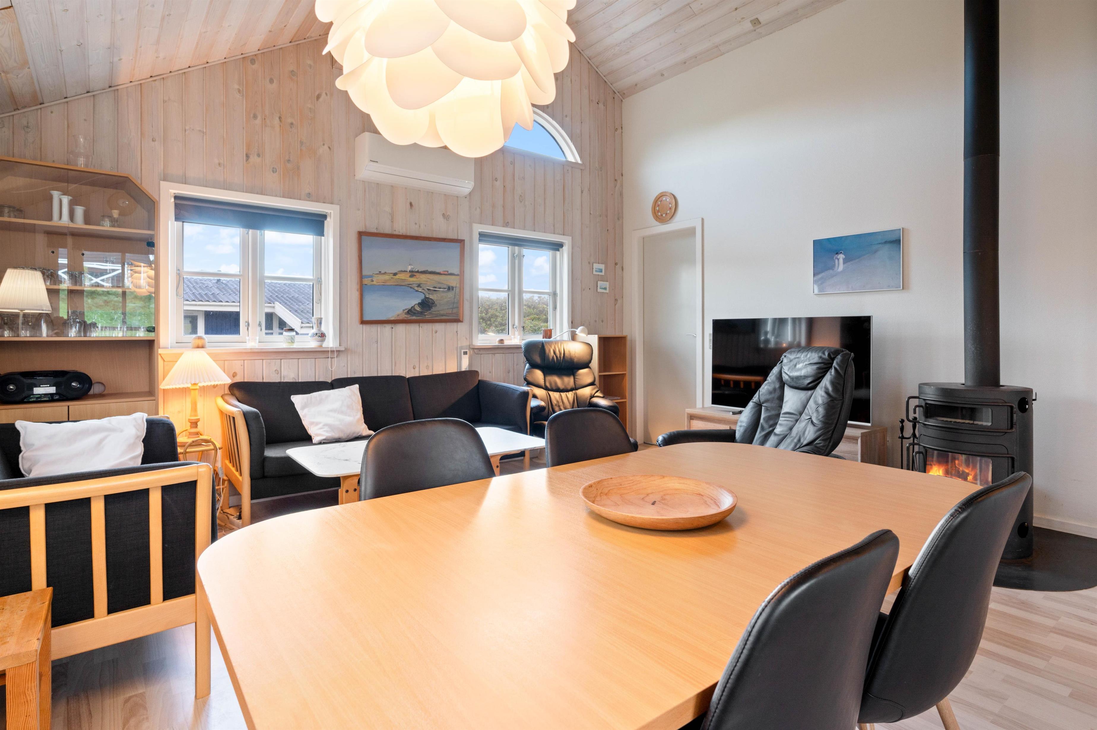 Det store opholdsrum virker venligt og rummeligt, hvilket blandt andet skyldes det høje loft til kip og de lyse lofter og vægge, der skaber en dejlig atmosfære. Centralt placeret i stuen står brændeovnen, der skaber ekstra hygge i de mørke aftentimer. I stuen finder I behagelige sofaer og lænestole, der indbyder til at I smækker benene op med en god bog i hånden. Derudover kan I tænde for tv’et med parabolantenne eller streame jeres helt egen film over chromecasten.