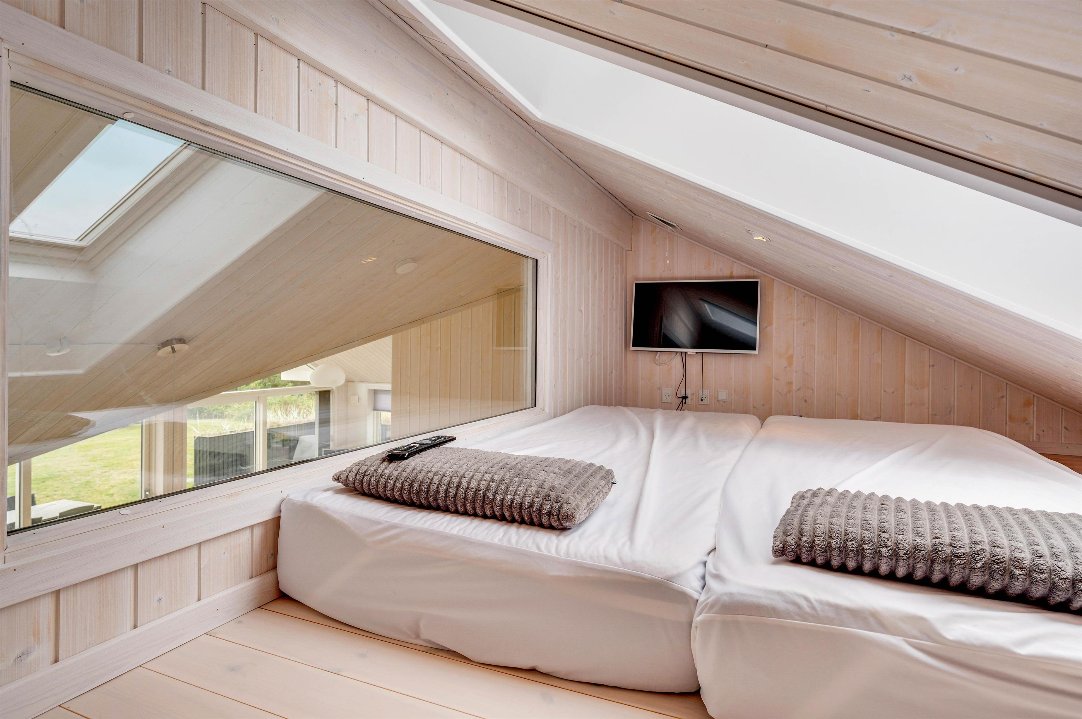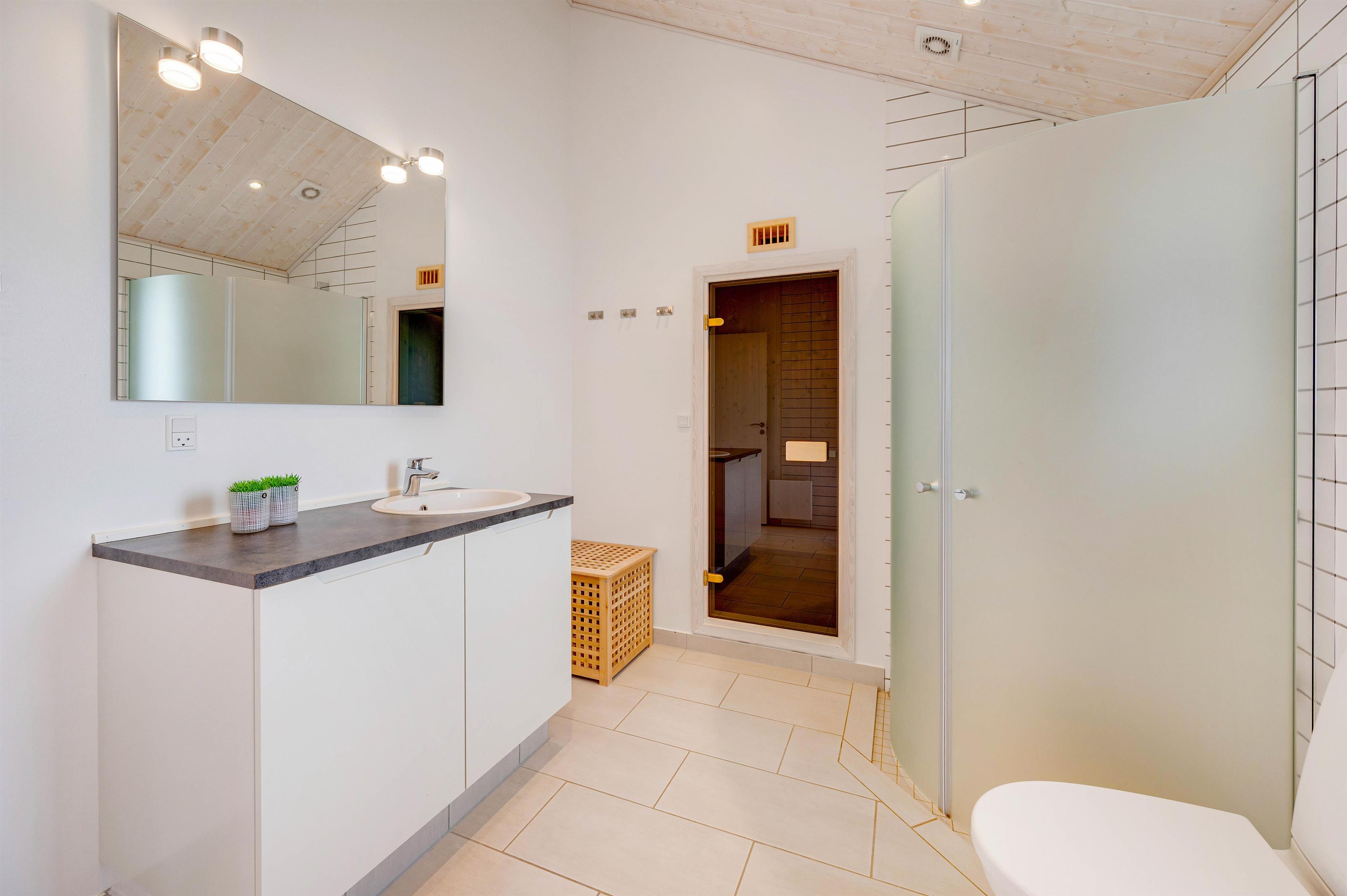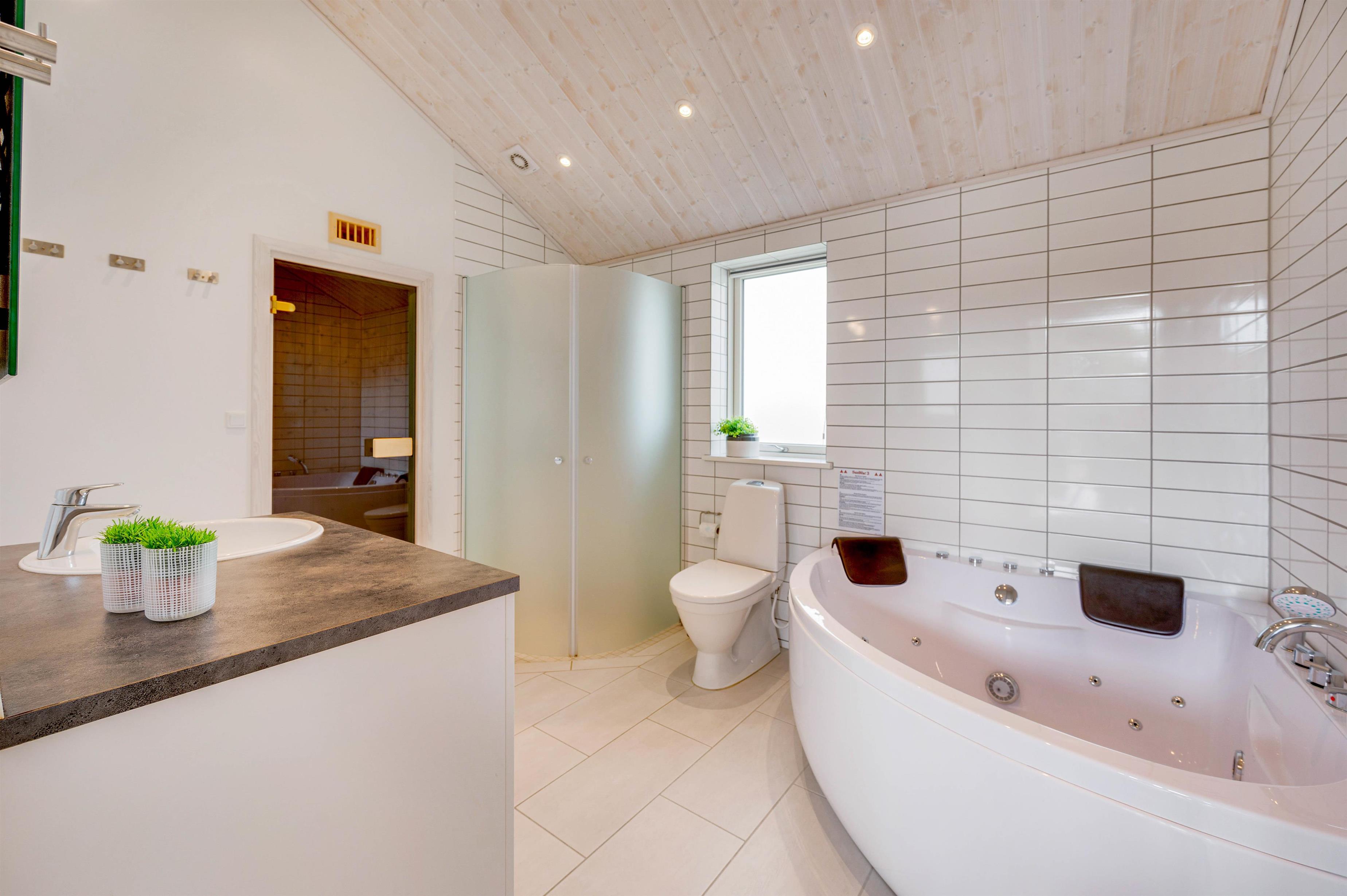 På det største af to badeværelser finder I både et spabad og en sauna, som sætter prikken over i'et på den gennemførte ferie. Her kan I rigtig forkæle jer selv og hinanden i varmen og nyde jeres getaway fra hverdagen.