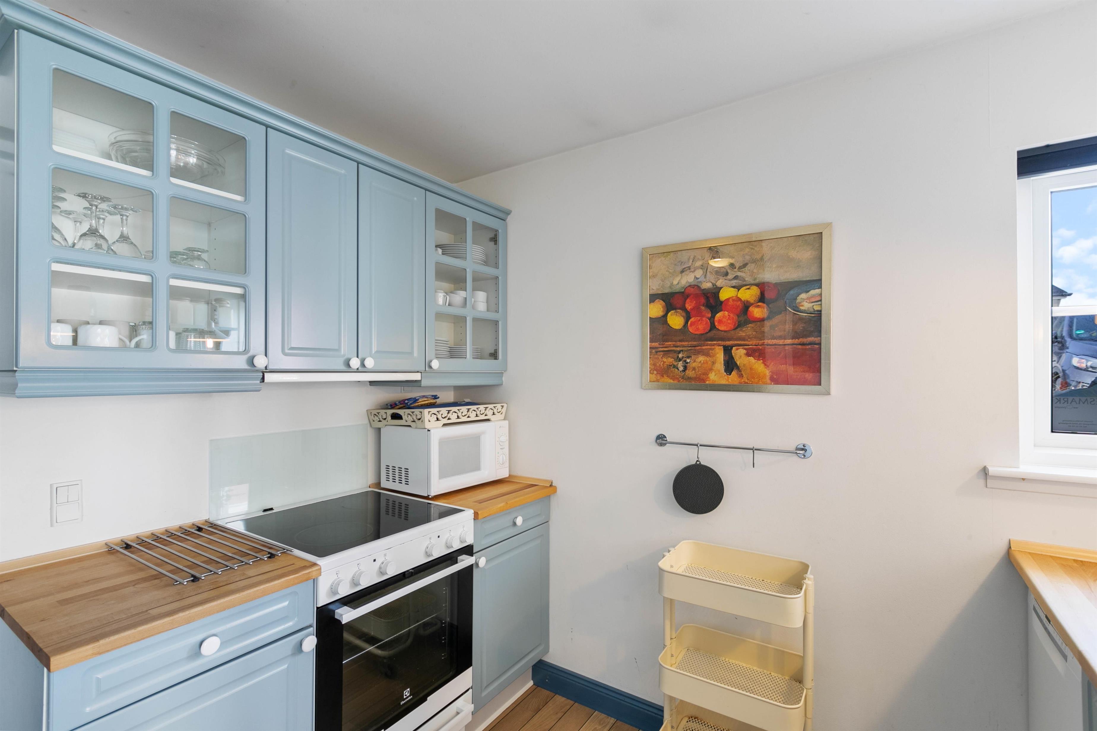 På de koldere feriedage kan det anbefales at tænde op i brændeovnen og nyde varmen der breder sig i hele lejligheden. Når brændeovnen ikke er i gang, kan i benytte jer af den energibesparende luft-til-luft varmepumpe der sørger for et godt indeklima hele året rundt.