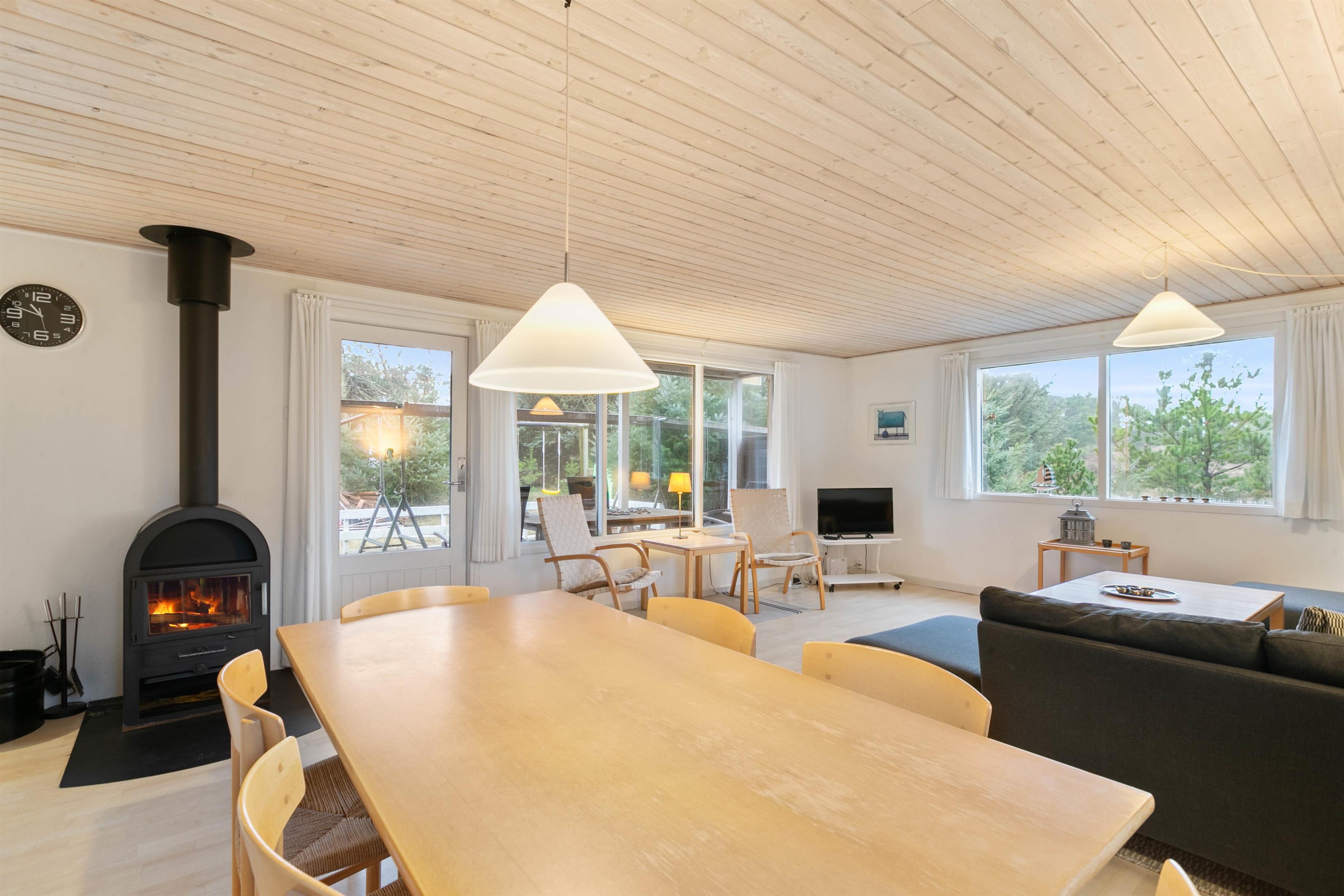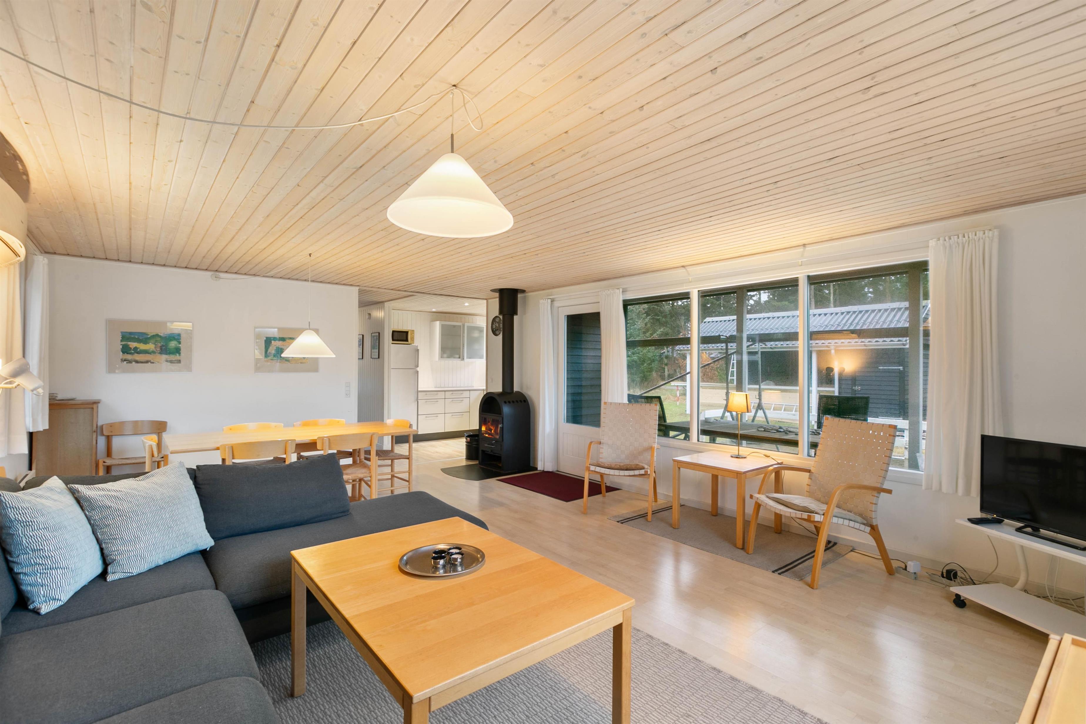 Husets hjerterum er helt sikkert det rummelige og hyggelige køkkenalrum, hvor I for alvor kan nyde kvalitetstid sammen med jeres nærmeste. Den hyggelige stue er udstyret med en brændeovn, som skaber en varm og indbydende atmosfære på kølige aftener. Desuden har sommerhuset en luft til luft varmepumpe, som sørger for et behageligt indeklima året rundt. Med gratis internet kan I holde jer opdaterede eller streame jeres yndlingsserier, lige når det passer jer. Indendørs er sommerhuset veludstyret med moderne bekvemmeligheder, som gør ferien behagelig og bekvem. I køkkenet finder I en opvaskemaskine og en separat fryser på 30 liter, så madlavningen og opbevaringen bliver let.