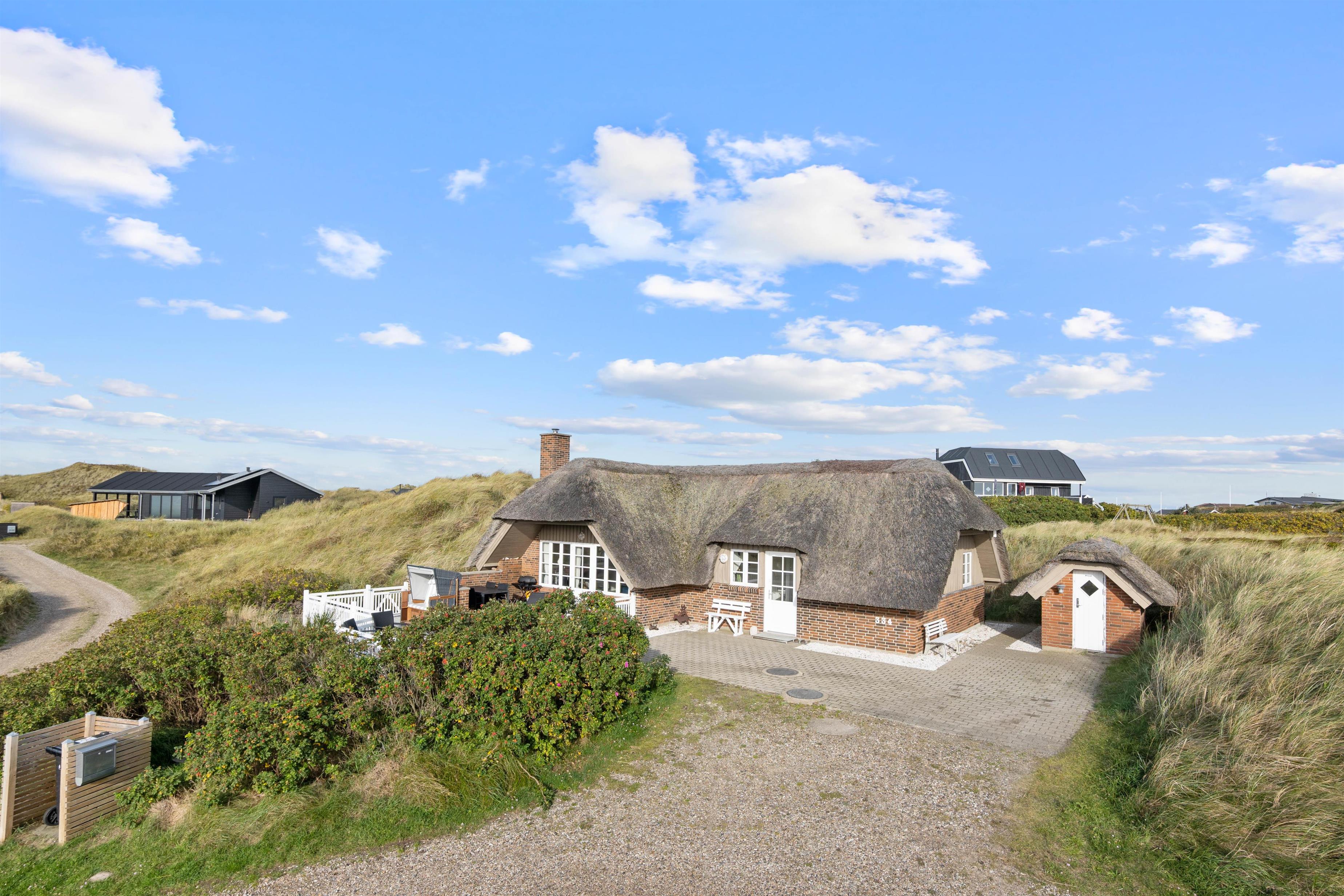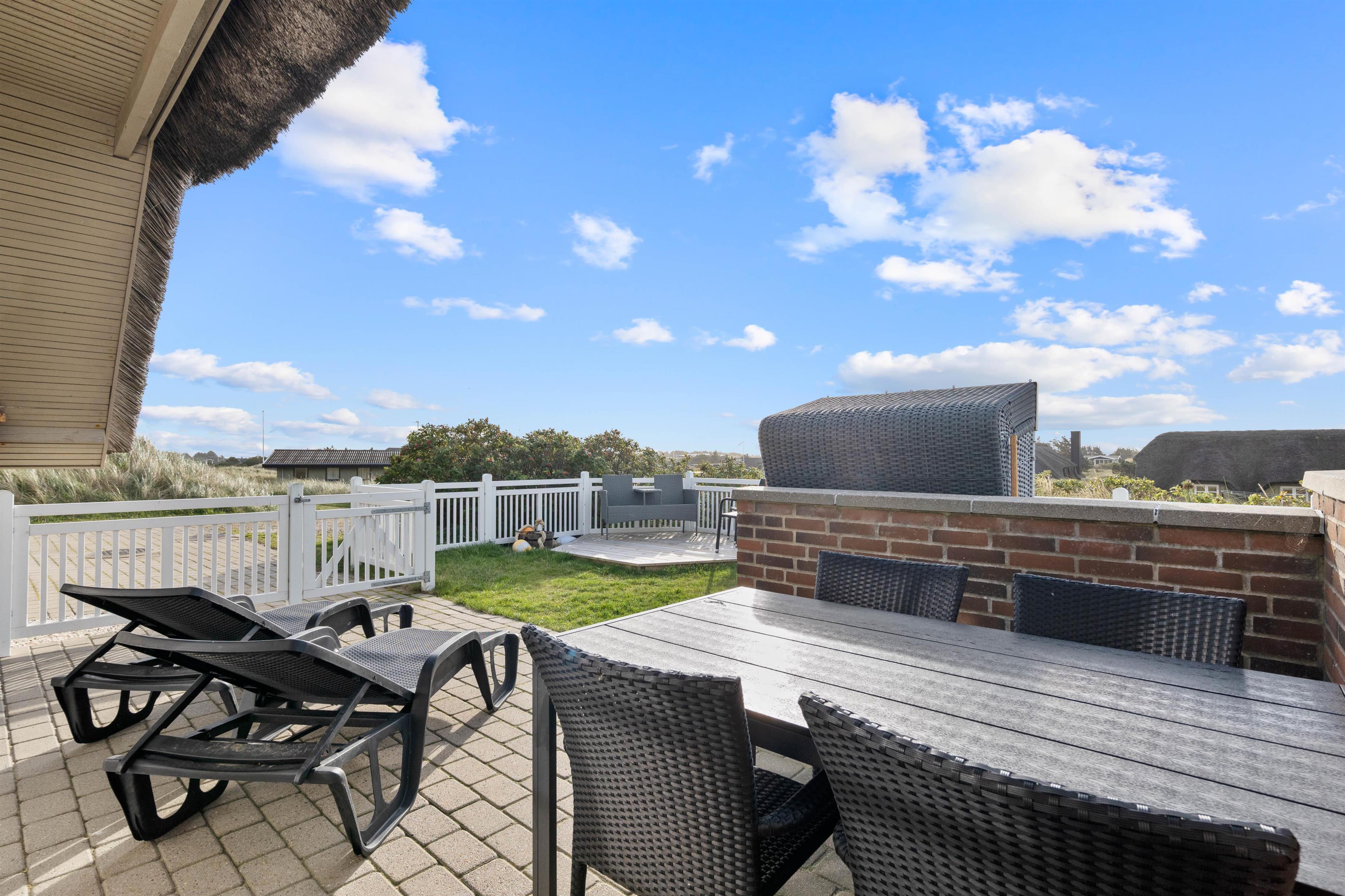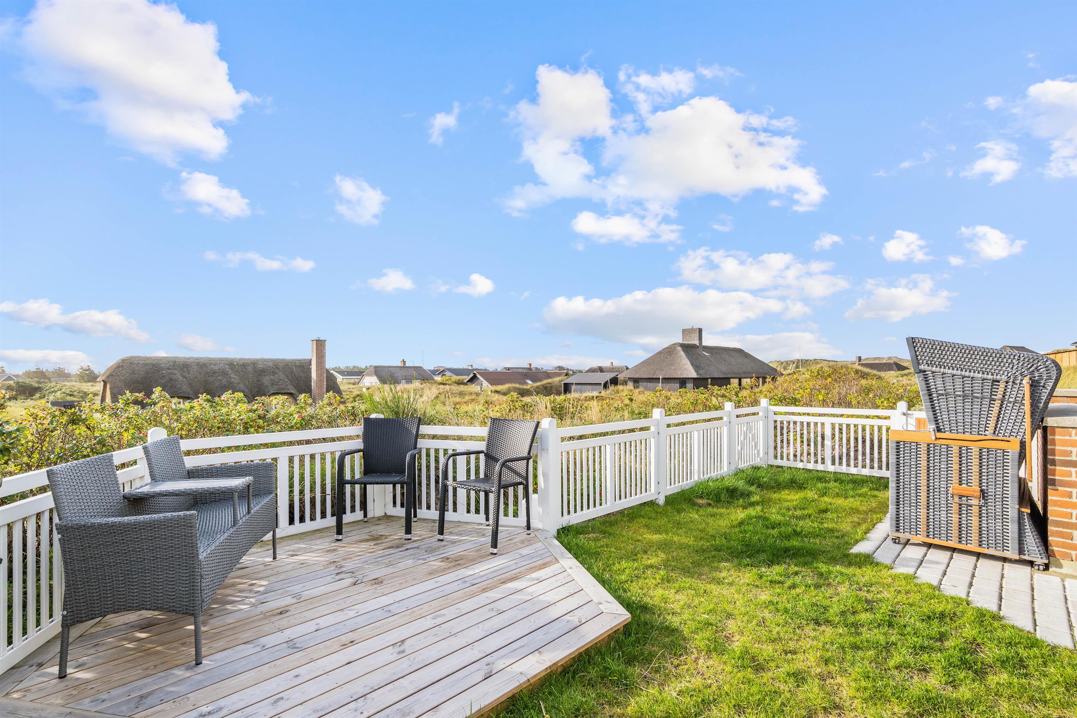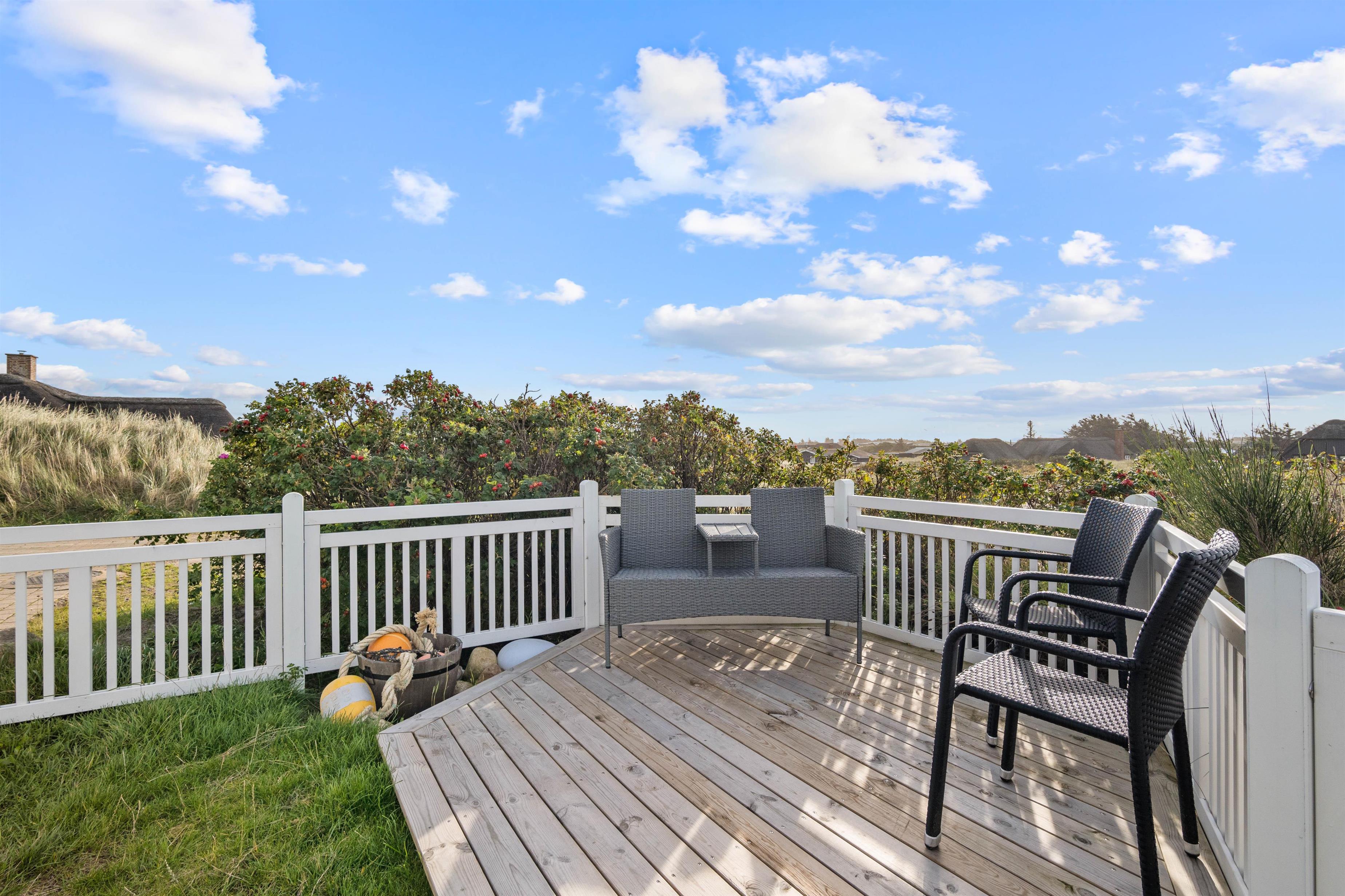 Det hyggelige og stilfuldt indrettede feriehus ligger skønt placeret på en kuperet klitgrund. Bag ved huset går en lille trappe op på en af klitterne og herfra har man en helt utrolig flot udsigt udover den smukke natur. Den lukkede og skønne anlagte terrasse er et dejlligt sted at sidde. Her kan I nyde den friske rene vesterhavsluft ad libitum. Fra huset er der kun 350 meter til Vesterhavet og den smukke lange sandstrand, hvor I kan gå nogle skønne og lange gåture.