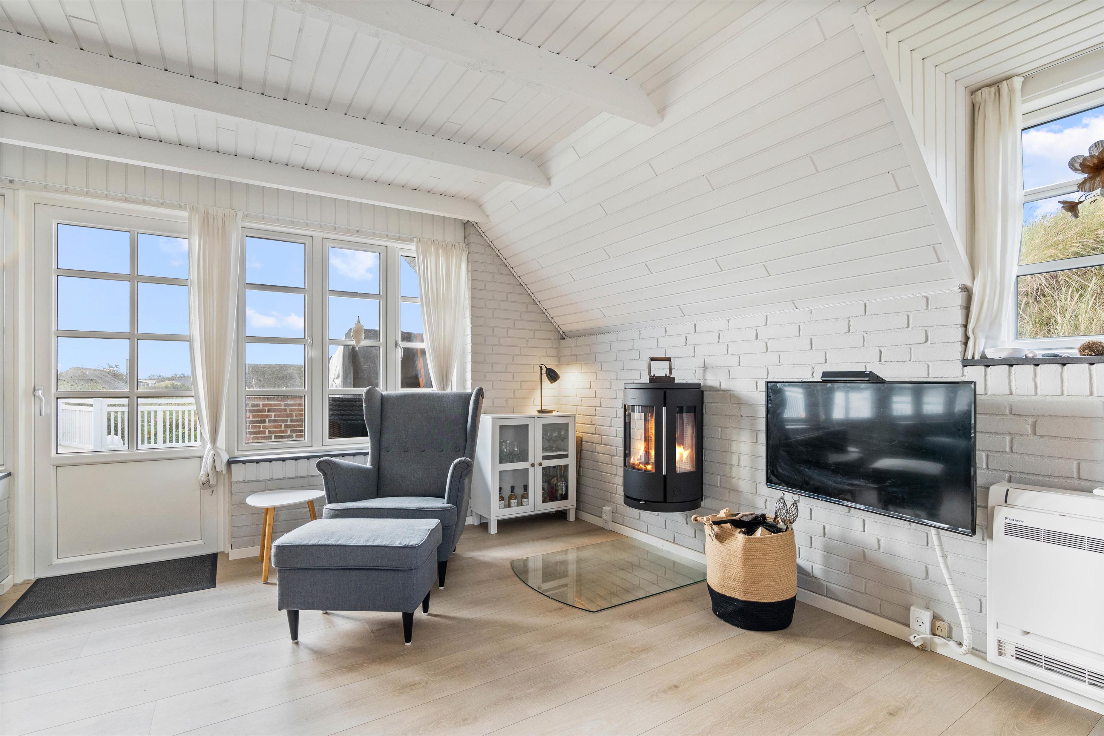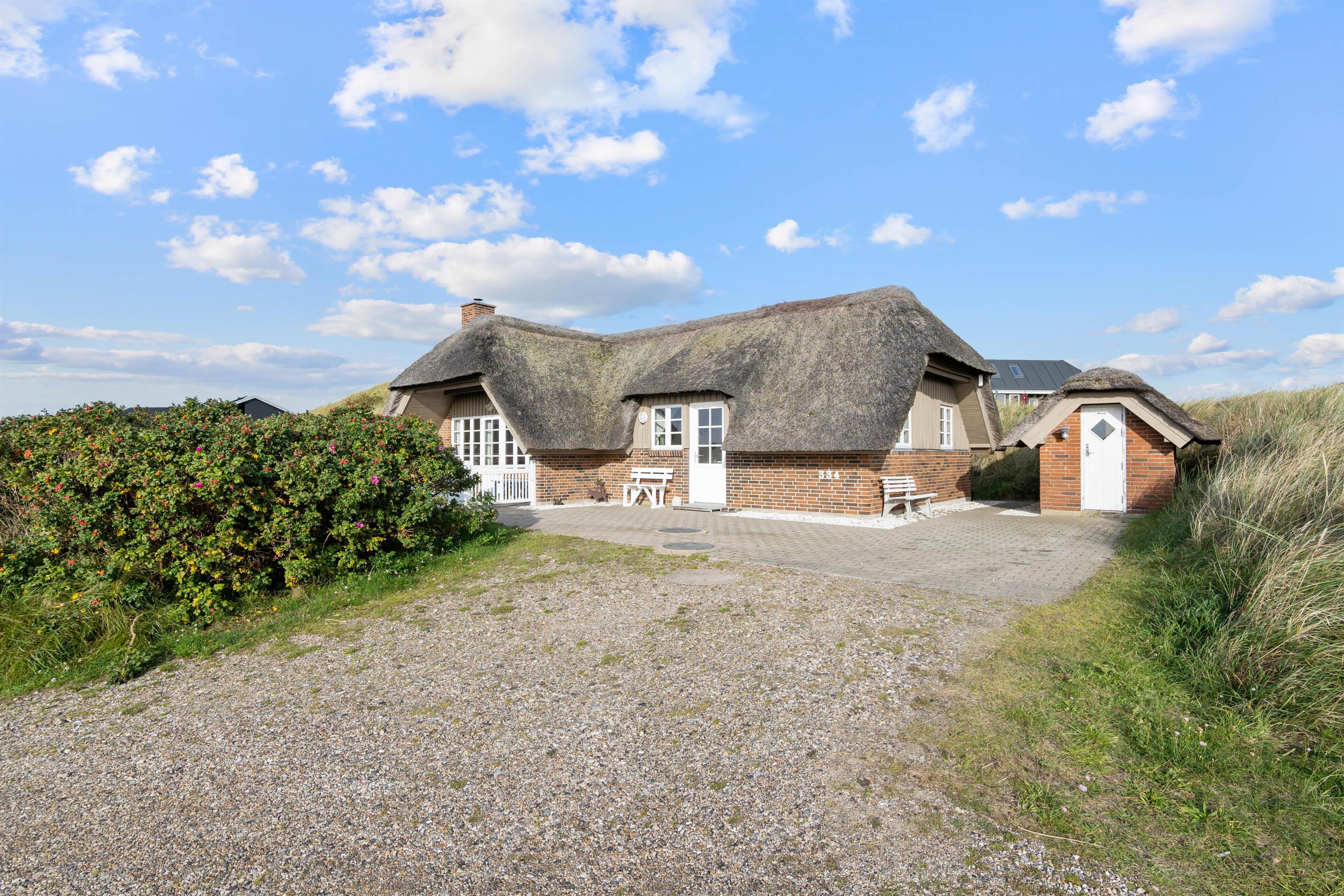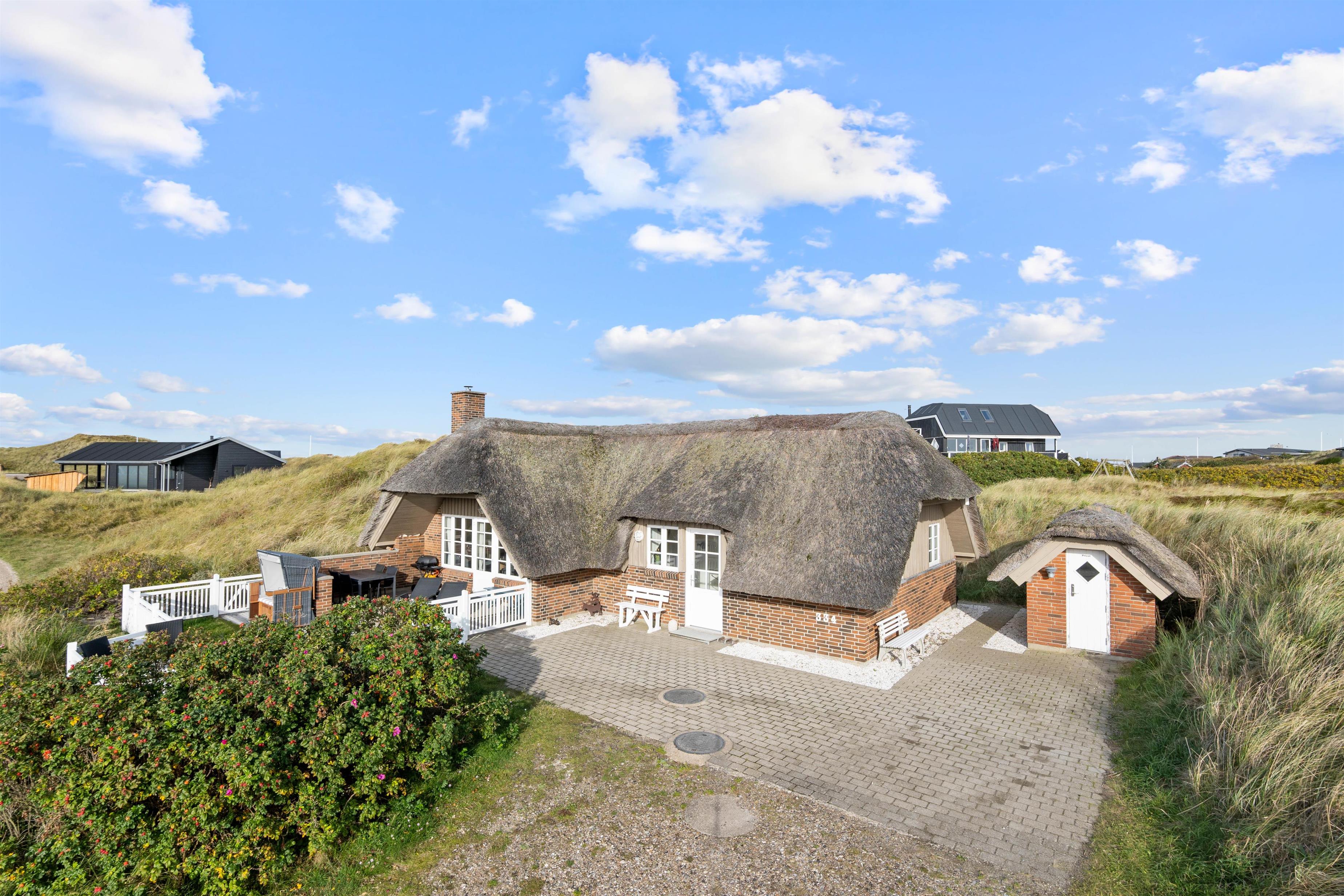 Det hyggelige og stilfuldt indrettede feriehus ligger skønt placeret på en kuperet klitgrund. Bag ved huset går en lille trappe op på en af klitterne og herfra har man en helt utrolig flot udsigt udover den smukke natur. Den lukkede og skønne anlagte terrasse er et dejlligt sted at sidde. Her kan I nyde den friske rene vesterhavsluft ad libitum. Fra huset er der kun 350 meter til Vesterhavet og den smukke lange sandstrand, hvor I kan gå nogle skønne og lange gåture.