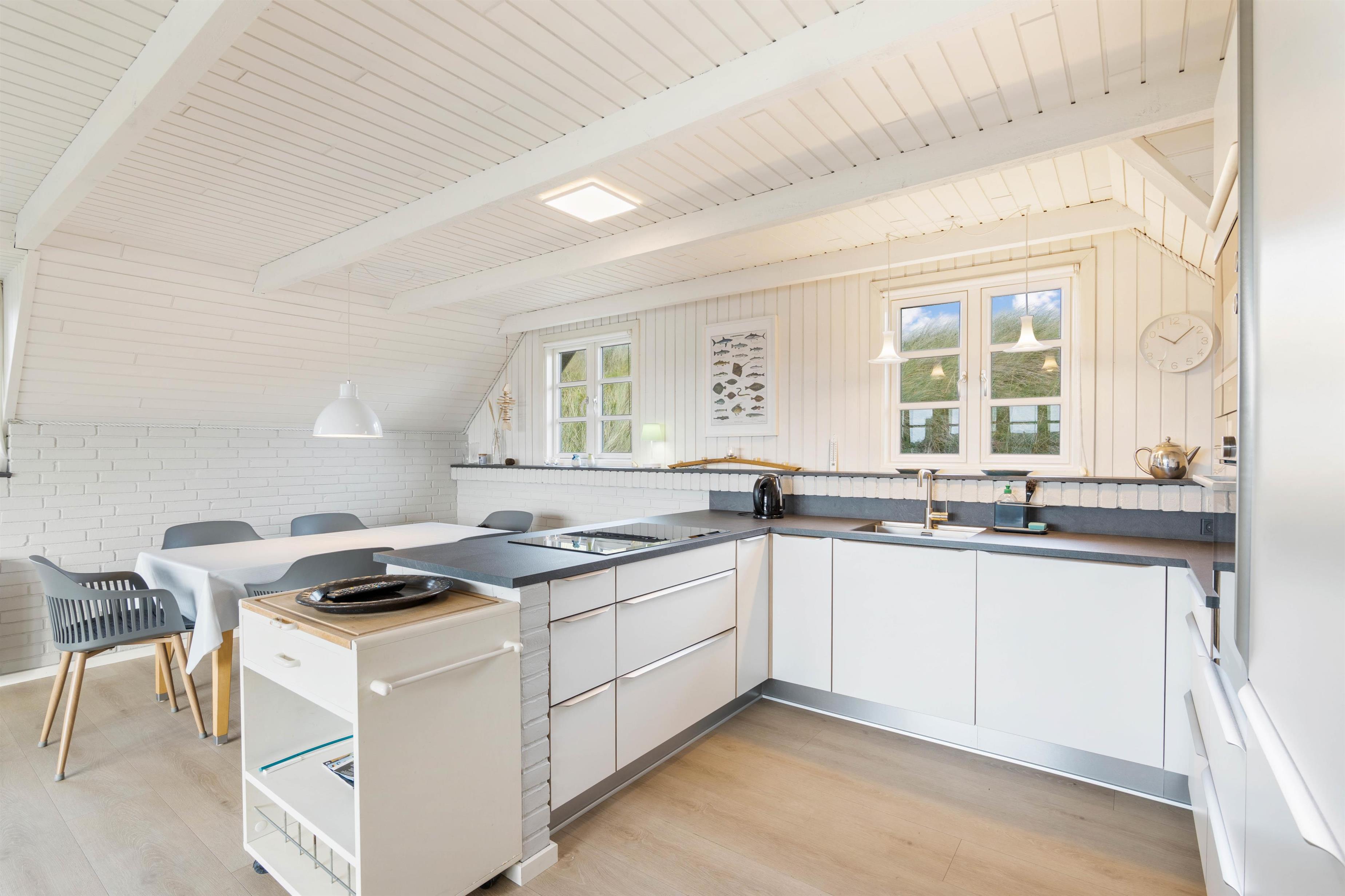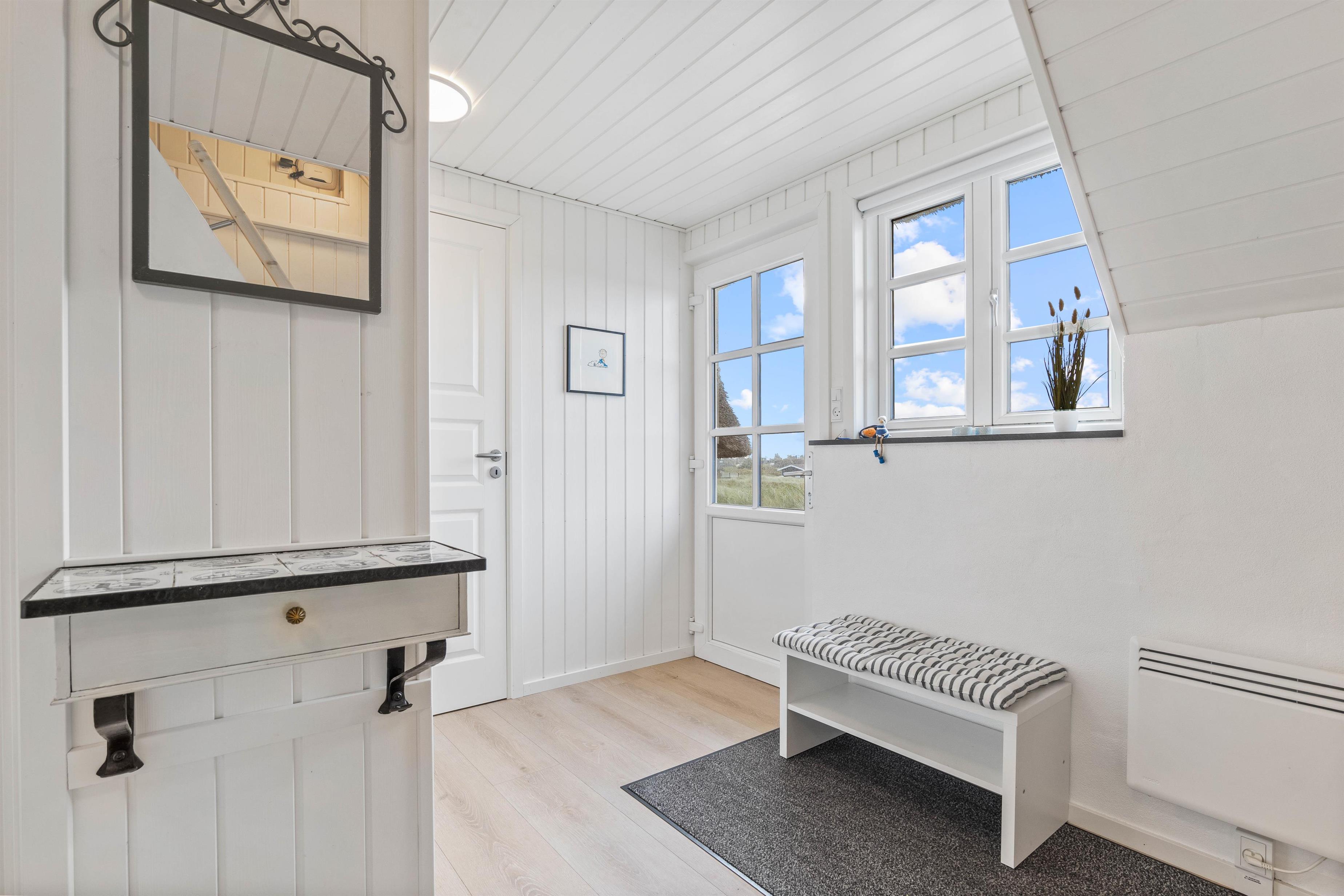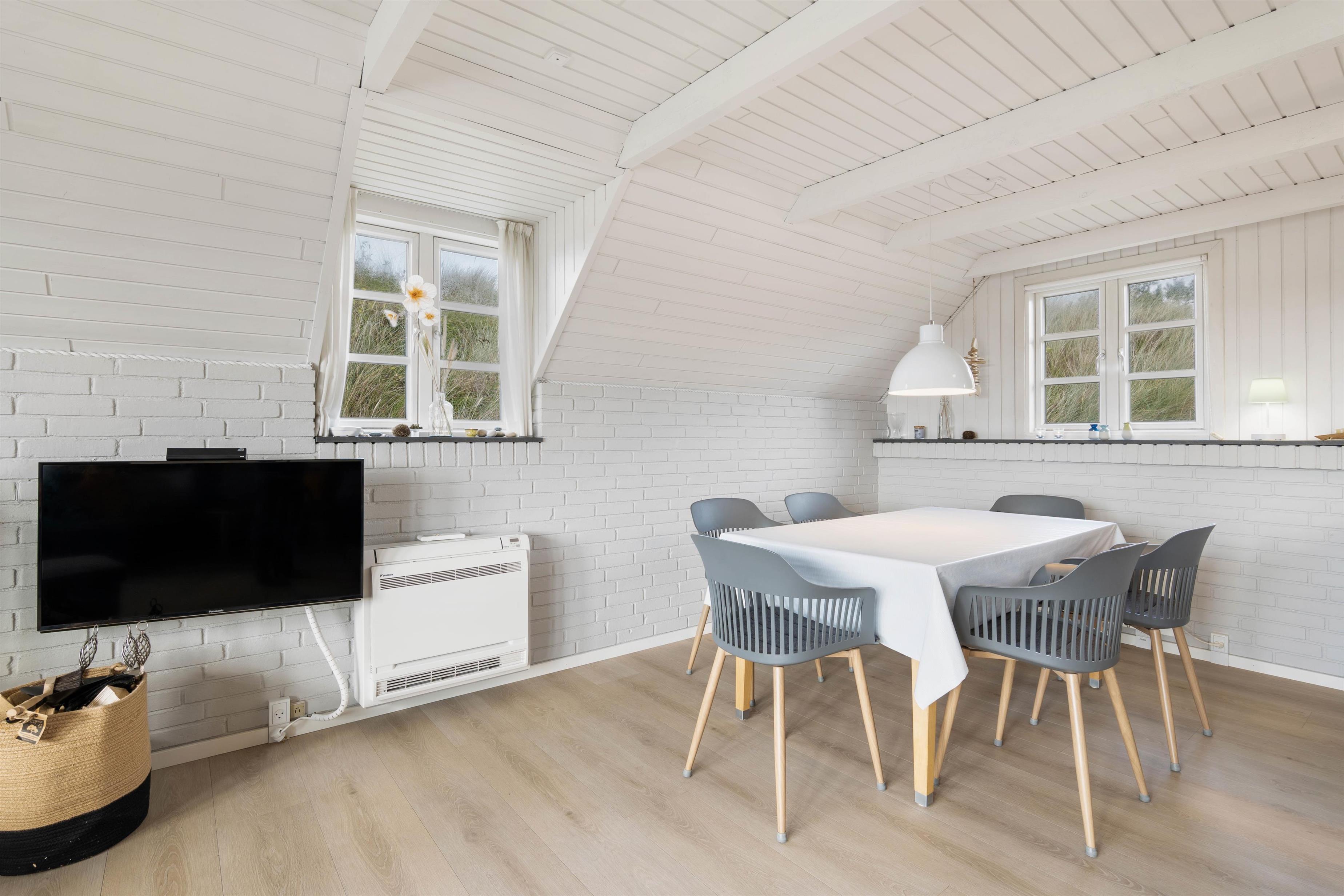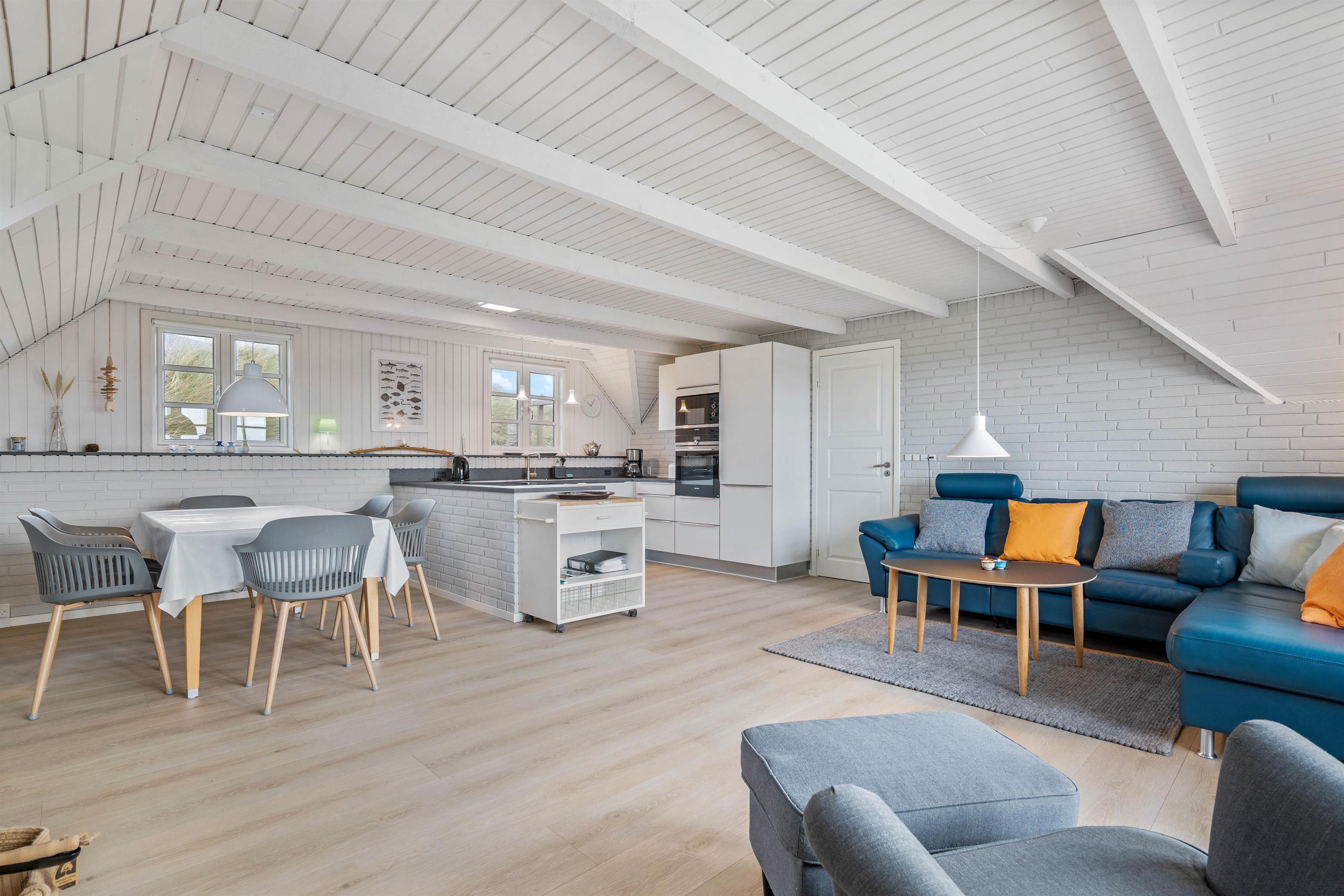 Det hyggelige og stilfuldt indrettede feriehus ligger skønt placeret på en kuperet klitgrund. Bag ved huset går en lille trappe op på en af klitterne og herfra har man en helt utrolig flot udsigt udover den smukke natur. Den lukkede og skønne anlagte terrasse er et dejlligt sted at sidde. Her kan I nyde den friske rene vesterhavsluft ad libitum. Fra huset er der kun 350 meter til Vesterhavet og den smukke lange sandstrand, hvor I kan gå nogle skønne og lange gåture.