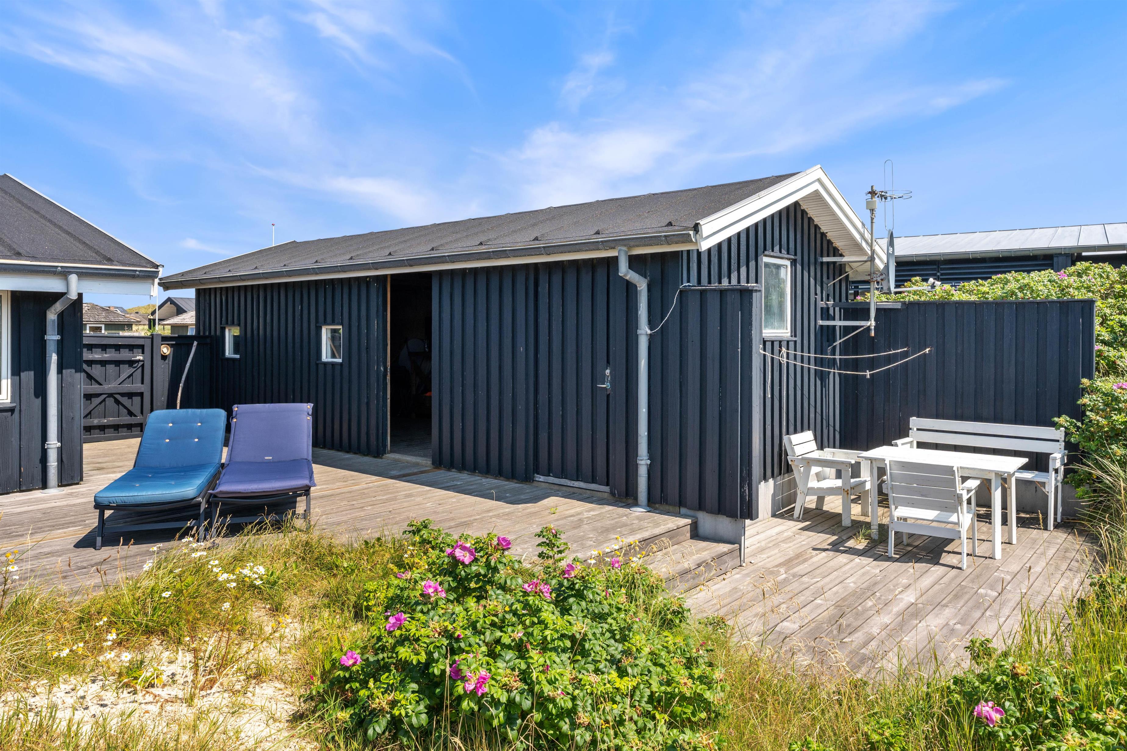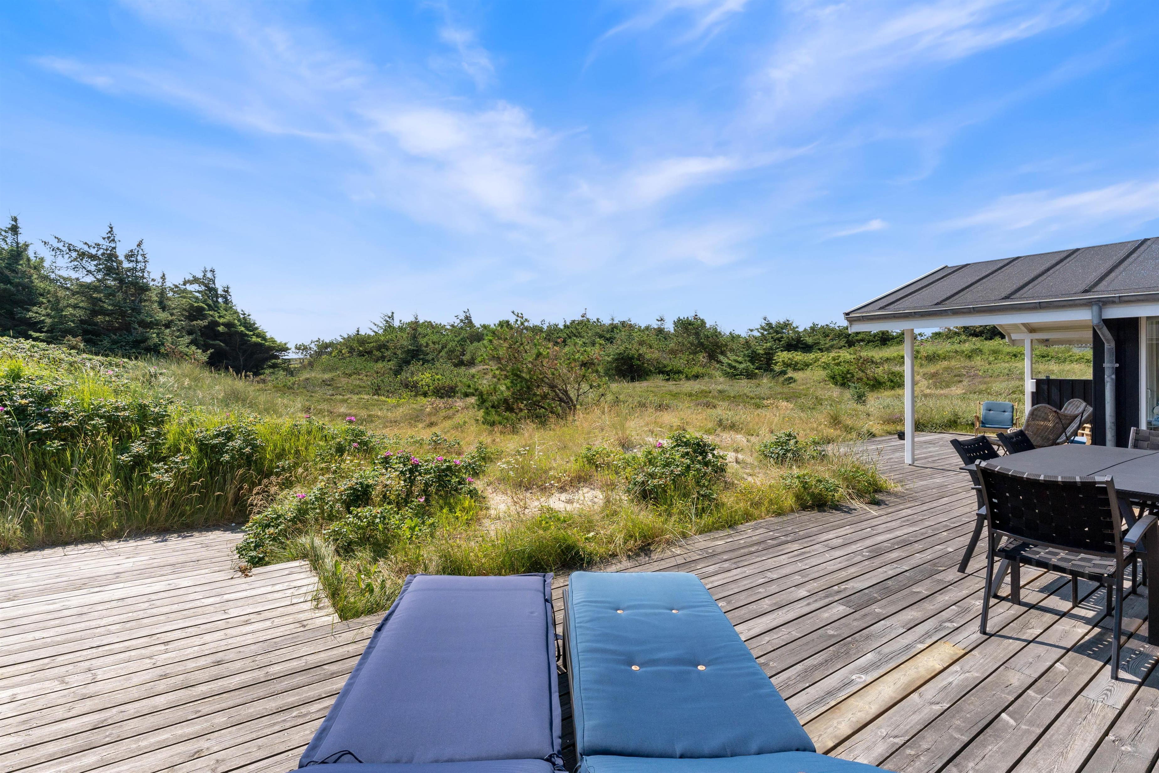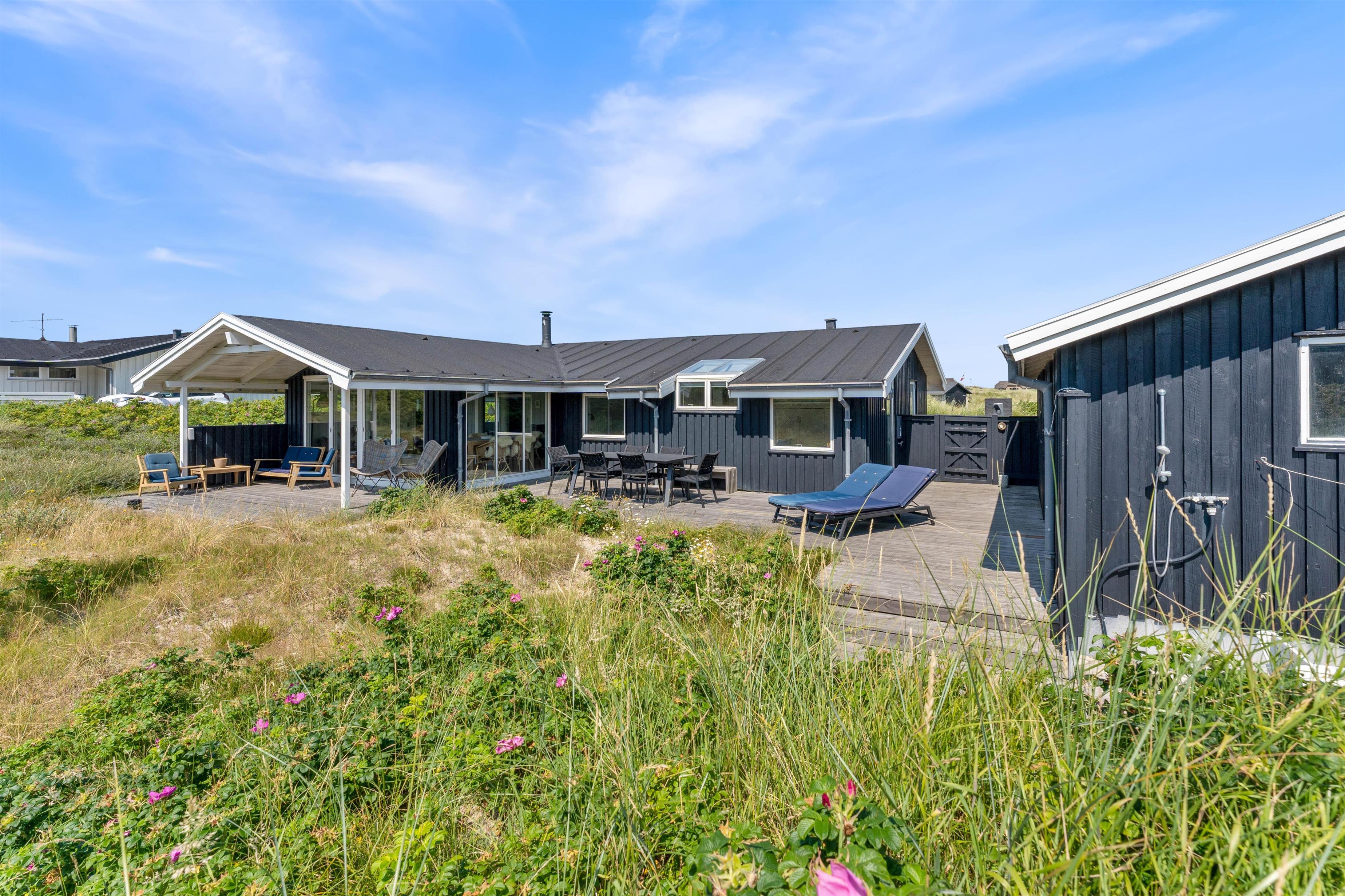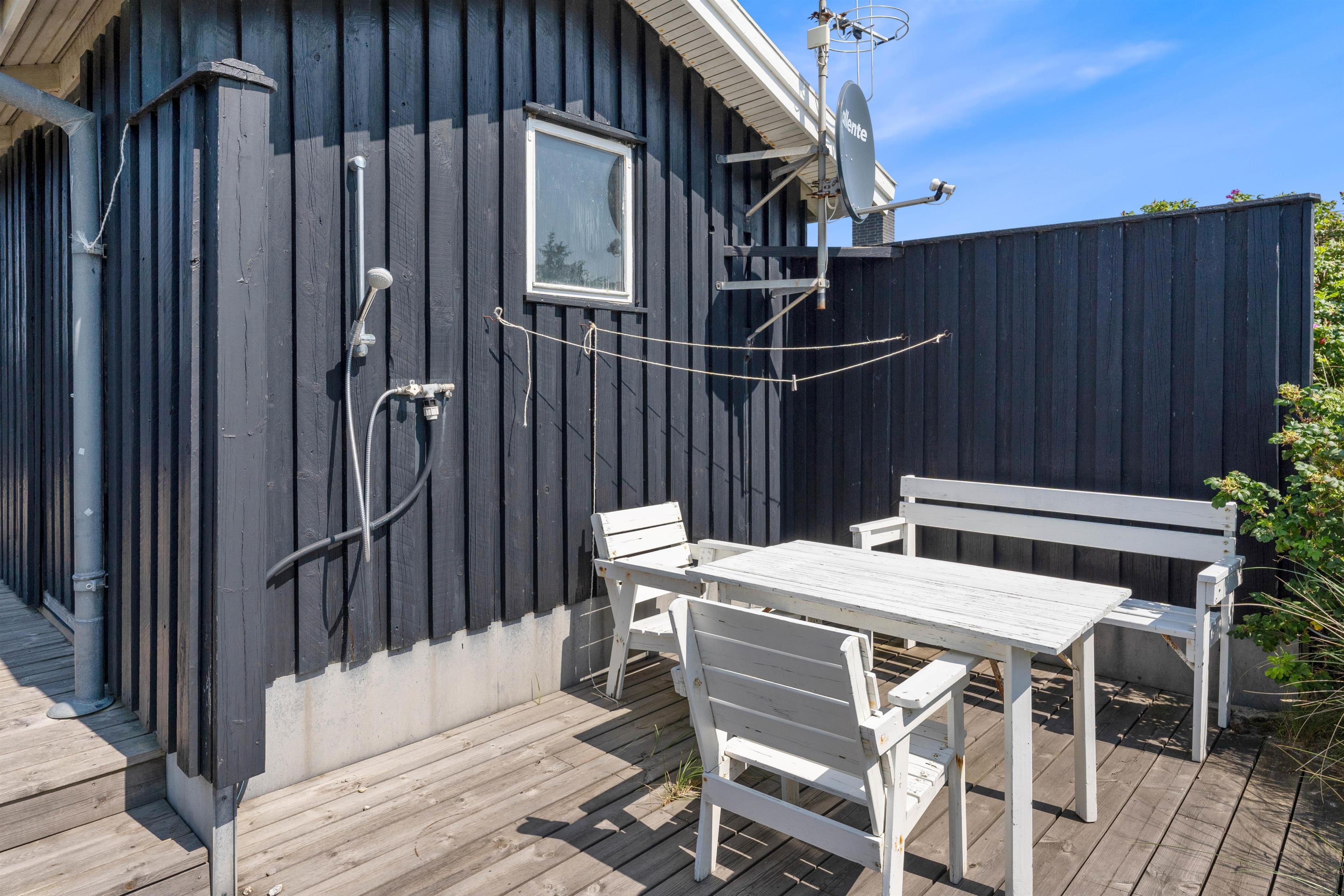 Sommerhuset har en skøn beliggenhed på en naturgrund midt i Søndervigs sommerhusland, og I kan nyde udsigten til klitlandskabet fra den ugenerede, sydvendte terrasse. Terrassen er delvist overdækket, og det er altid muligt at finde en læfyldt plads i solen på de gode sommerdage. Der er naturligvis sørget for havemøbler, liggestole, en udebruser og en grill, så I kan få det bedste ud af feriedagene i den friske luft. Udebruseren kan benyttes i perioden april til november.