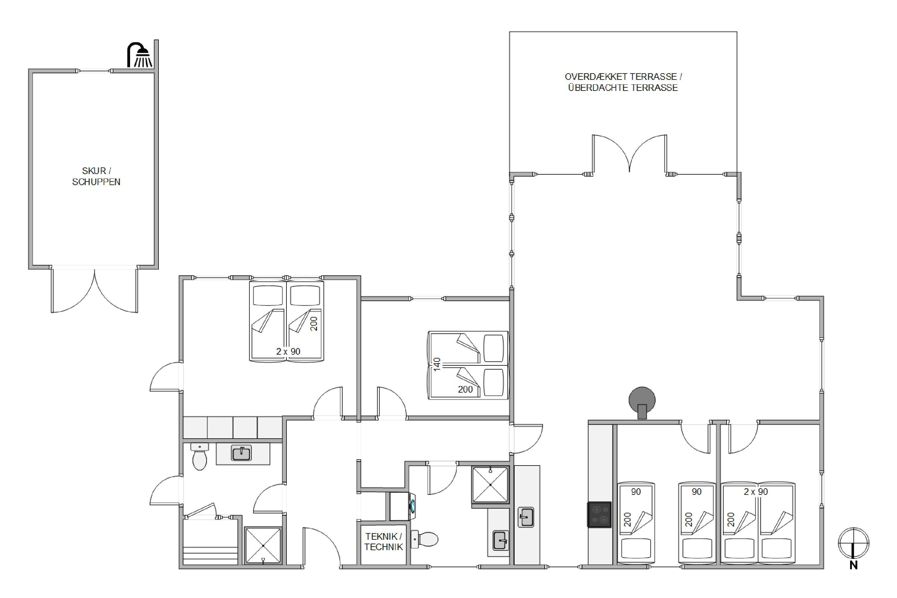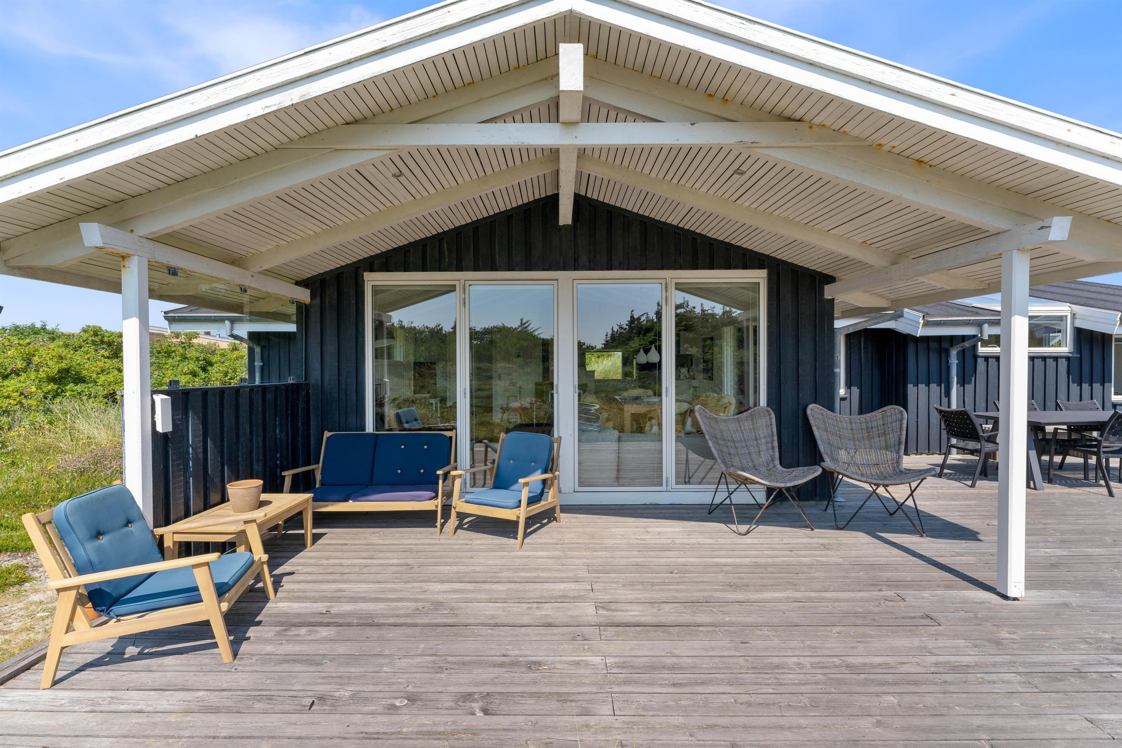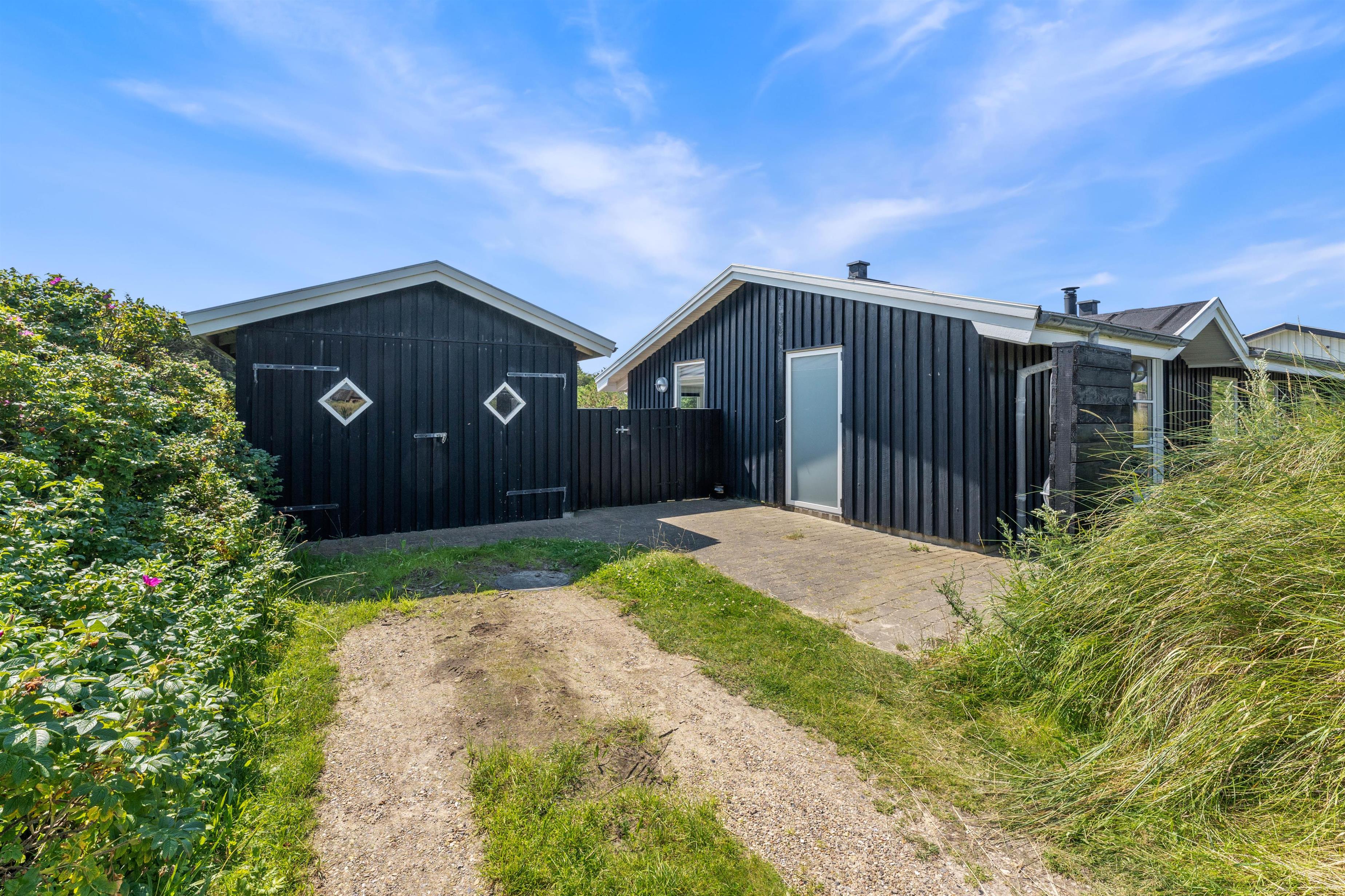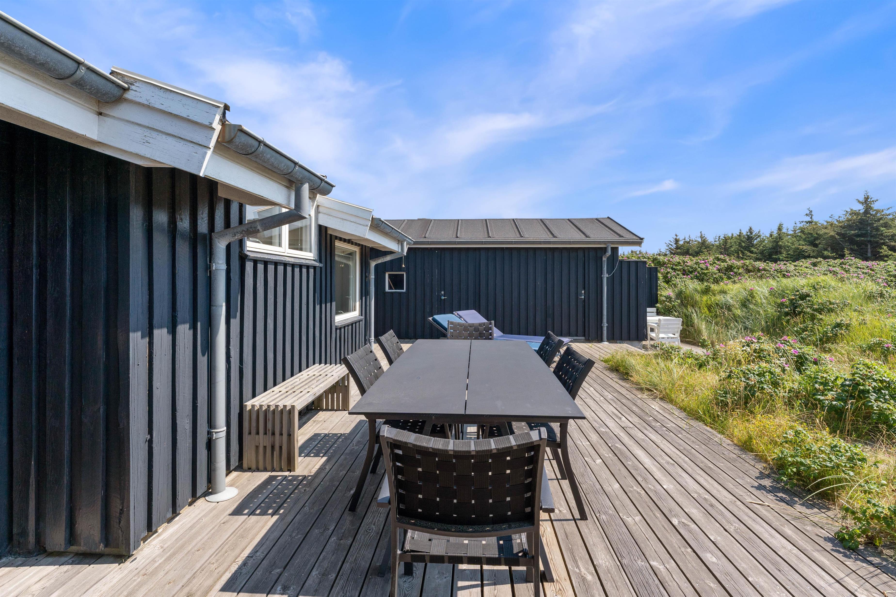 Sommerhuset har en skøn beliggenhed på en naturgrund midt i Søndervigs sommerhusland, og I kan nyde udsigten til klitlandskabet fra den ugenerede, sydvendte terrasse. Terrassen er delvist overdækket, og det er altid muligt at finde en læfyldt plads i solen på de gode sommerdage. Der er naturligvis sørget for havemøbler, liggestole, en udebruser og en grill, så I kan få det bedste ud af feriedagene i den friske luft. Udebruseren kan benyttes i perioden april til november.