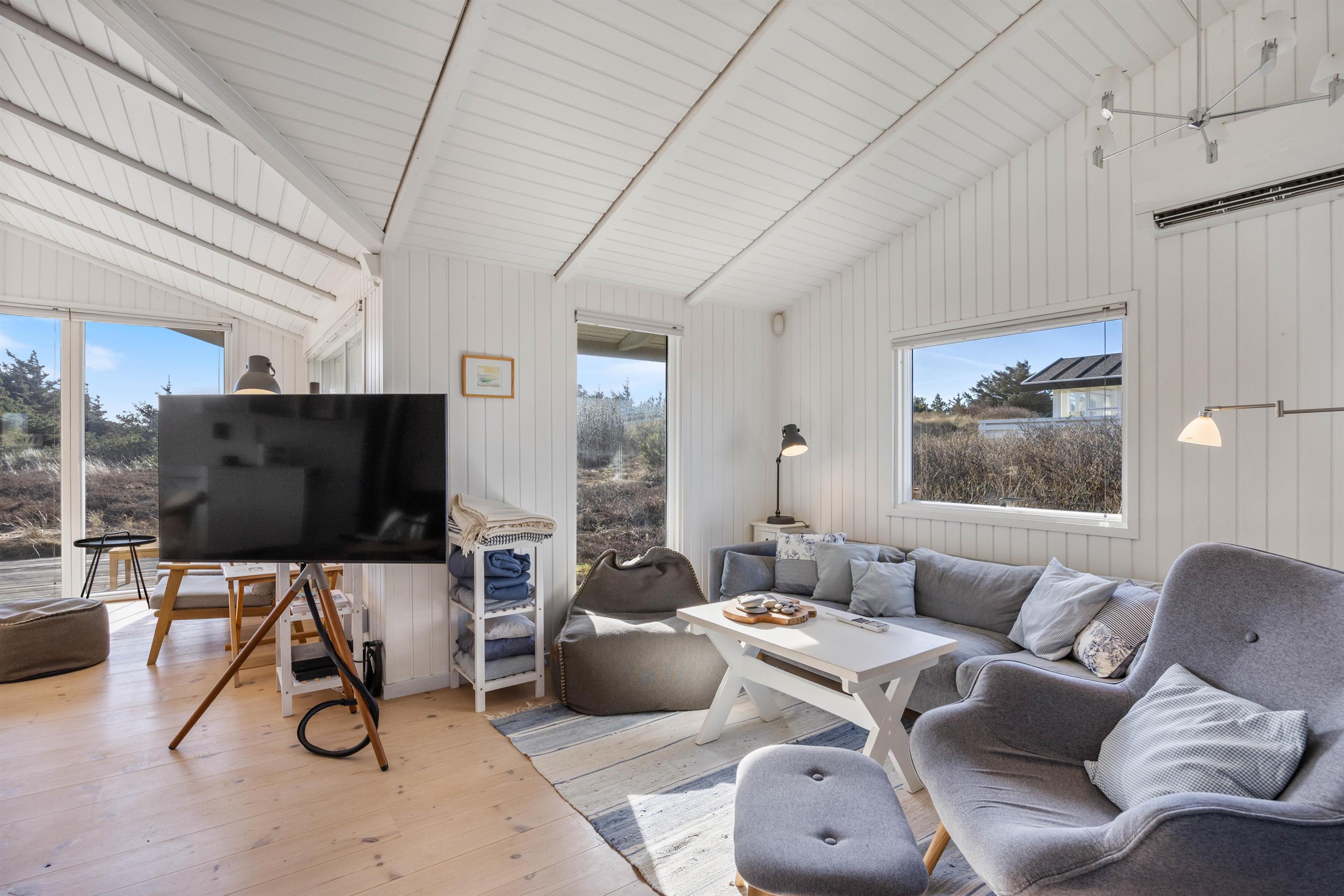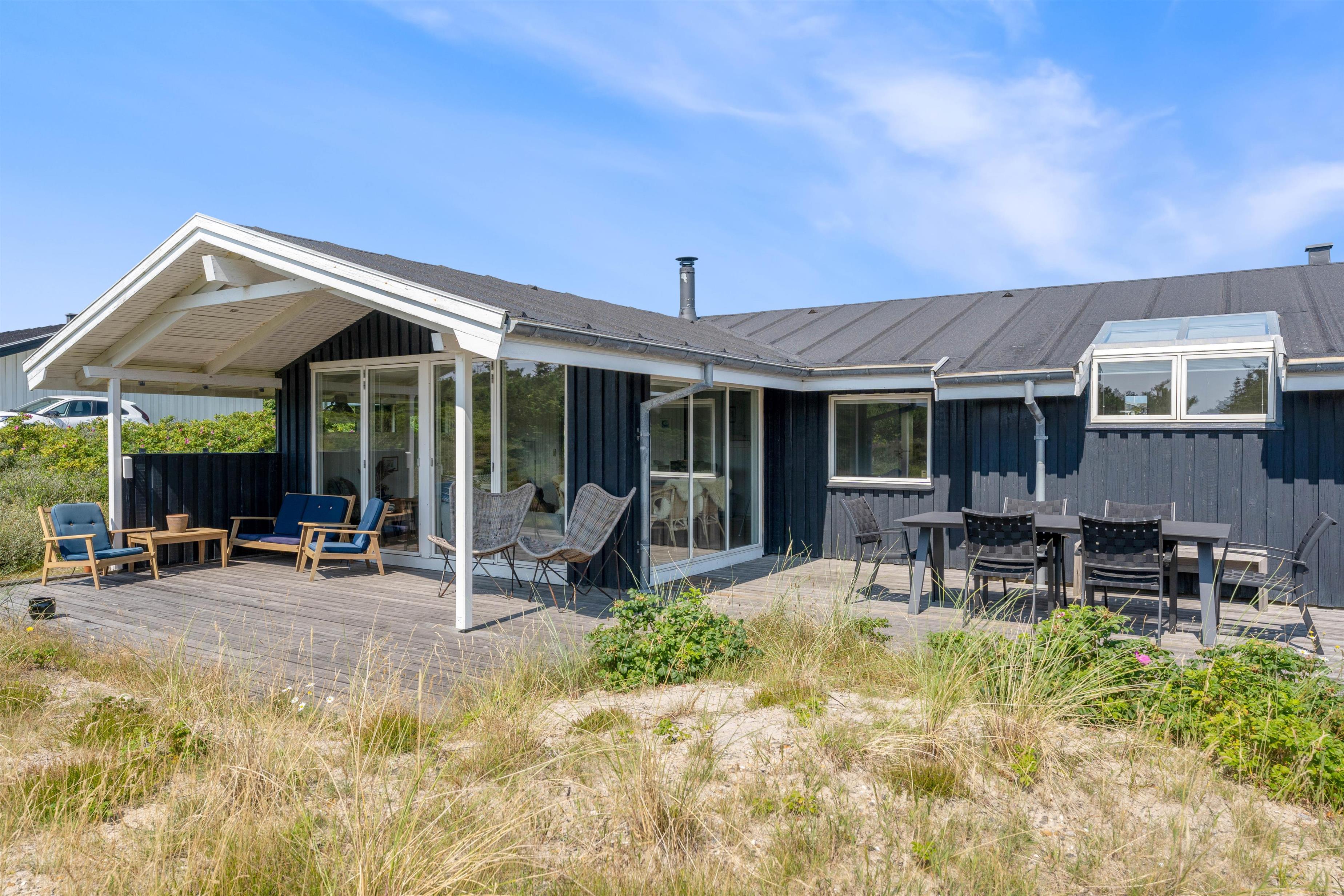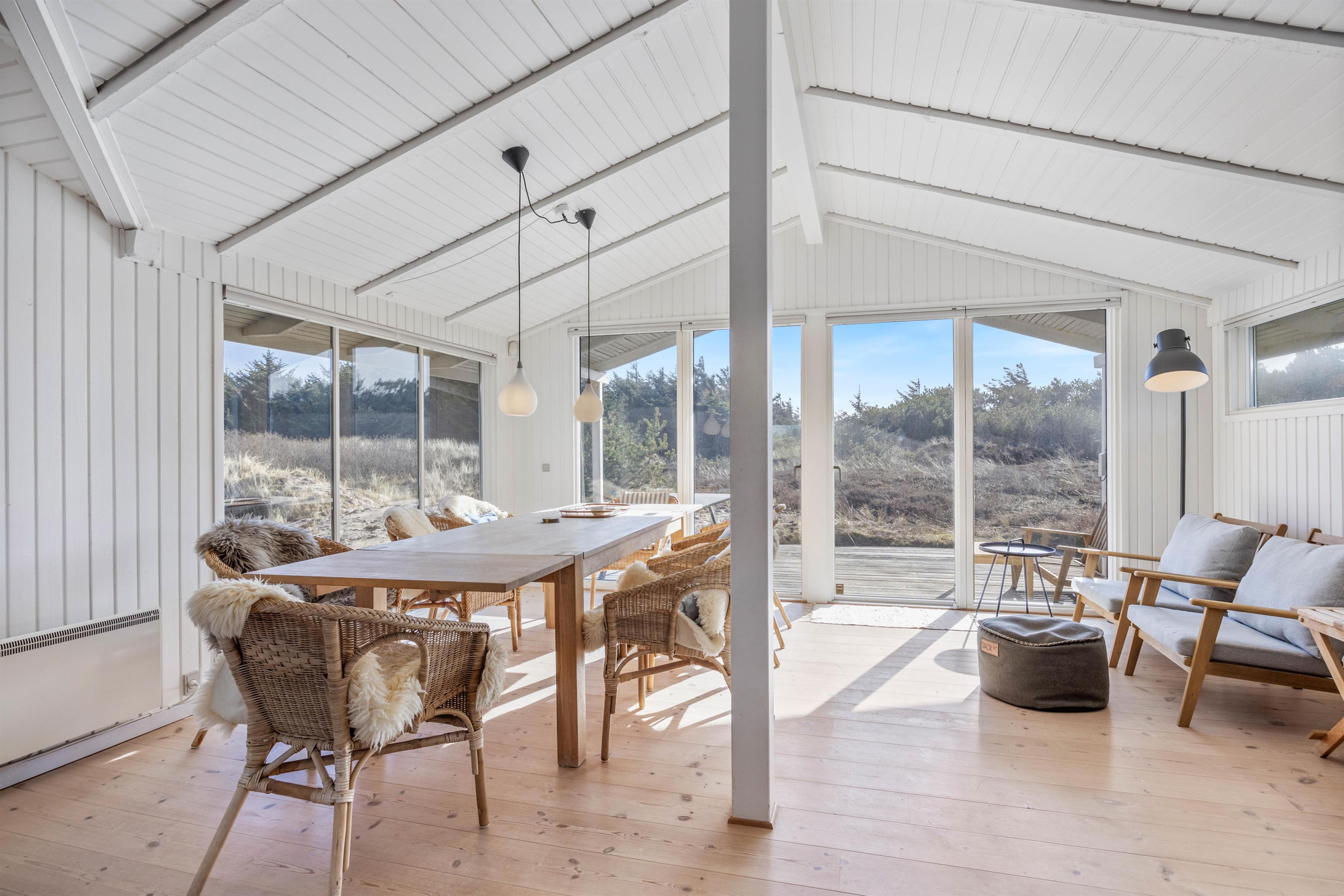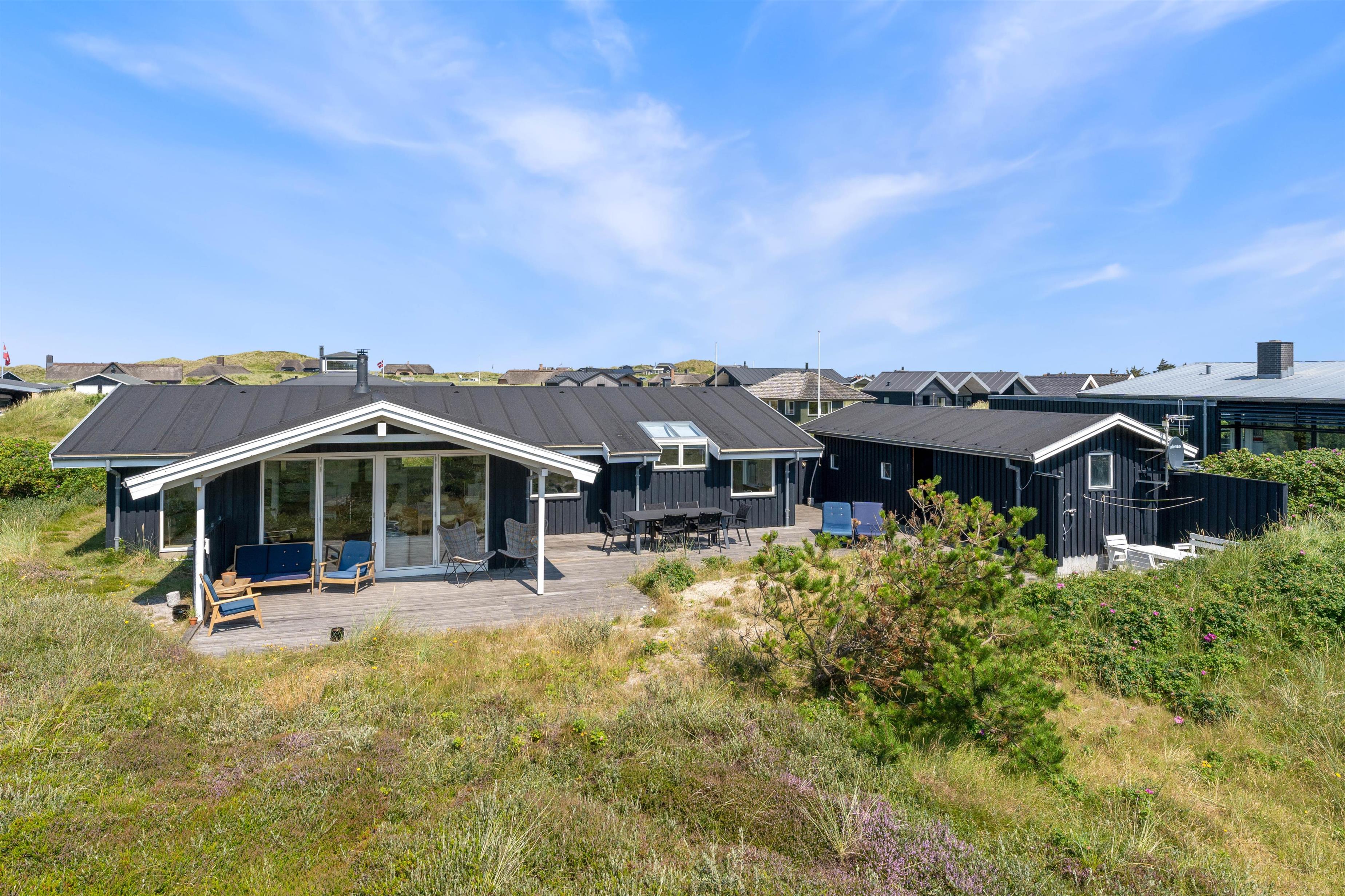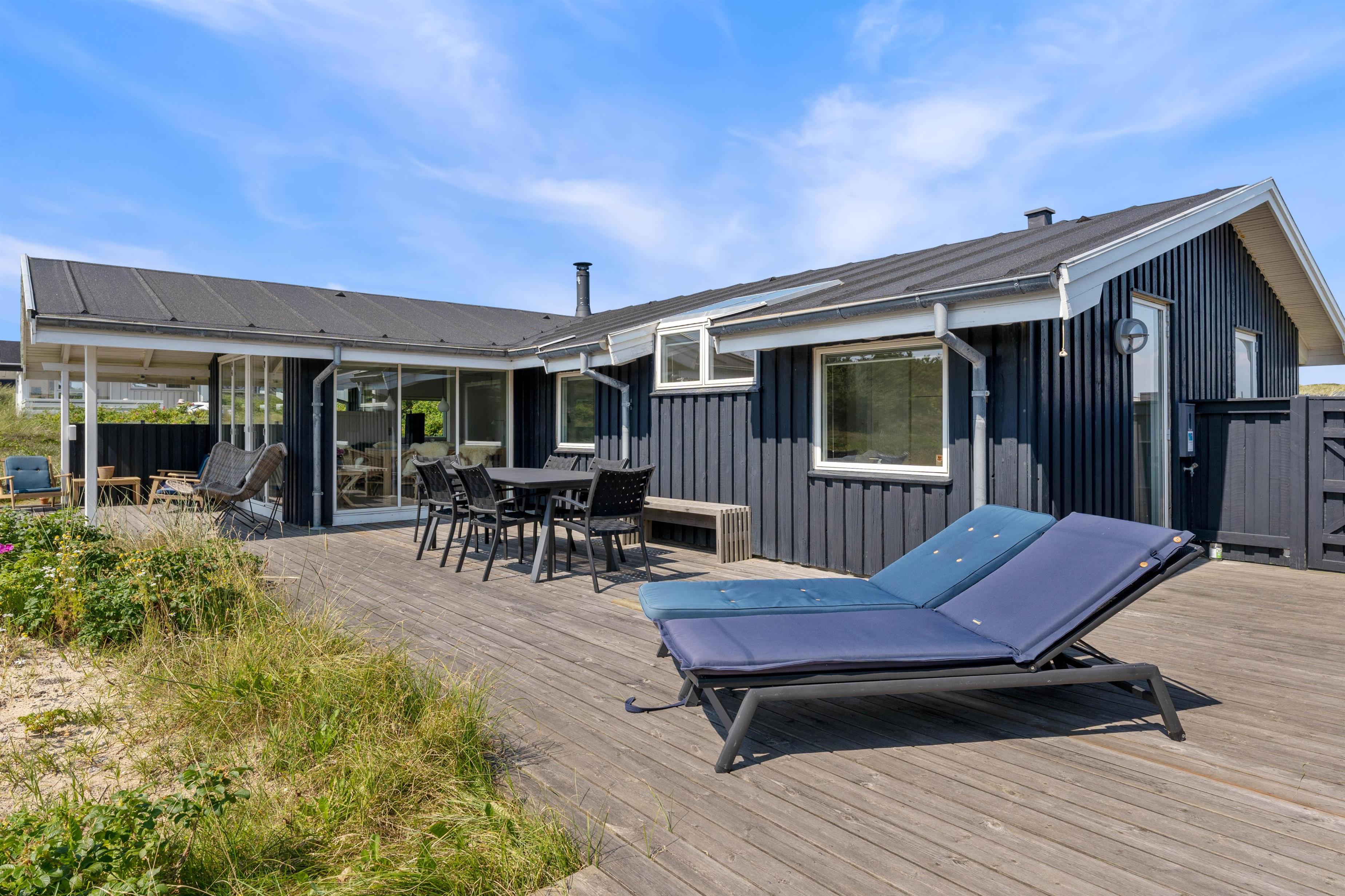 På de klare dage kan I høre Vesterhavets brusen i baggrunden, og stranden ligger kun 200 meter fra sommerhuset. På fem minutter når I vandkanten, og den kilometerlange sandstrand inviterer til gåture langs vandet på alle årstider.