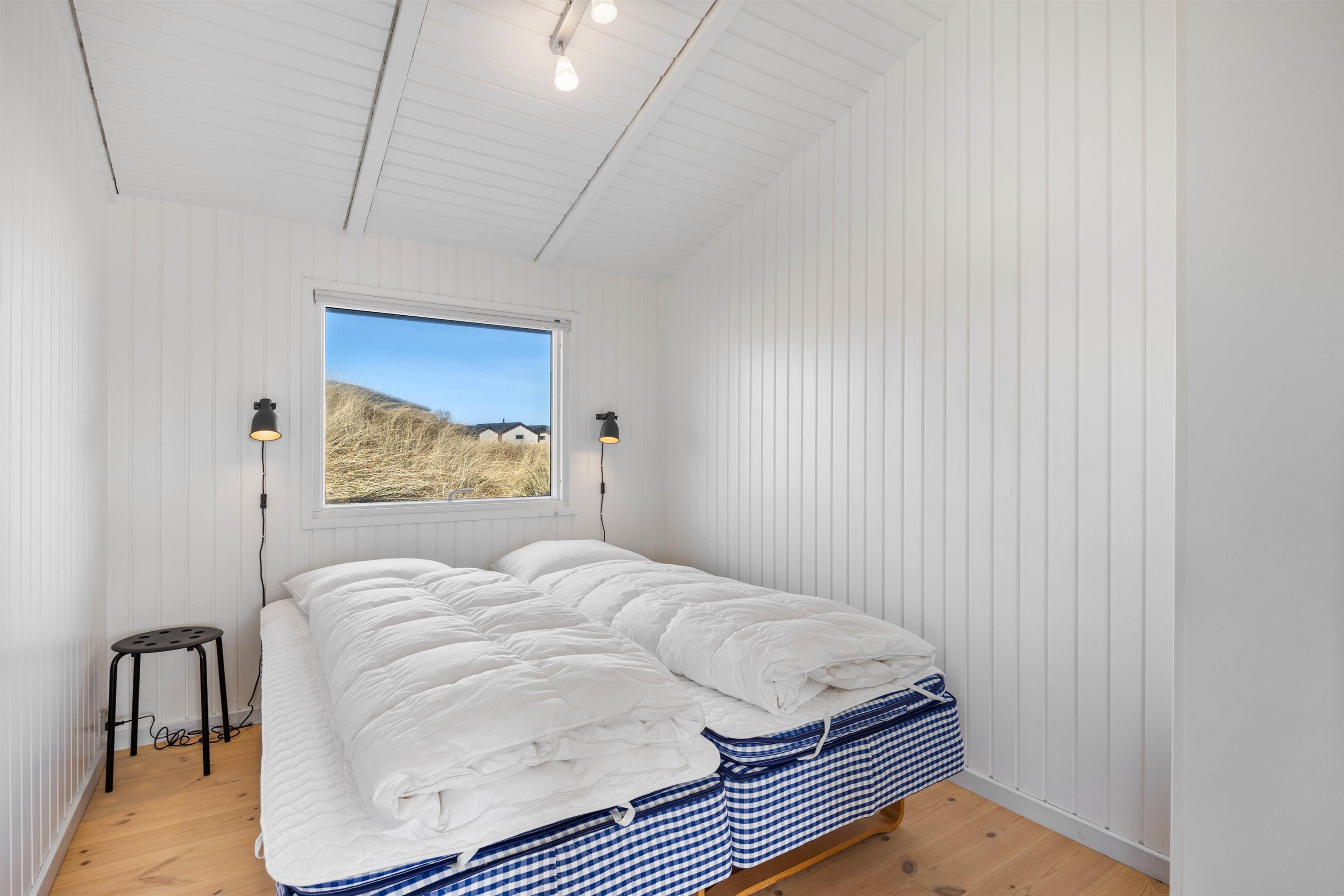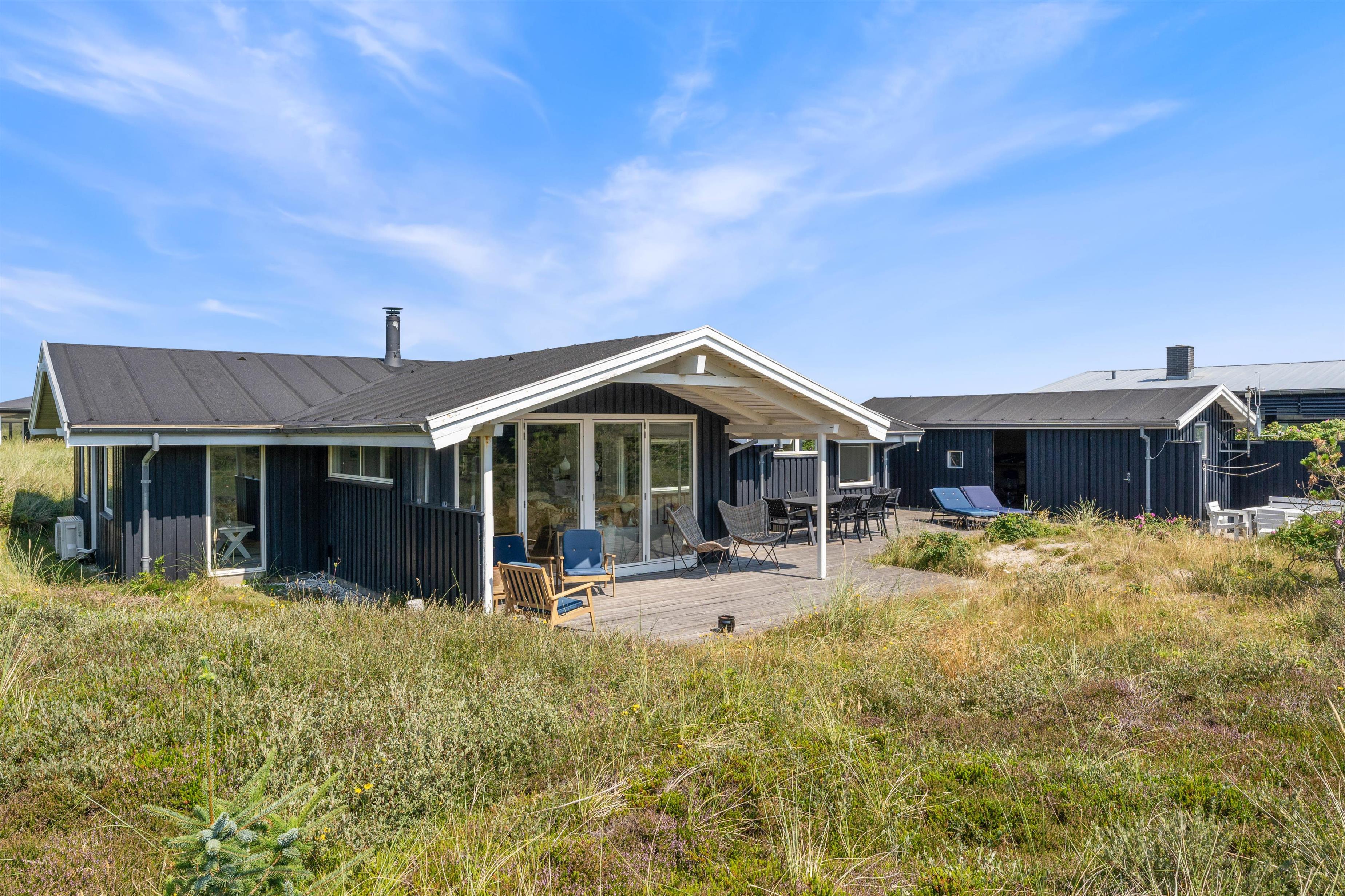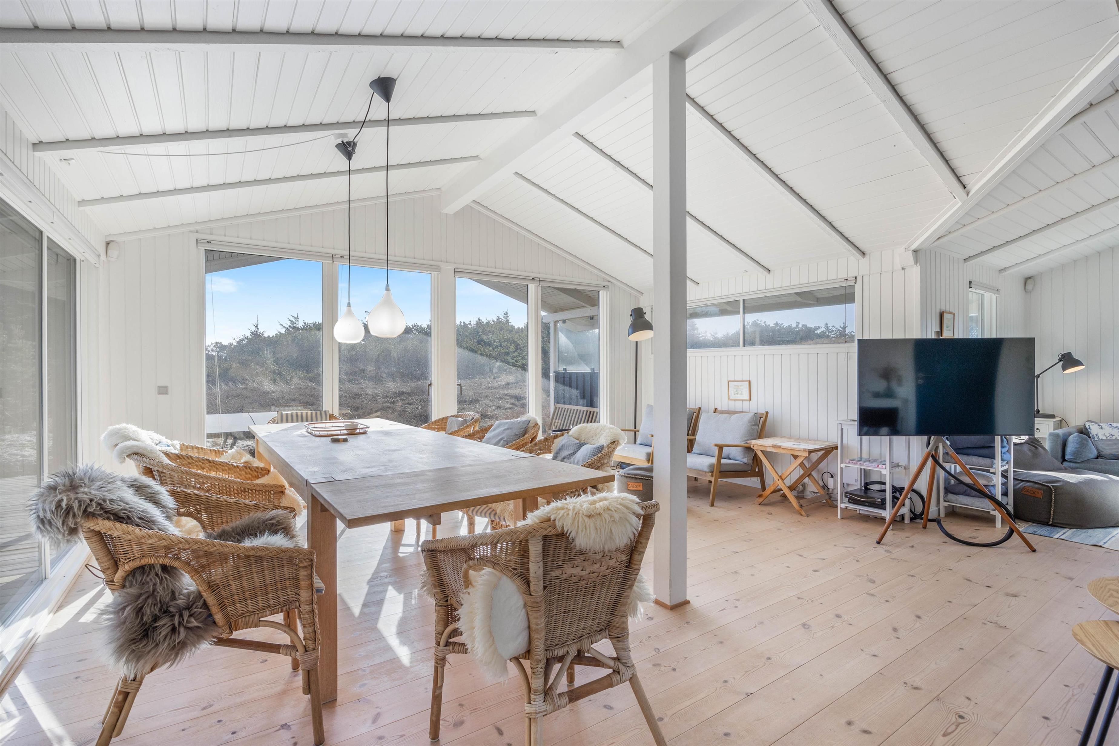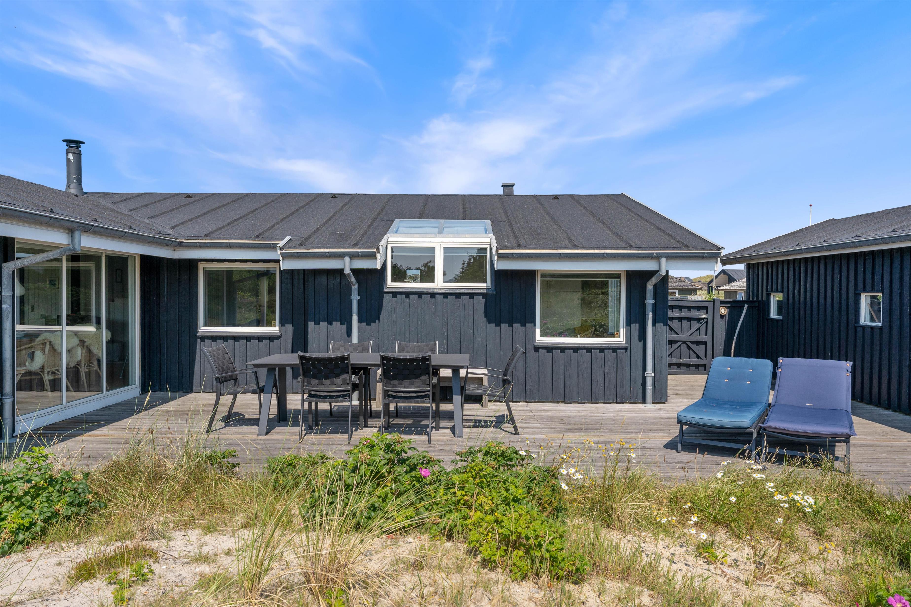 På de klare dage kan I høre Vesterhavets brusen i baggrunden, og stranden ligger kun 200 meter fra sommerhuset. På fem minutter når I vandkanten, og den kilometerlange sandstrand inviterer til gåture langs vandet på alle årstider.