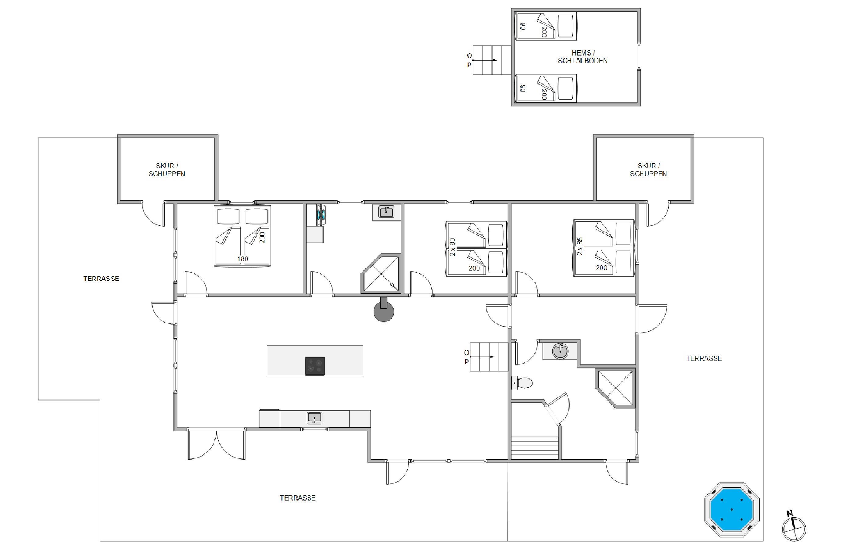 Her beliggende på Holdvej 1 finder I et skønt og flot hus bygget i gode materialer med lyse vægge og lofter og særdeles praktiske og rengøringsvenlige gulve. Sommerhuset der strækker sig over 102 kvadratmeter, råder over tre gode værelser alle med dobbelseng, en hems hvoraf to af de otte sovepladser findes, og to badeværelser med bruseniche.