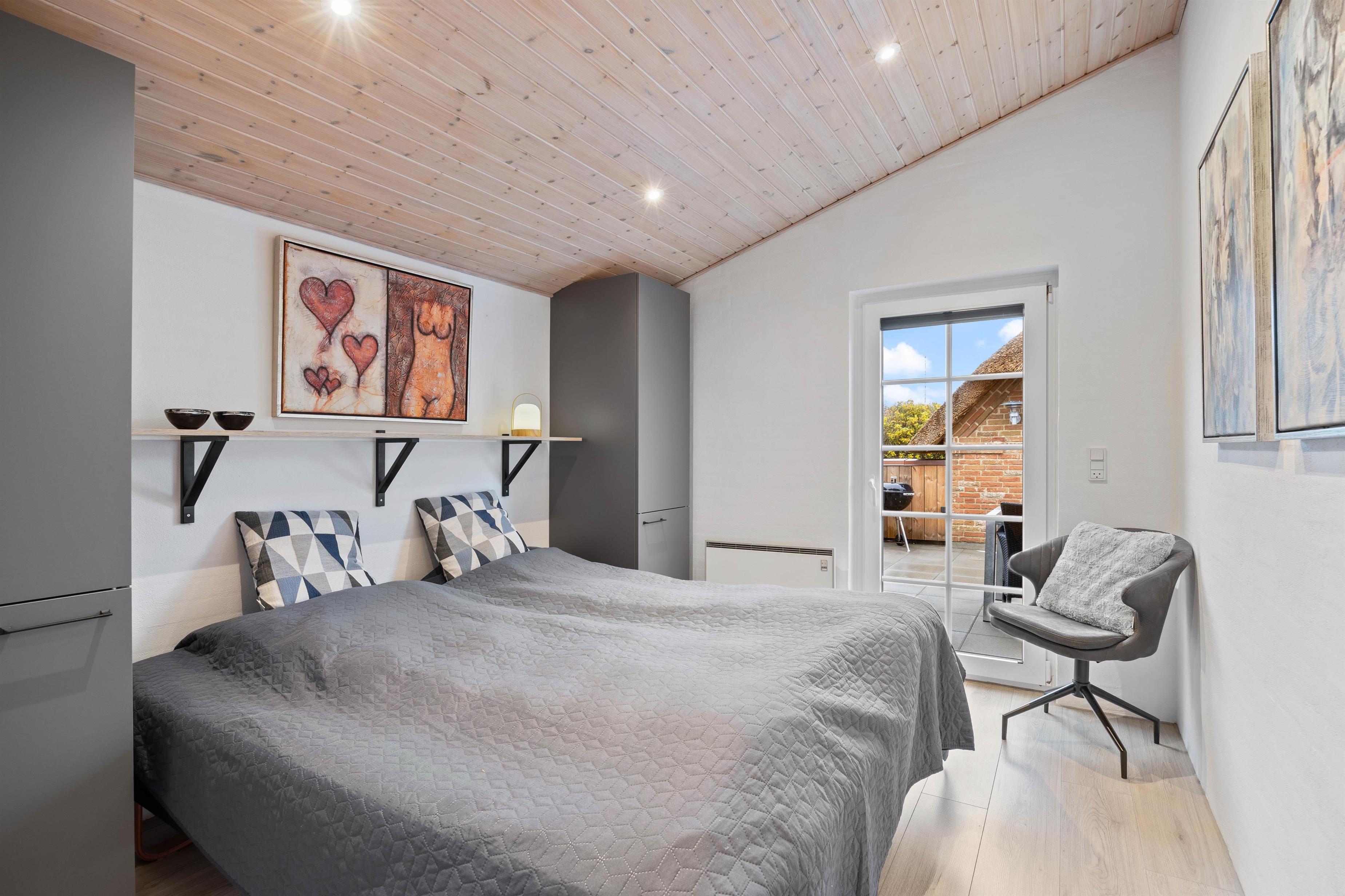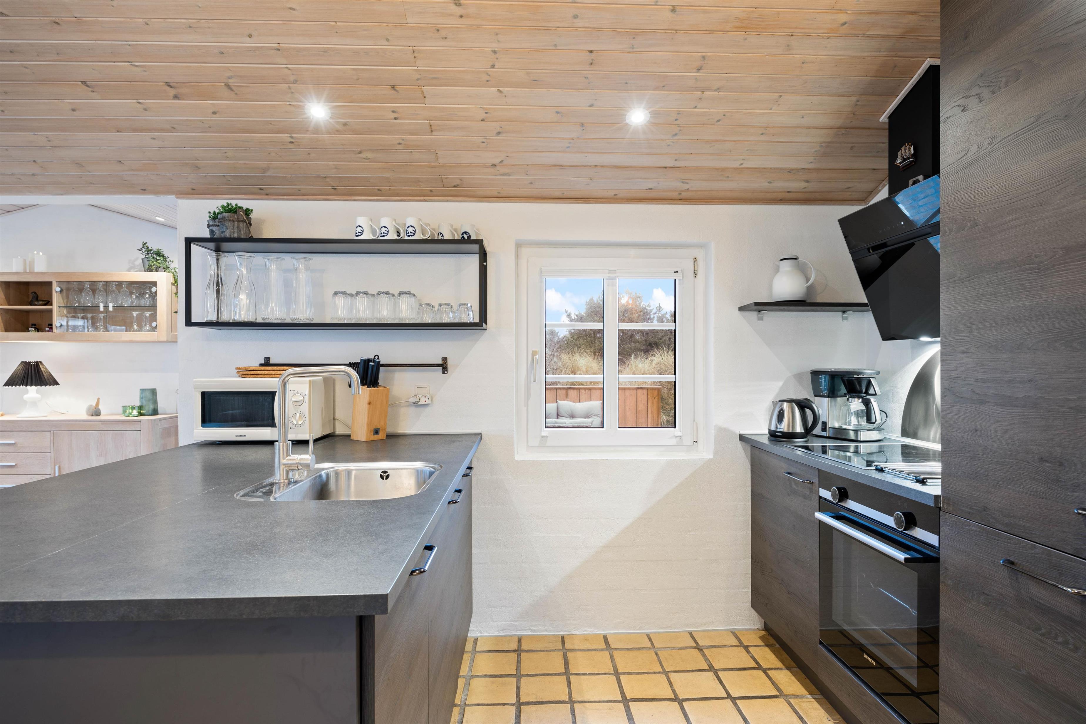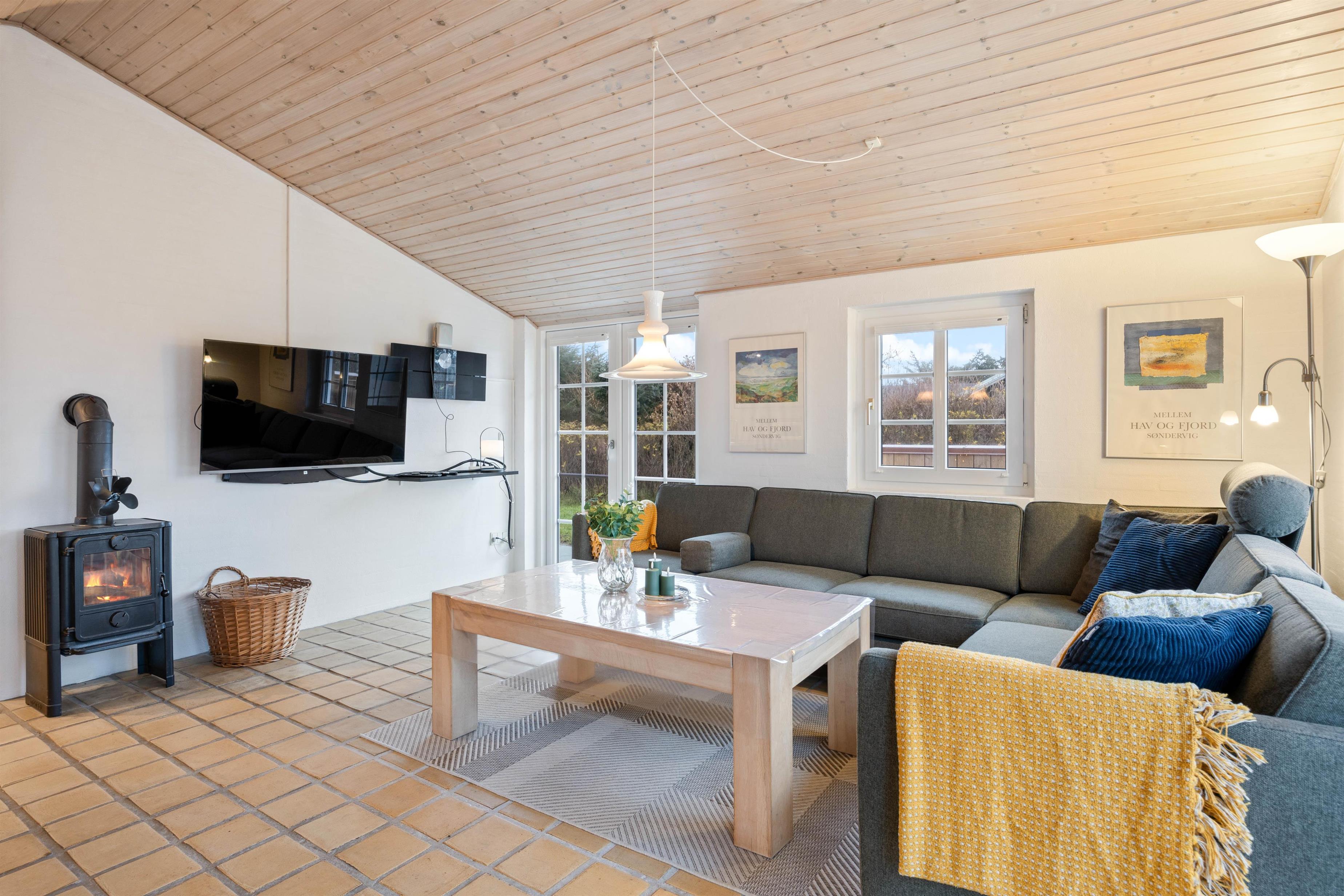 Husets veludstyrede køkken ligger i åben forbindelse med stuen. Det skaber et stort rum med masser af luft, hvor familien kan være sammen – også selv om I laver forskellige ting. Fra stuen er der udgang til husets udeareal. På en varm sommerdag er det oplagt at åbne døre og vinduer og lade lyden af den danske sommer strømme ind i huset. Husets terrasse er dejligt, afskærmet, så I kan sidde i fred og ro og nyden ferien. Her er der højt til loftet og plads til afslapning og kvalitetstid med familien.