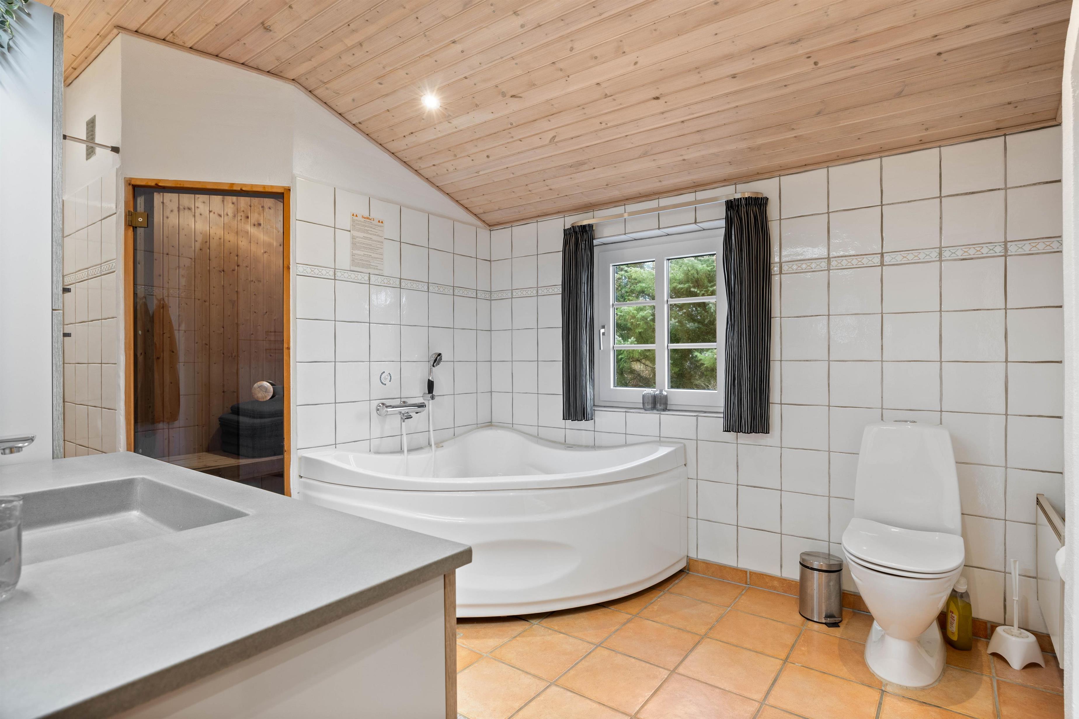Til de der ønsker at forkæle sig selv lige lidt ekstra under ferien, så tilbyder dette sommerhus en dejlig sauna og en tømmespa, som indbyder til afslapning efter en dag med udendørs eventyr. Der er ét badeværelse samt et ekstra gæstetoilet, hvilket altid er behageligt. Afstanden til stranden er blot 600 meter, og I kan nyde en frisk dukkert i havet før en afslappende stund i saunaen eller spaen.