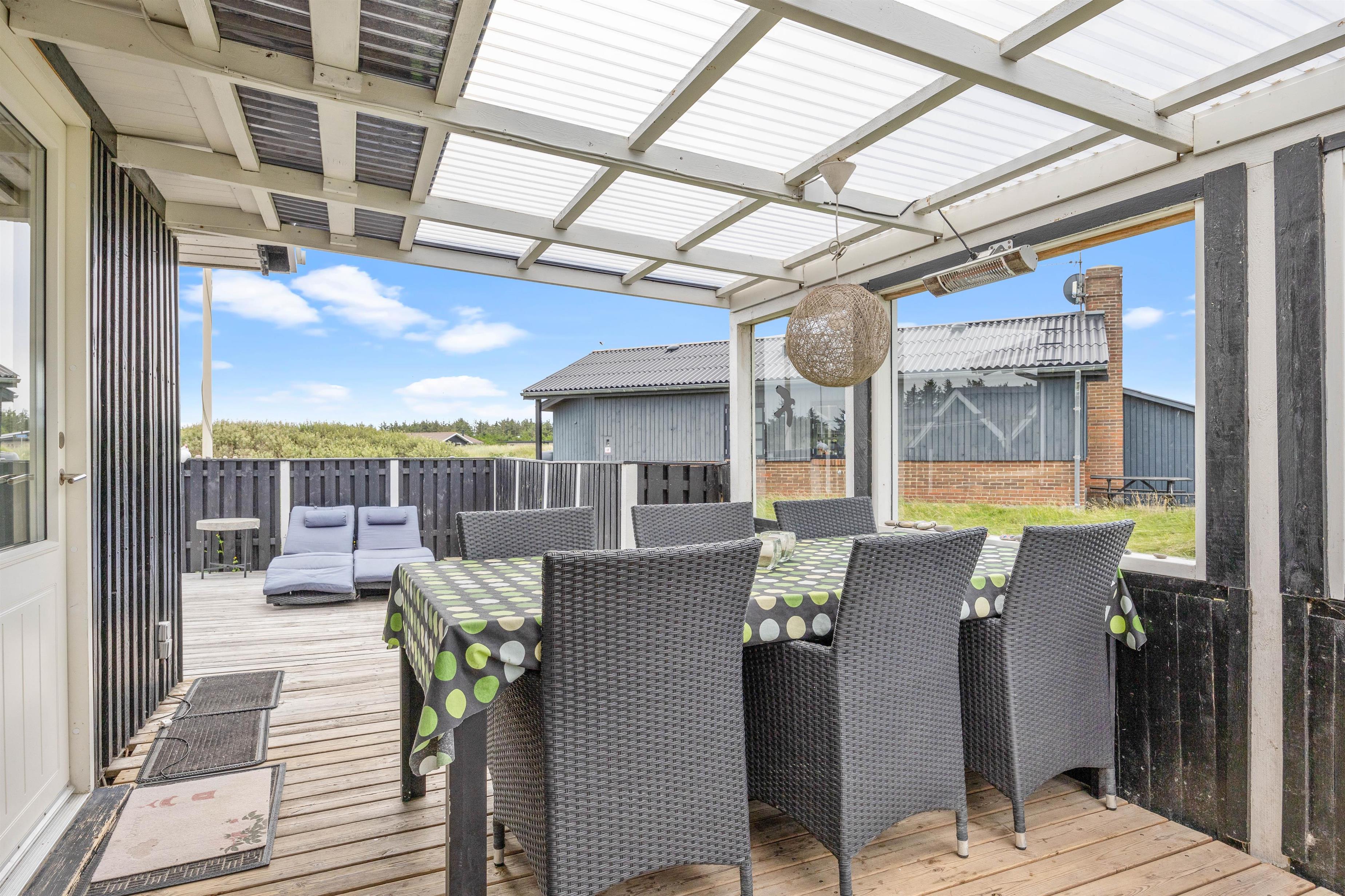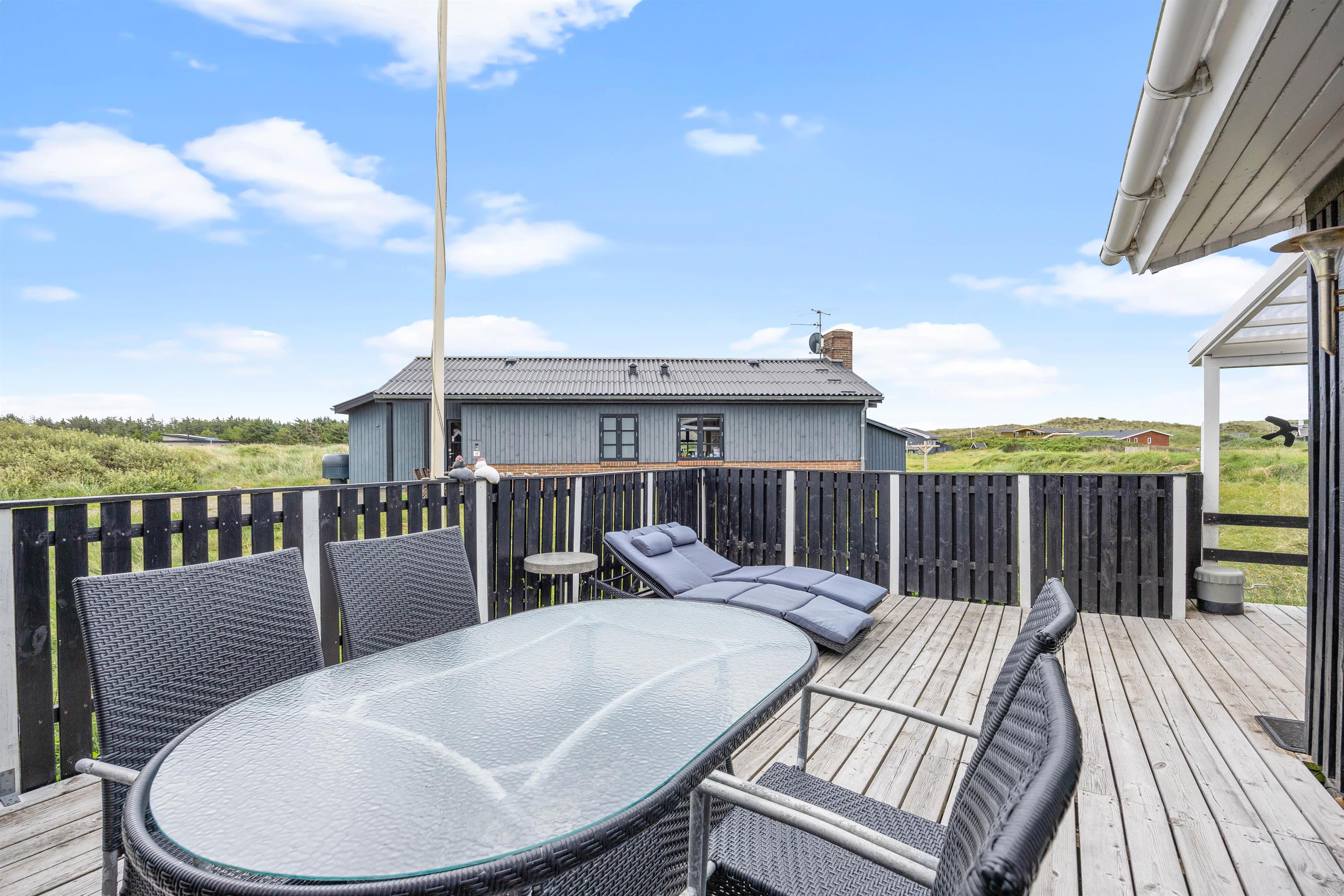 Fra stuen er der udgang til den skønne syd-vestvendt træterrasse, hvor I kan nyde feriedagene med grillhygge og solbadning. Terrassen er delvist overdækket, så I kan betragte den smukke udsigt trods vind og vejr. Og hvad er skønnere end at lytte til regnen på taget, mens man selv sidder tørt og lunt?