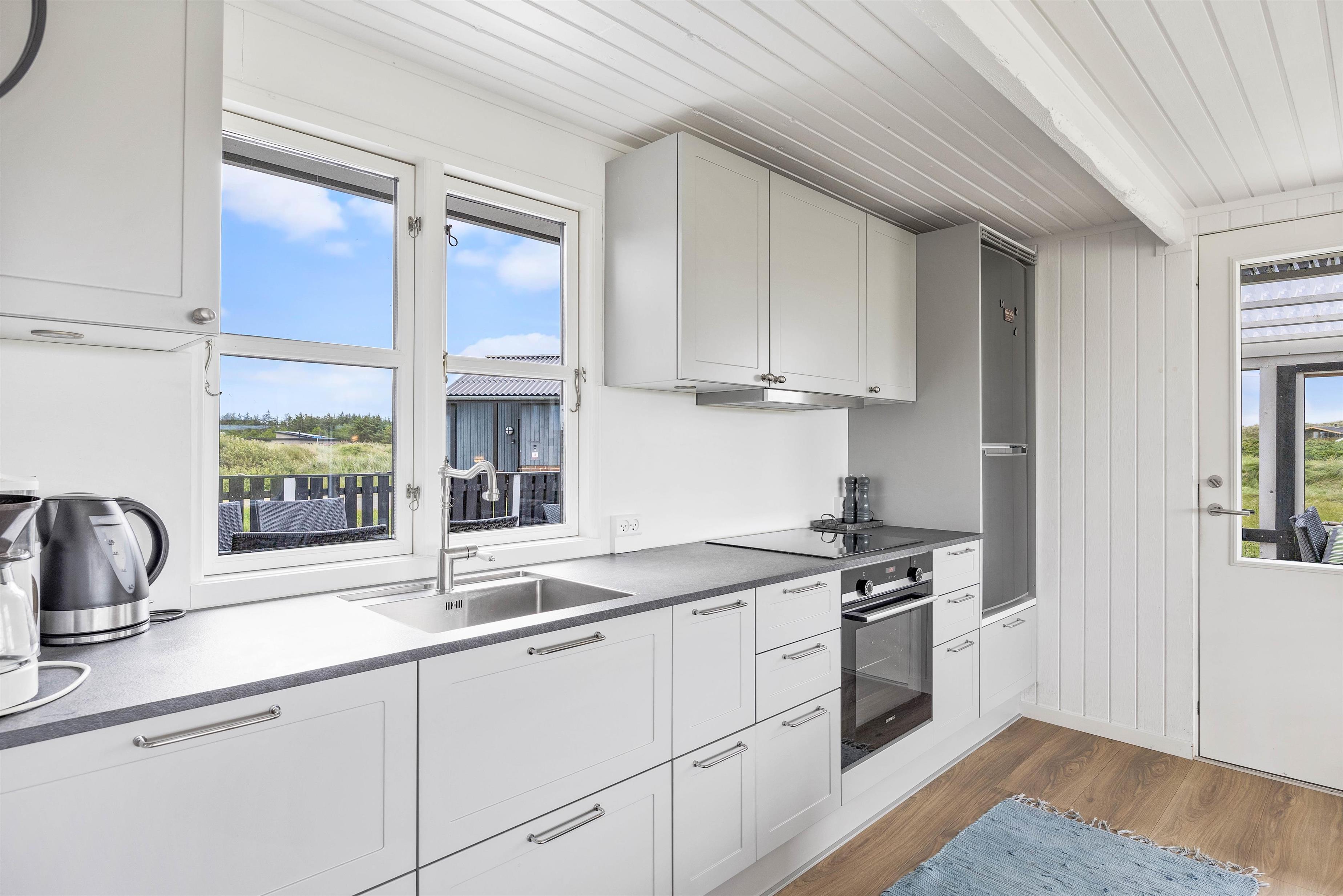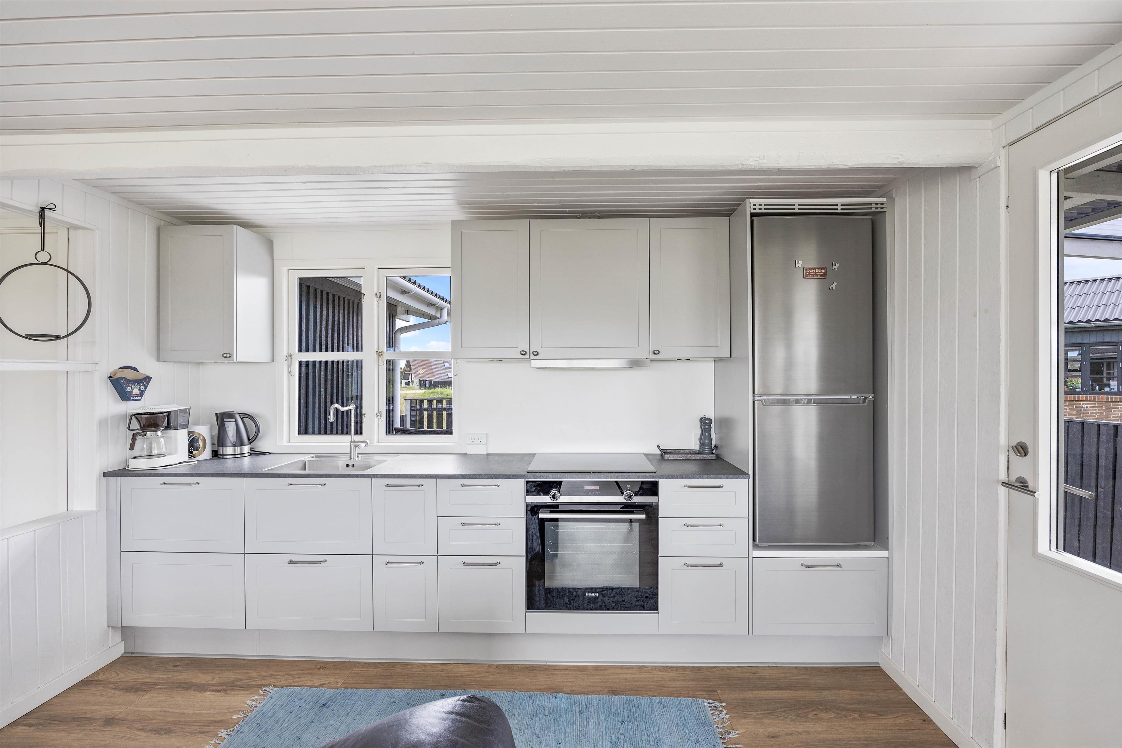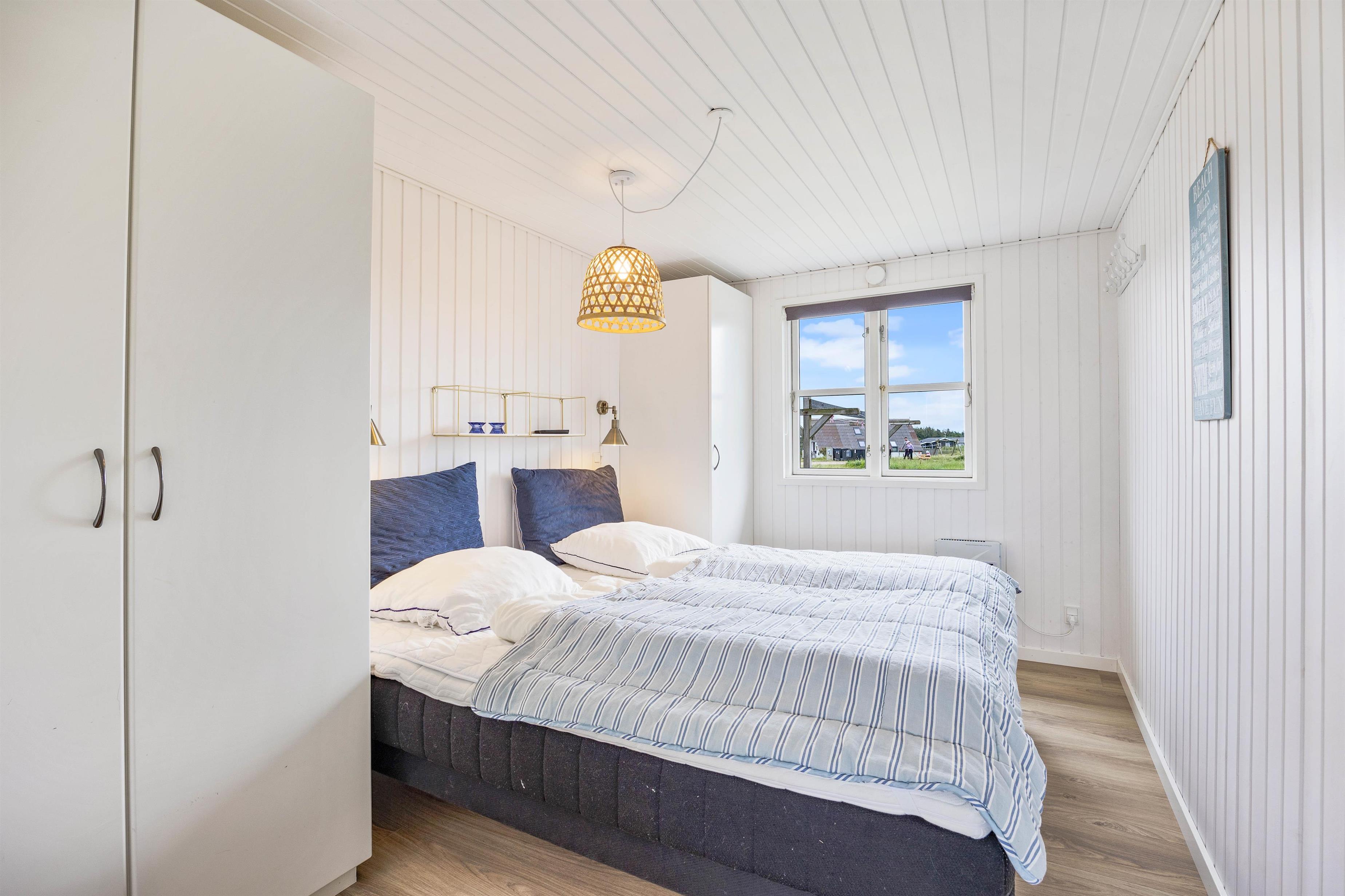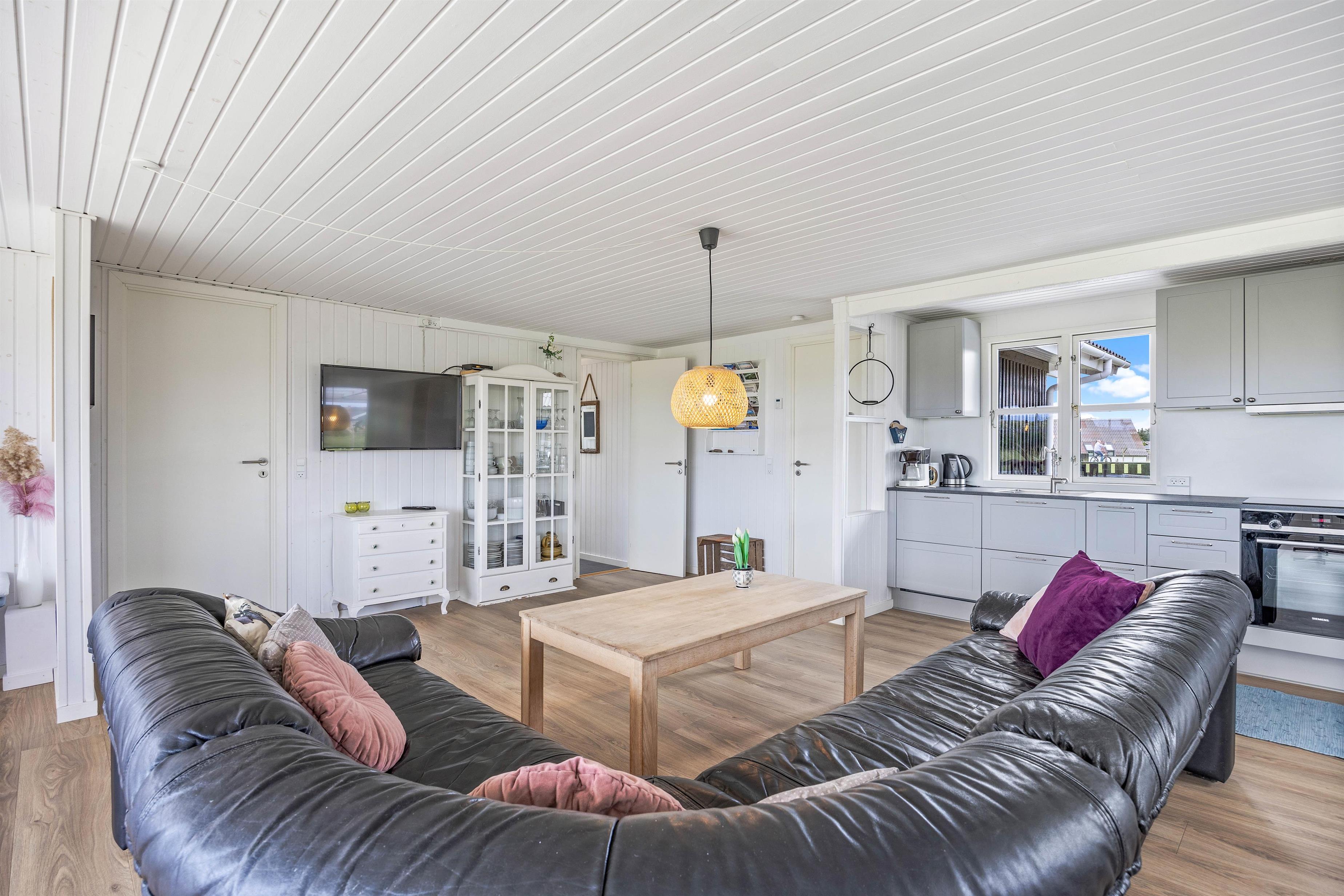 Det klassiske træsommerhus er blevet renoveret i 2020 og byder på skønne detaljer ude såvel som inde. Og det er umuligt ikke at komme i den helt rette feriestemning, så snart man træder indenfor. Huset er smagfuldt og hyggelig indrettet med lyse farver, og det er tydeligt at mærke, at der er tænkt på gæsternes komfort og velvære. Den store flydersofa indbyder da også til, at I smækker benene op og læner hovedet tilbage og overgiver jer til ferieroen.