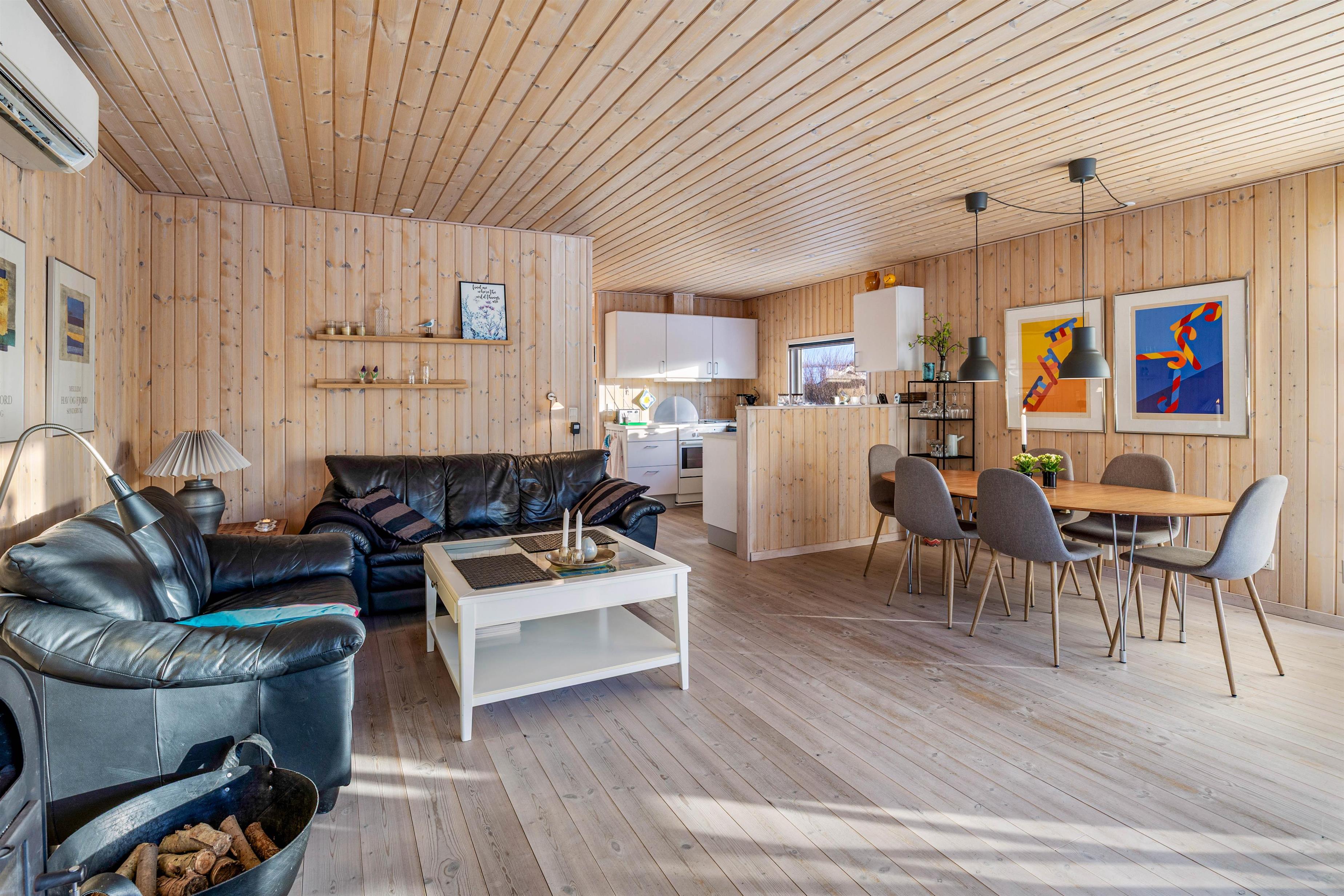 Efter en dag med strand, natur og oplevelser kan I slappe af i den hyggelige opholdsstue. Sæt jer godt til rette i sofaen, spil brætspil eller se en god film, mens brændeovnen spreder varme og ægte sommerhusstemning på køligere aftener. Som alternativ kan den energibesparende luft-til-luft varmepumpe benyttes, hvilket sikrer et behageligt indeklima året rundt.