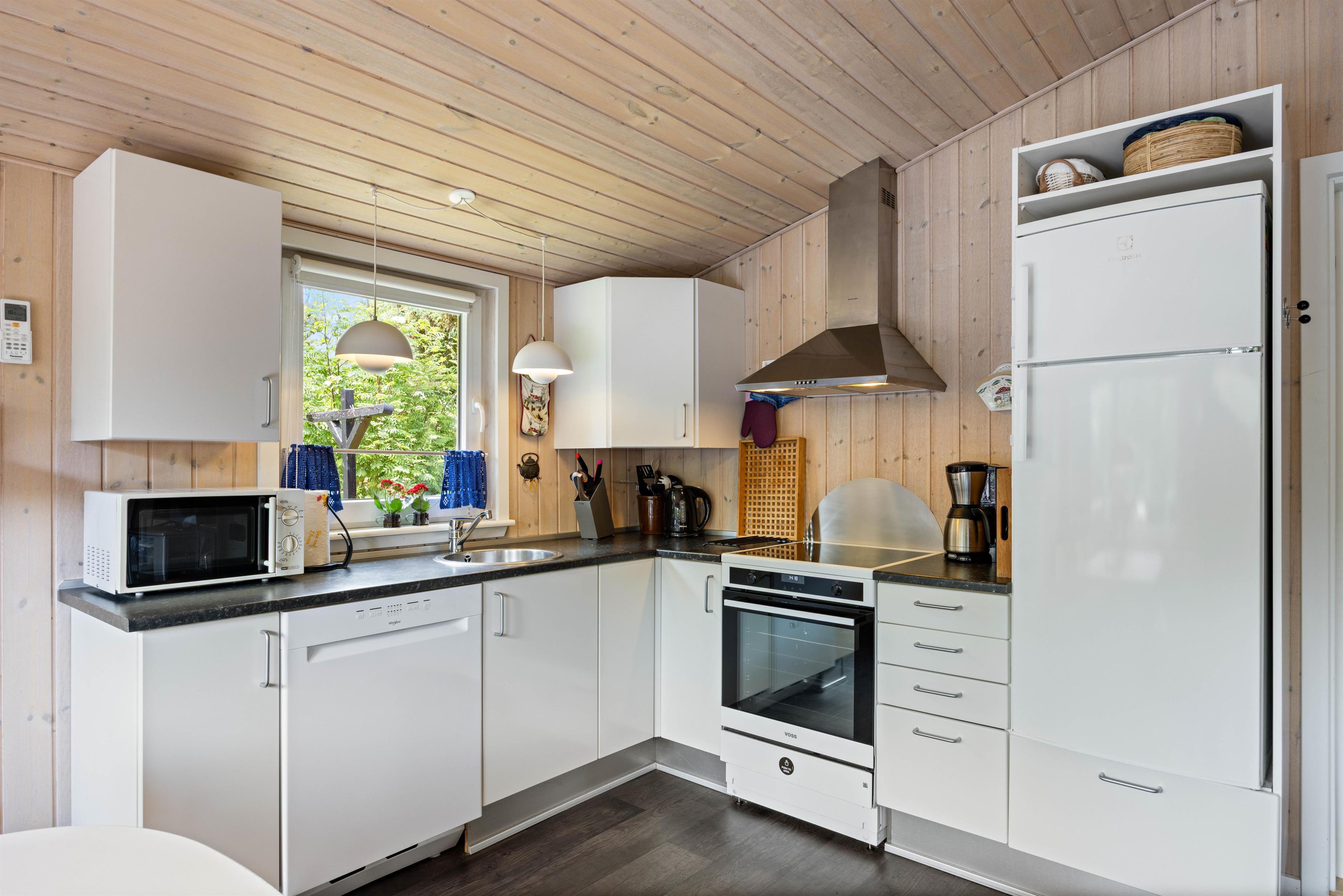 Stue, spisestue og køkken ligger i åben forbindelse med hinanden, et rum hvor mange gode timer kan tilbringes. Tænd for brændeovnen og lad varmen og hyggen strømme igennem rummet - og med brændeovnsgitteret rundt om brændeovnen kan du slappe helt af også når der er børn og hund med. Underholdning er også garanteret med Chromecast, der giver mulighed for at streame netop jeres yndlingsindhold direkte til TV'et. Feriehusets luft-til-luft varmepumpe sørger for et behageligt indeklima året rundt. Her er alt hvad I får brug for, for at holde en afslappende og god ferie.