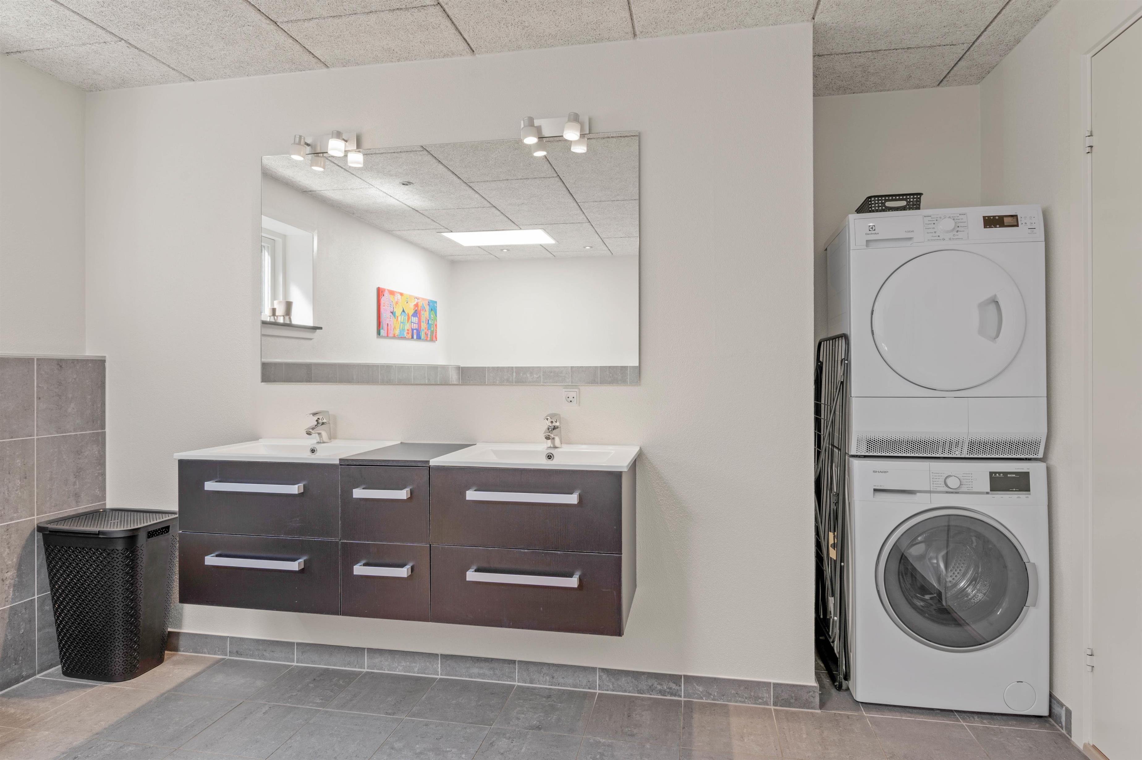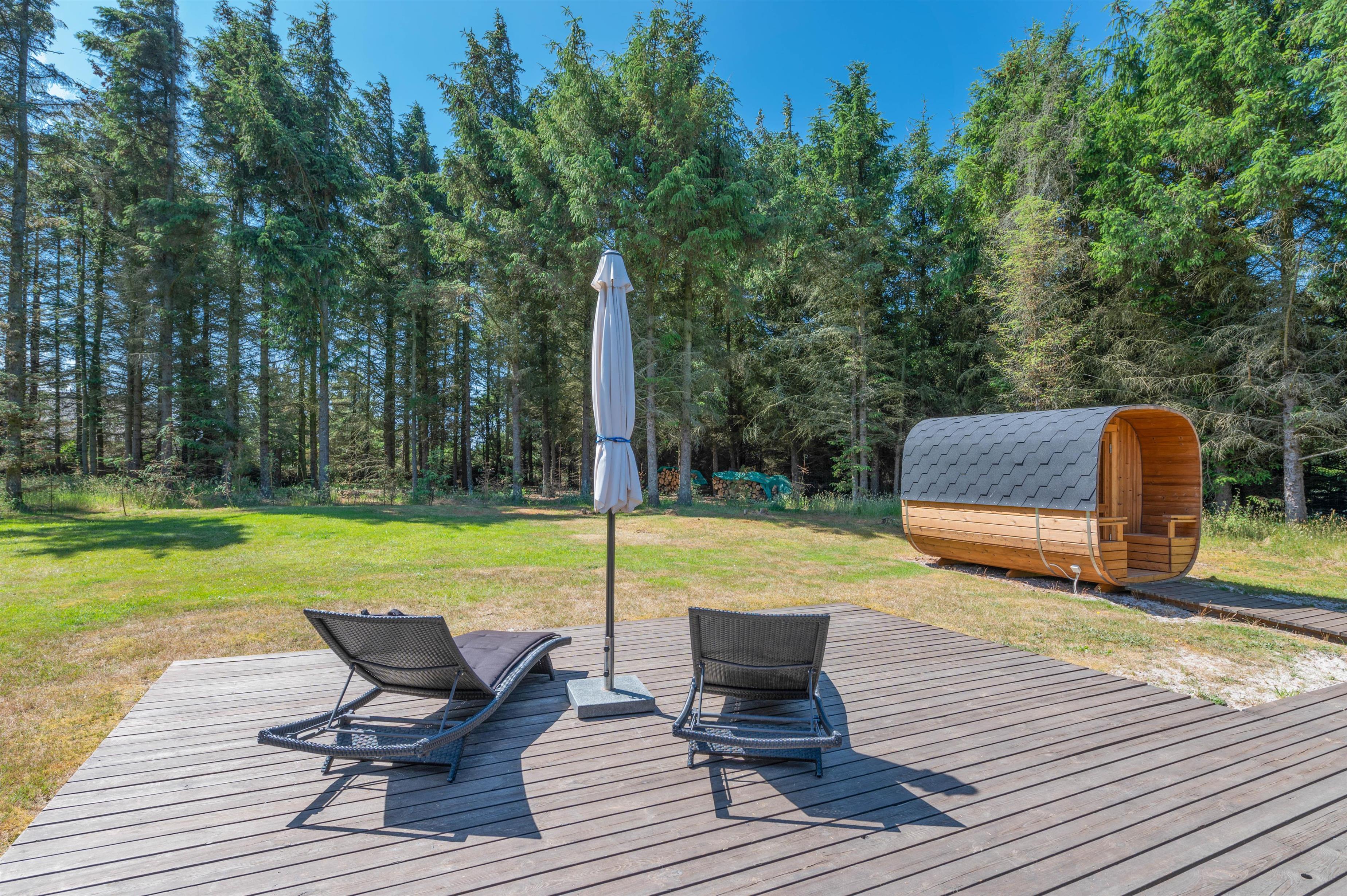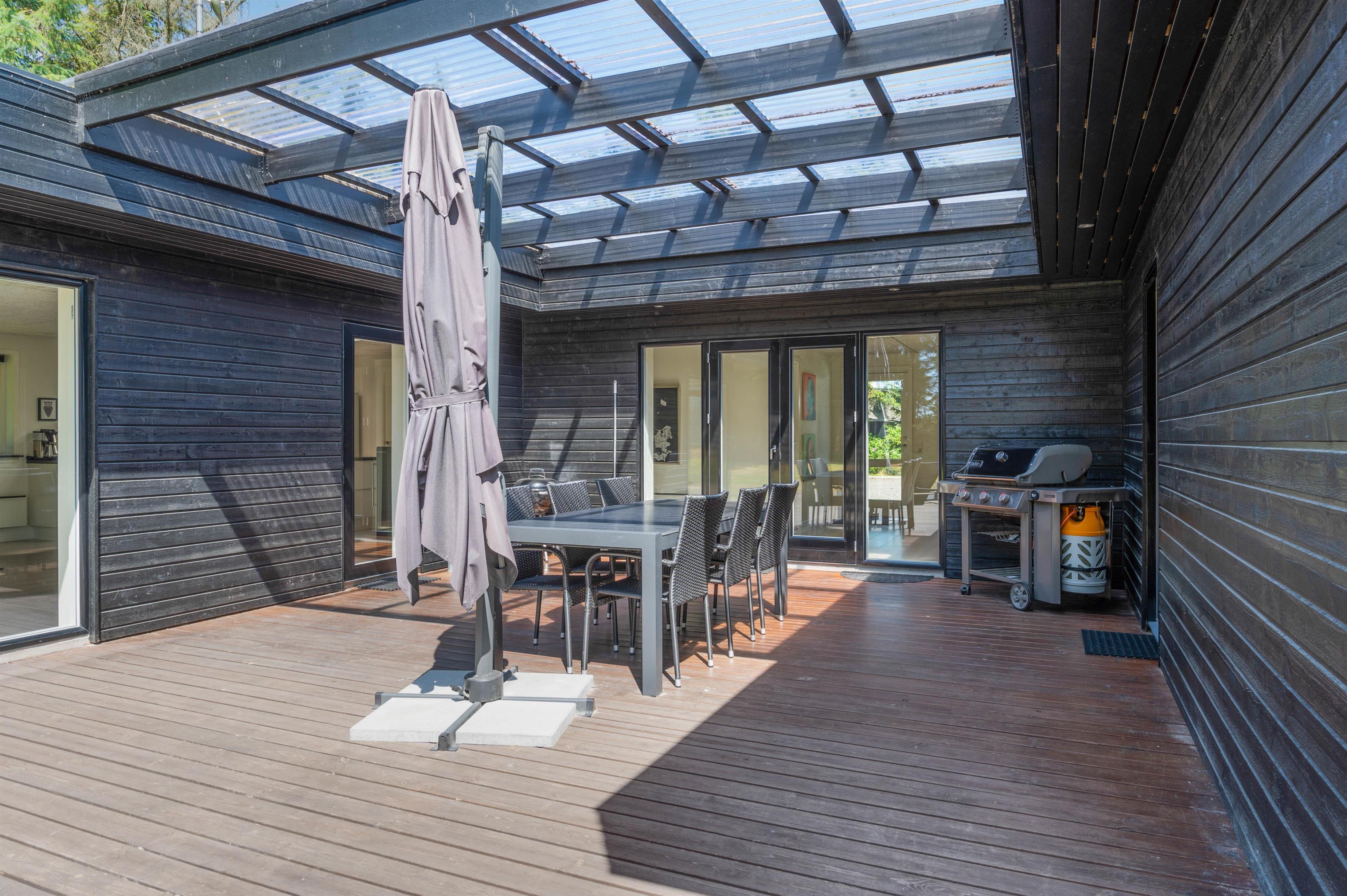 En af de mange fordele ved dette arkitekttegnede aktivitetshus er, at 2700 m2 af den fuldstændig ugenerede naturgrund er helt lukket af. Her kan I altså trygt lade børnene lege selv eller lukke hunden ud. Mod syd har huset en lækker træterrasse med havemøbler, liggestole og grill.