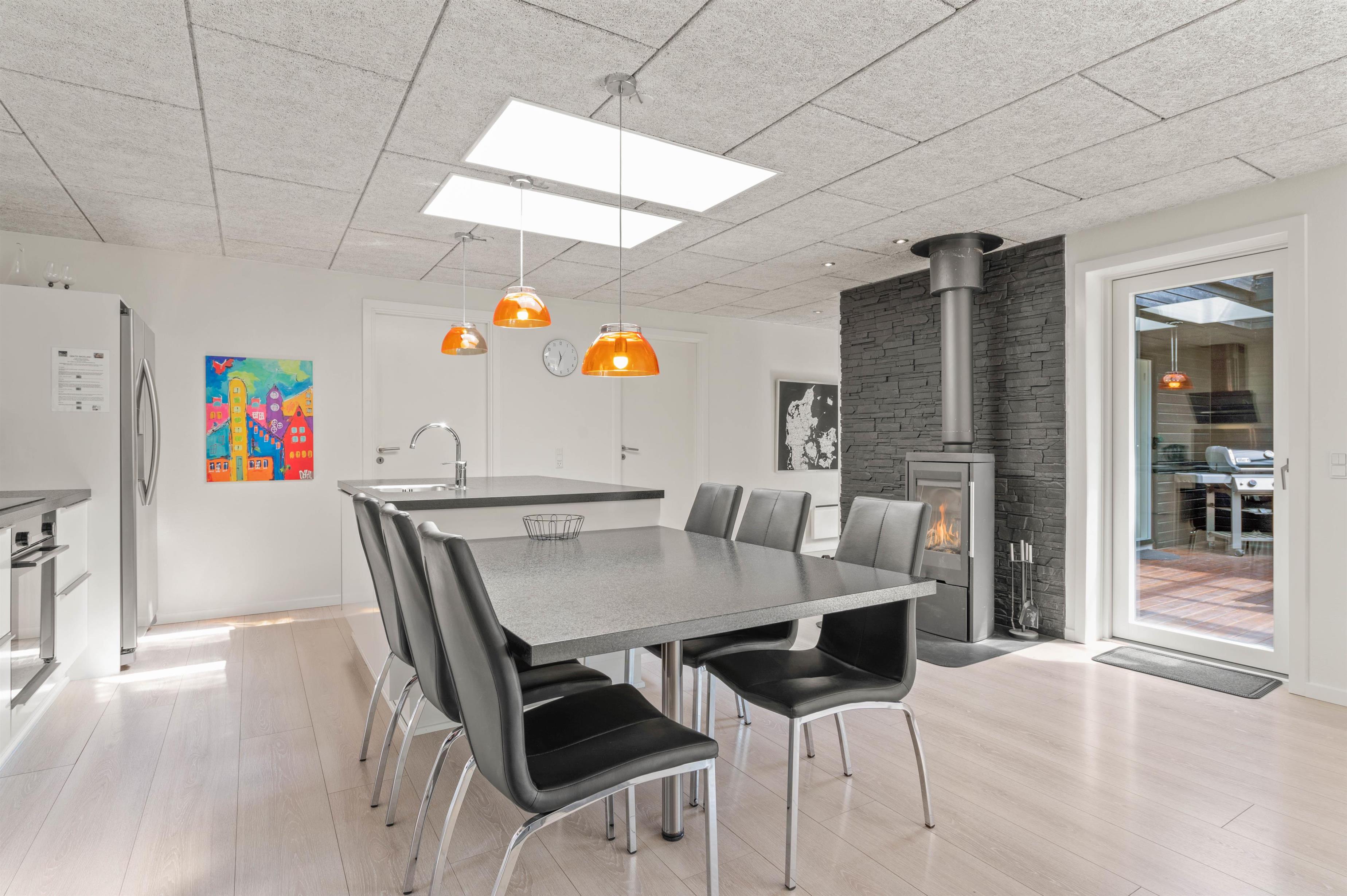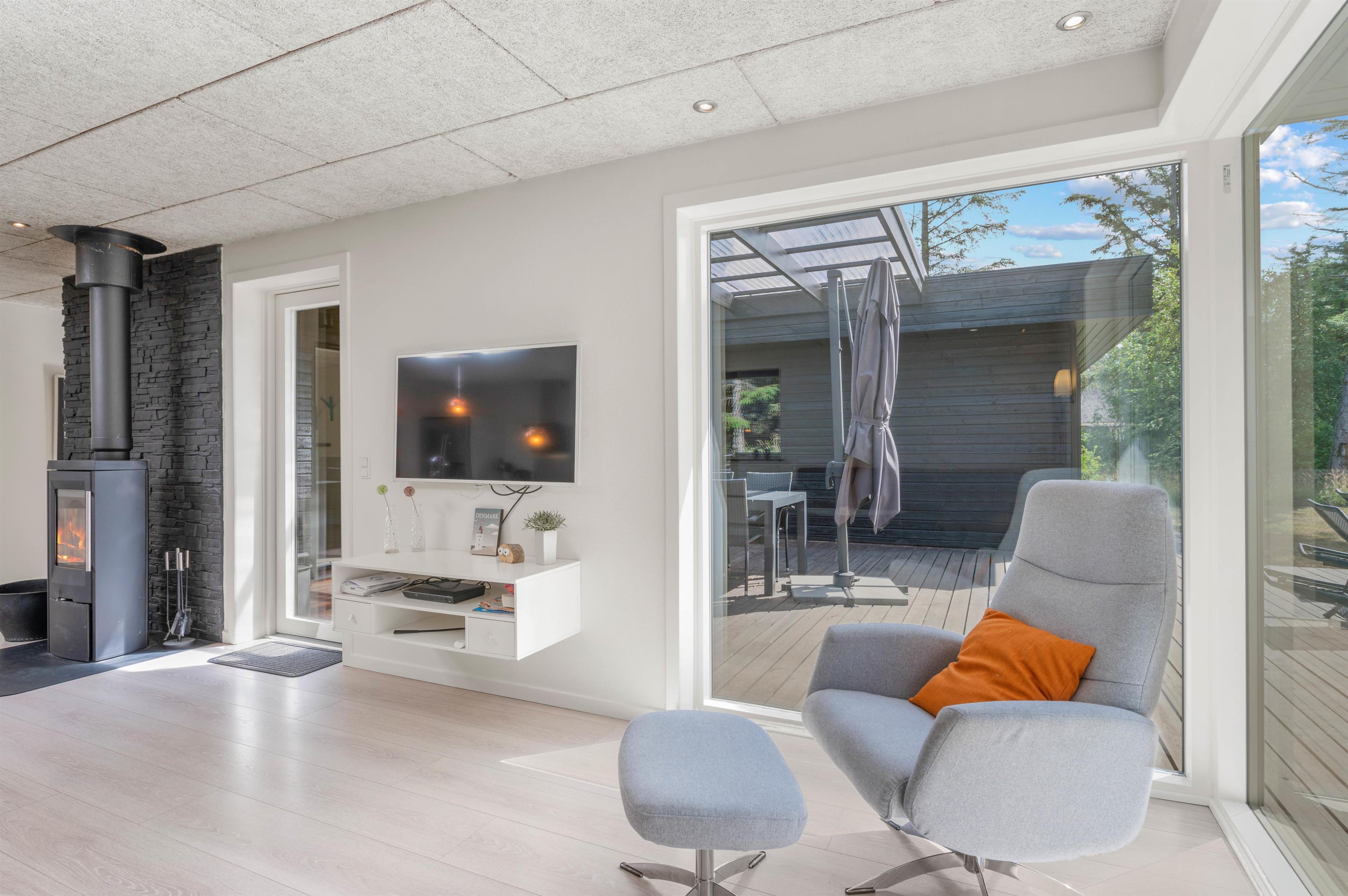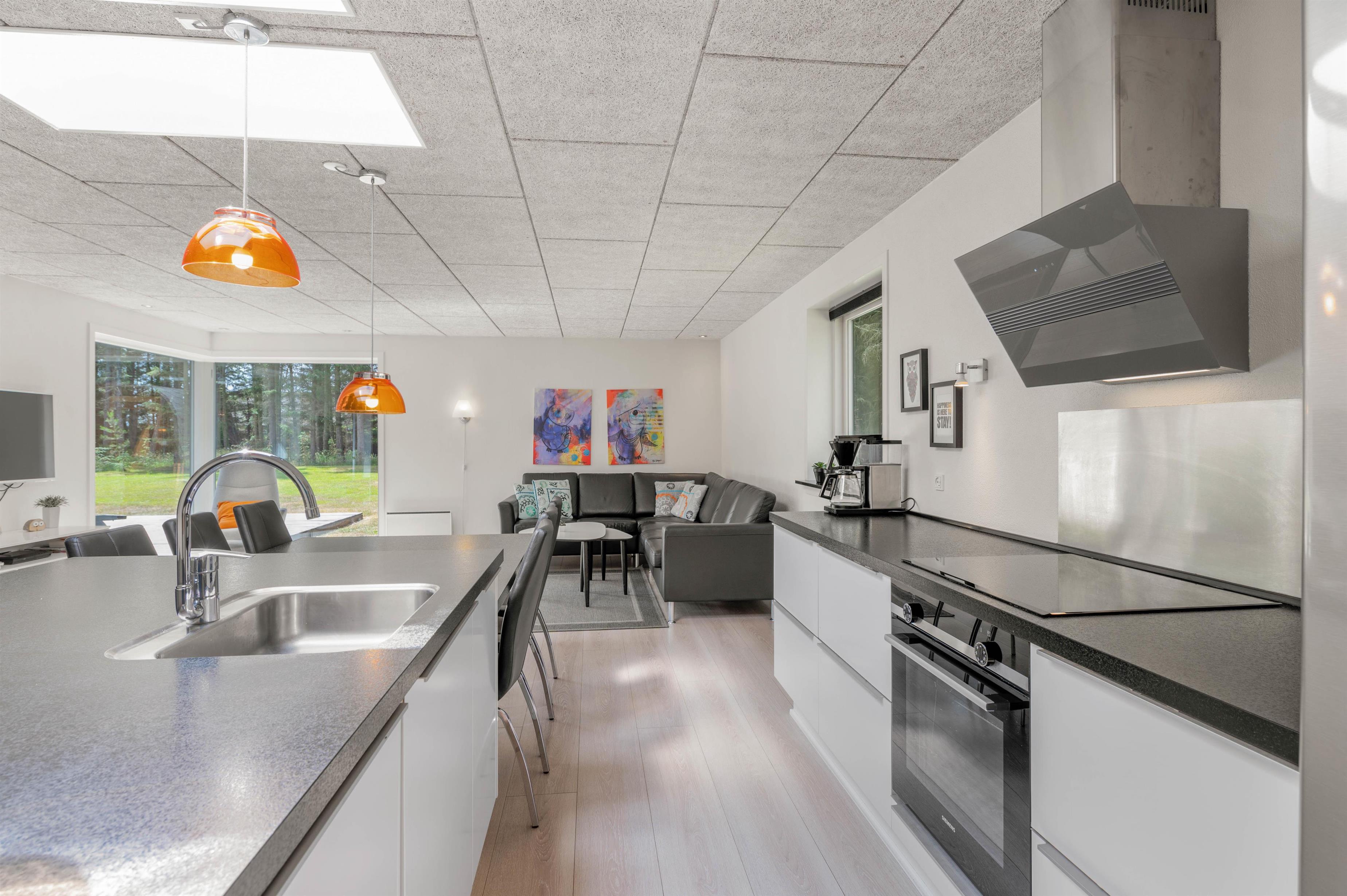 Det flotte sommerhus byder på en lys og lækker indretning med et flot og veludstyret køkken i åben forbindelse med stuen. Her kan du tænde op i brændeovnen og se en god film eller høre radio og afspille cd'er via fladskærmstv'et og dvd-afspilleren. Der er naturligvis også en trådløs internetforbindelse