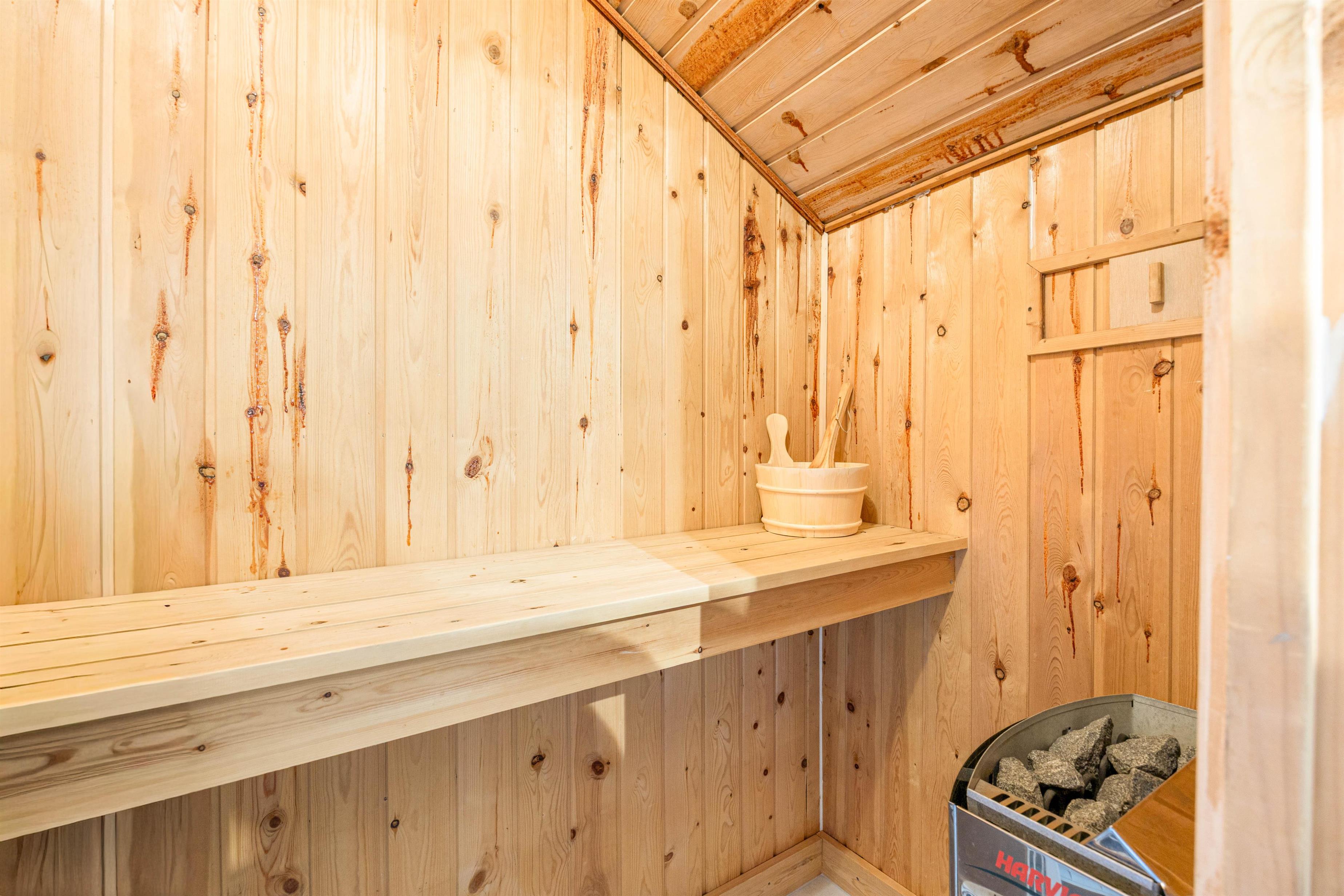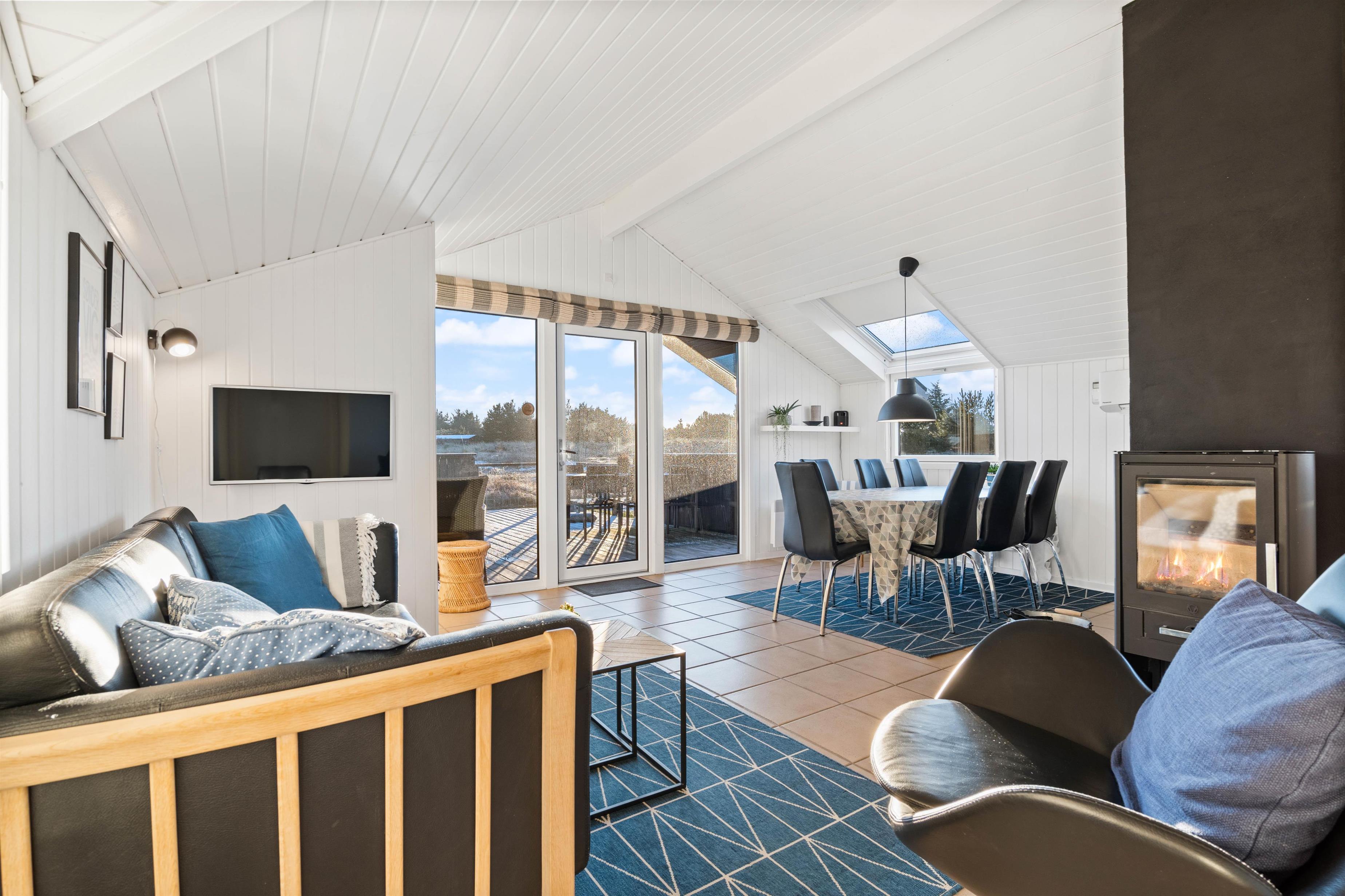 Et dejligt og rigtig hyggeligt indrettet feriehus med et flot lysindfald fra det store vinduesparti mod terrassen samt ovenlysvinduet. Her kommer den smukke natur helt ind i stuen. Huset har 3 gode soveværelser med dobbeltsenge og et fint lille badeværelse med indgang til saunaen, hvor I rigtig kan blive varmet igennem efter en god og aktiv feriedag.