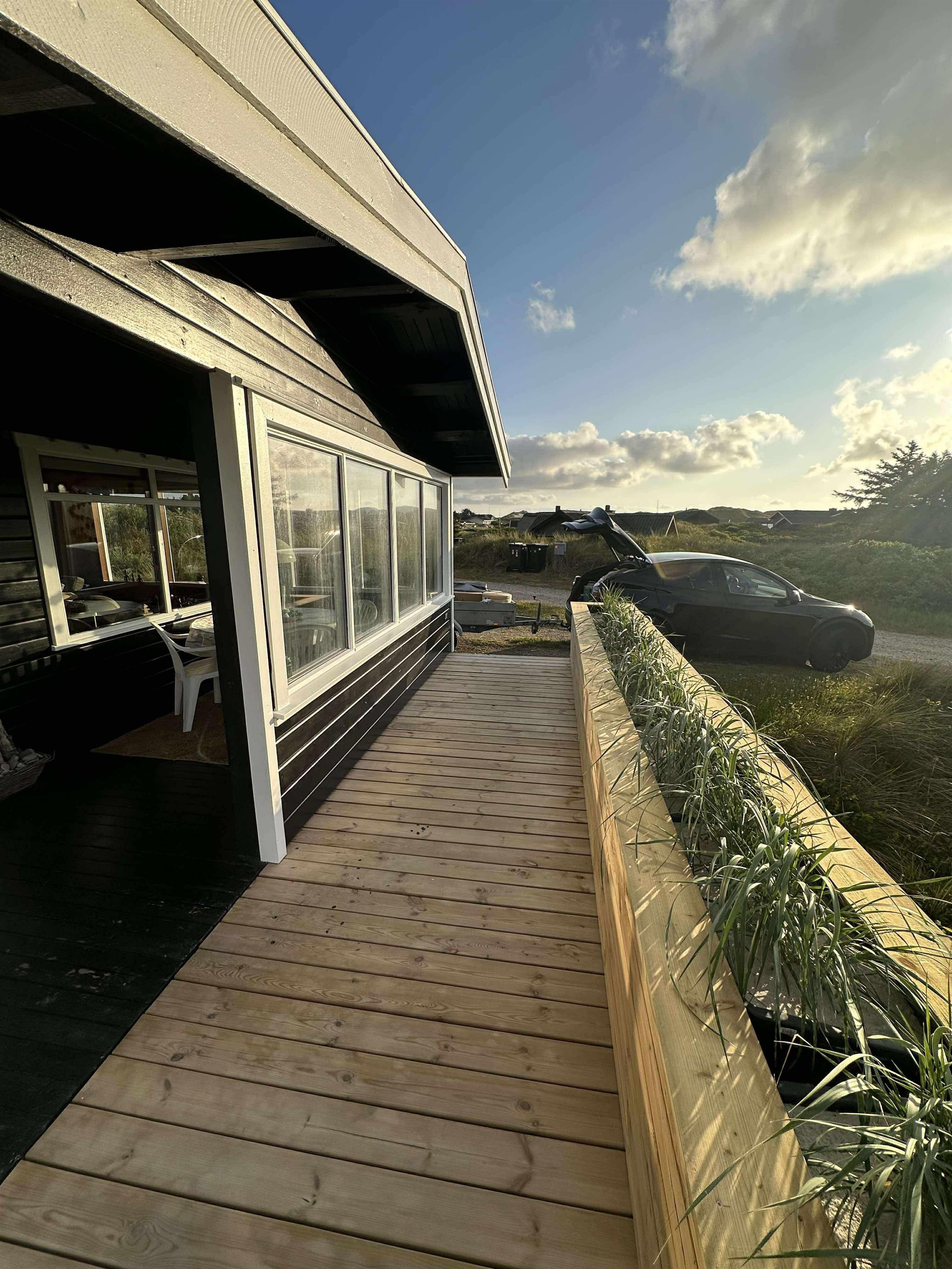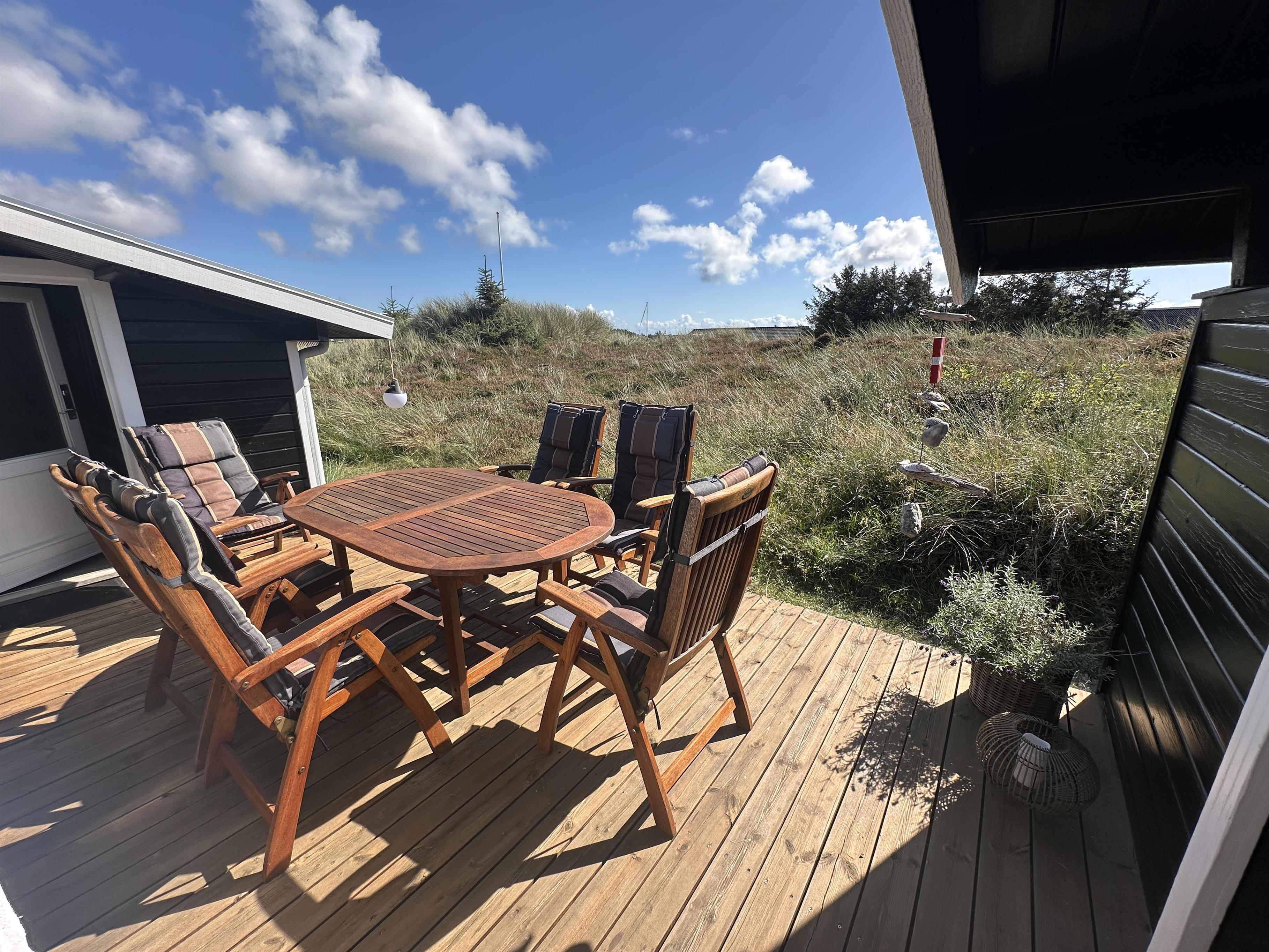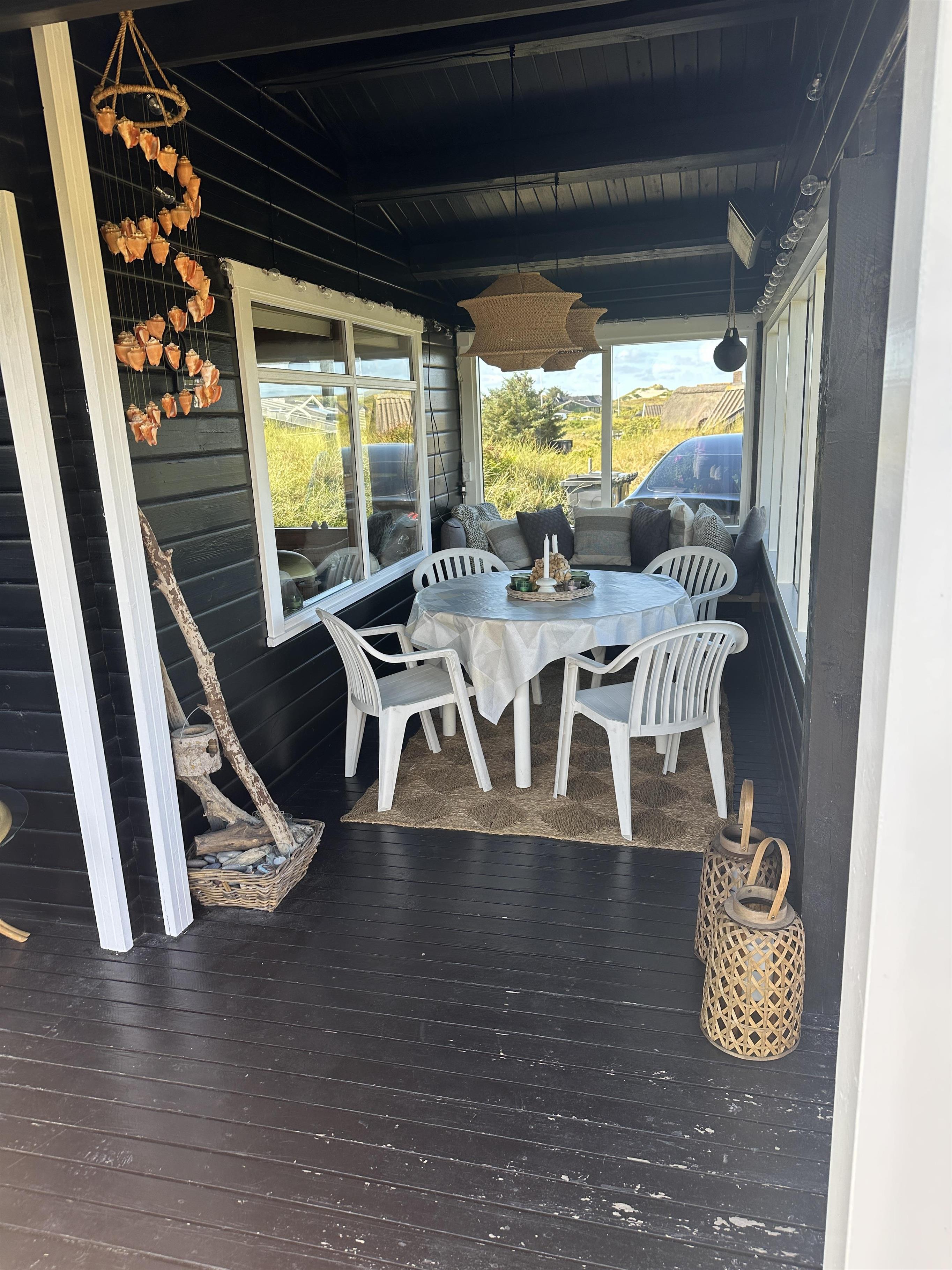 Når solen står højt på himlen, er det dejligt at sidde på terrassen og nyde det gode vejr, duften af naturen og feriens ro. I det tidlige forår, når det stadig er for koldt til at sidde ude, har sommerhuset en skøn overdækket terrasse med store vinduer. Her kan du sidde med en god kop kaffe og nyde udsigten. De store vinduer inviterer naturen indenfor, og det føles næsten som at sidde udenfor. Som en ekstra luksus er der sat lyskæder og en varmelampe op, så man rigtig kan hygge sig udendørs – selv på de køligere aftener.