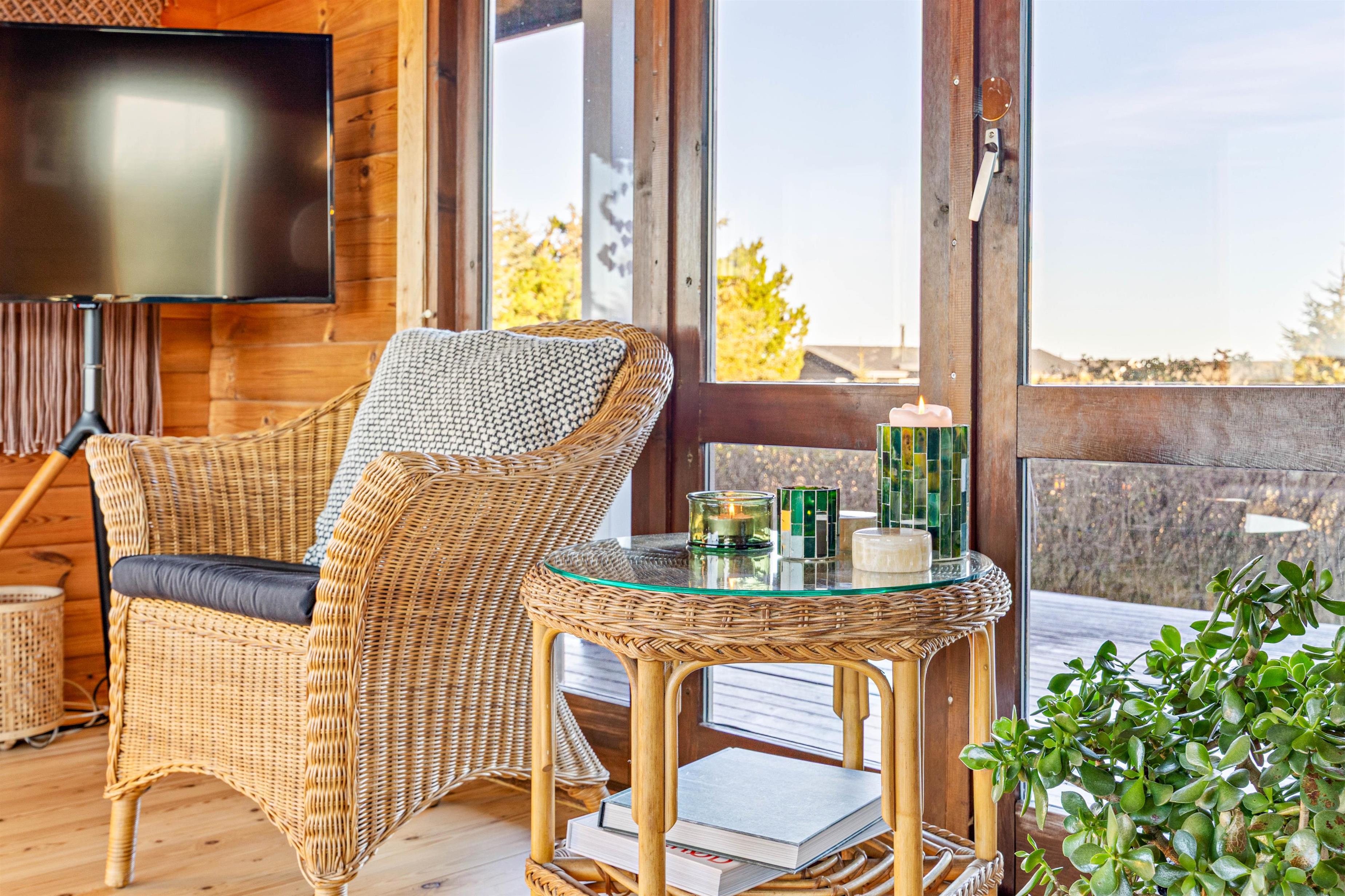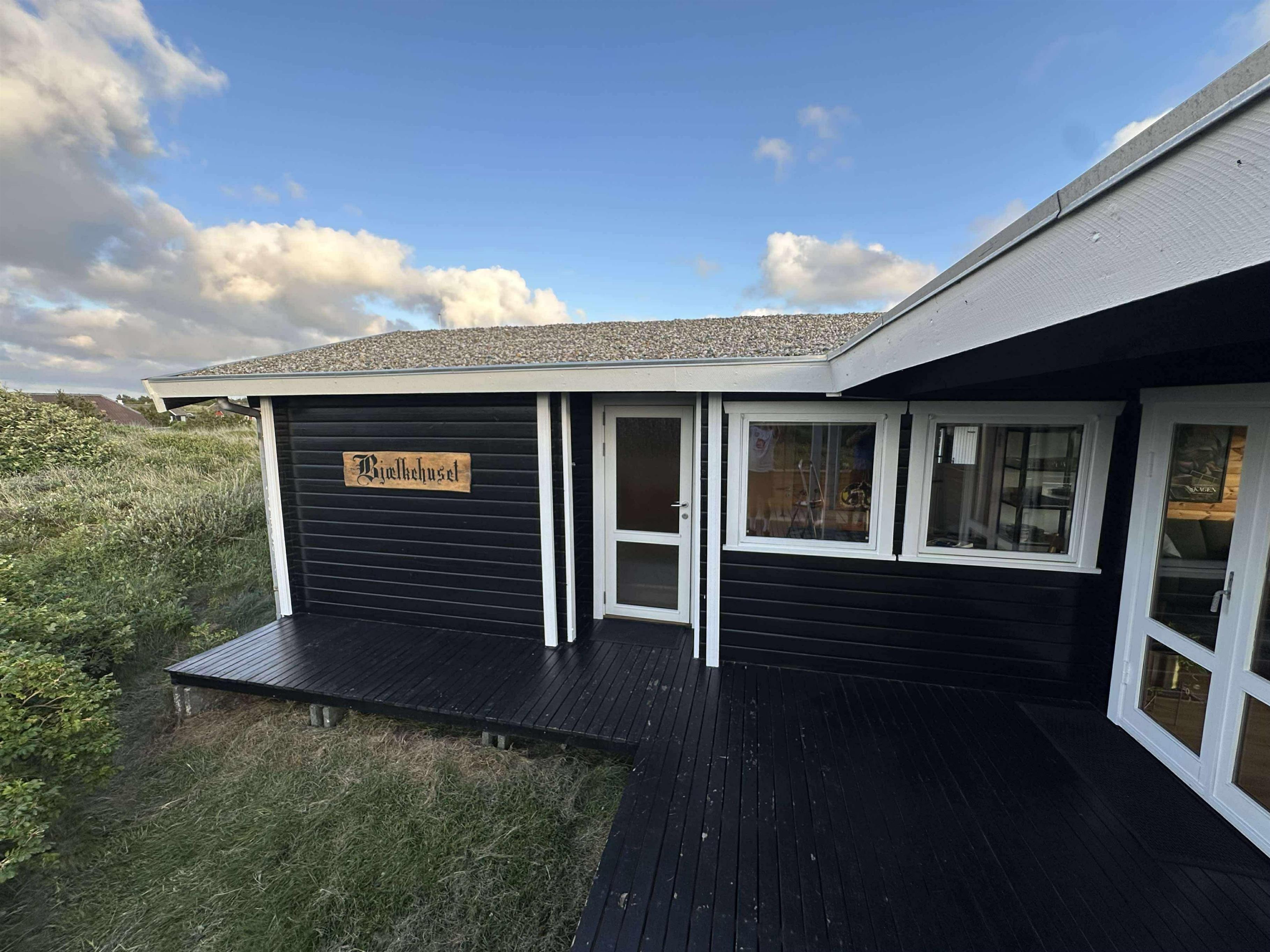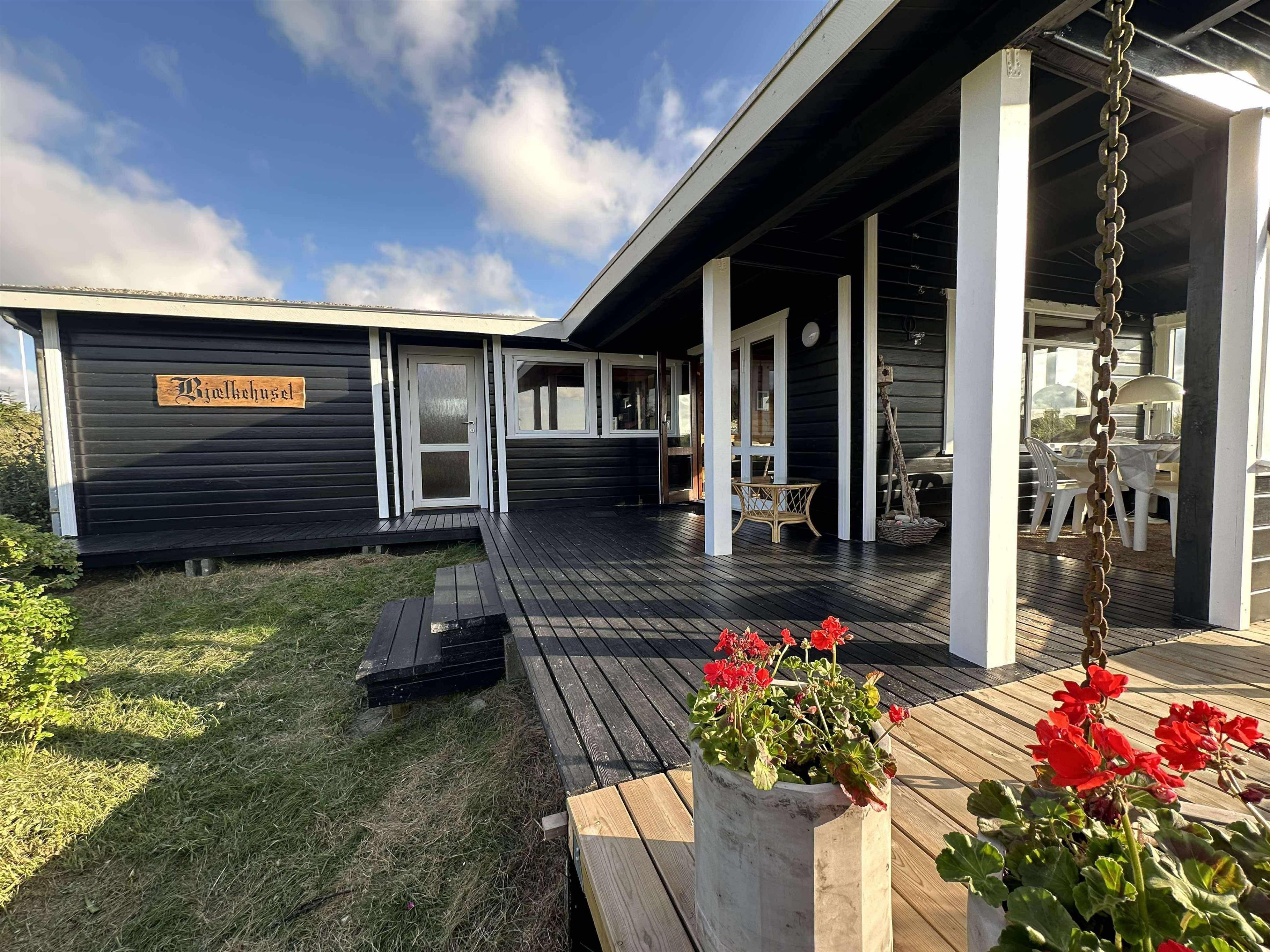 Når solen står højt på himlen, er det dejligt at sidde på terrassen og nyde det gode vejr, duften af naturen og feriens ro. I det tidlige forår, når det stadig er for koldt til at sidde ude, har sommerhuset en skøn overdækket terrasse med store vinduer. Her kan du sidde med en god kop kaffe og nyde udsigten. De store vinduer inviterer naturen indenfor, og det føles næsten som at sidde udenfor. Som en ekstra luksus er der sat lyskæder og en varmelampe op, så man rigtig kan hygge sig udendørs – selv på de køligere aftener.