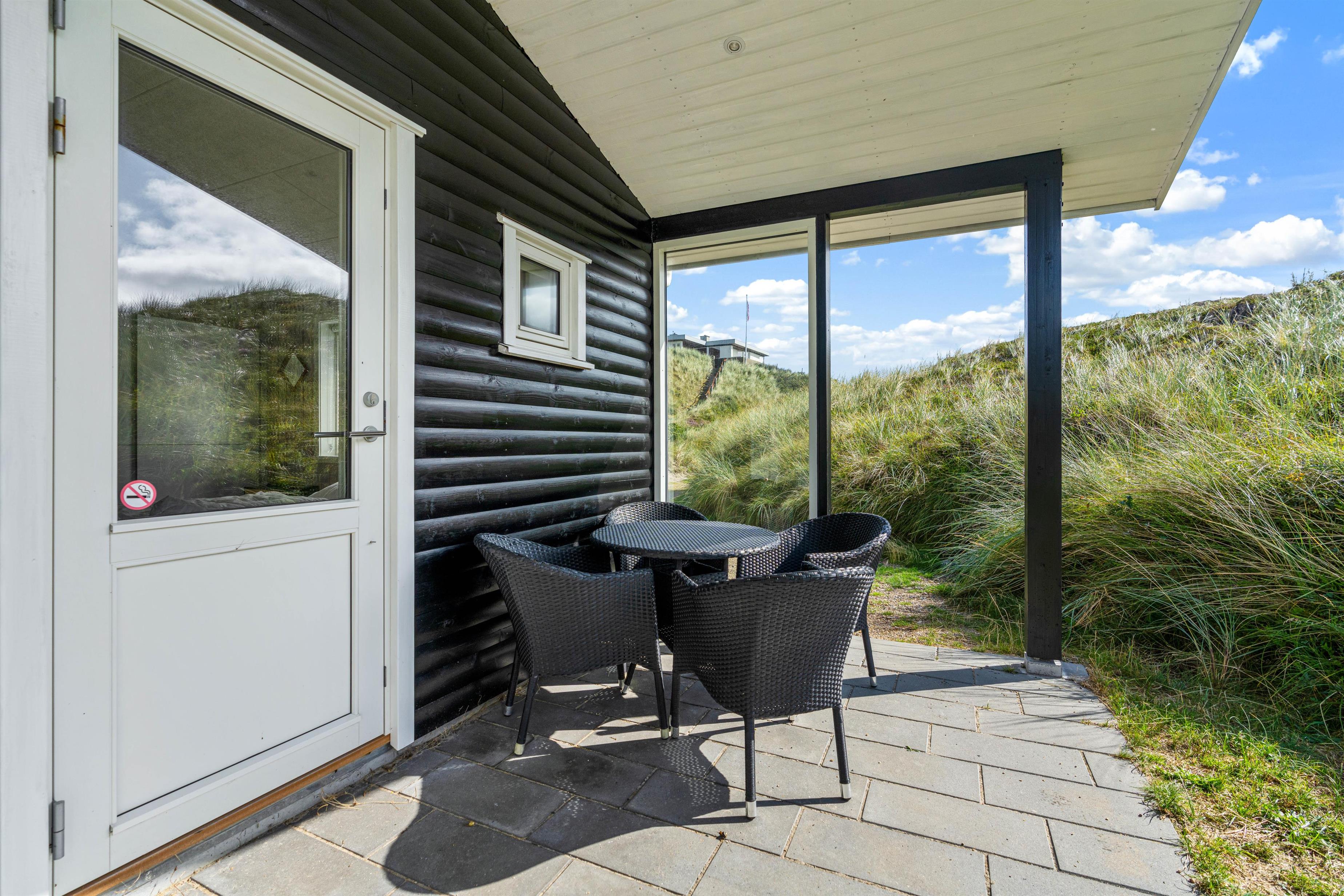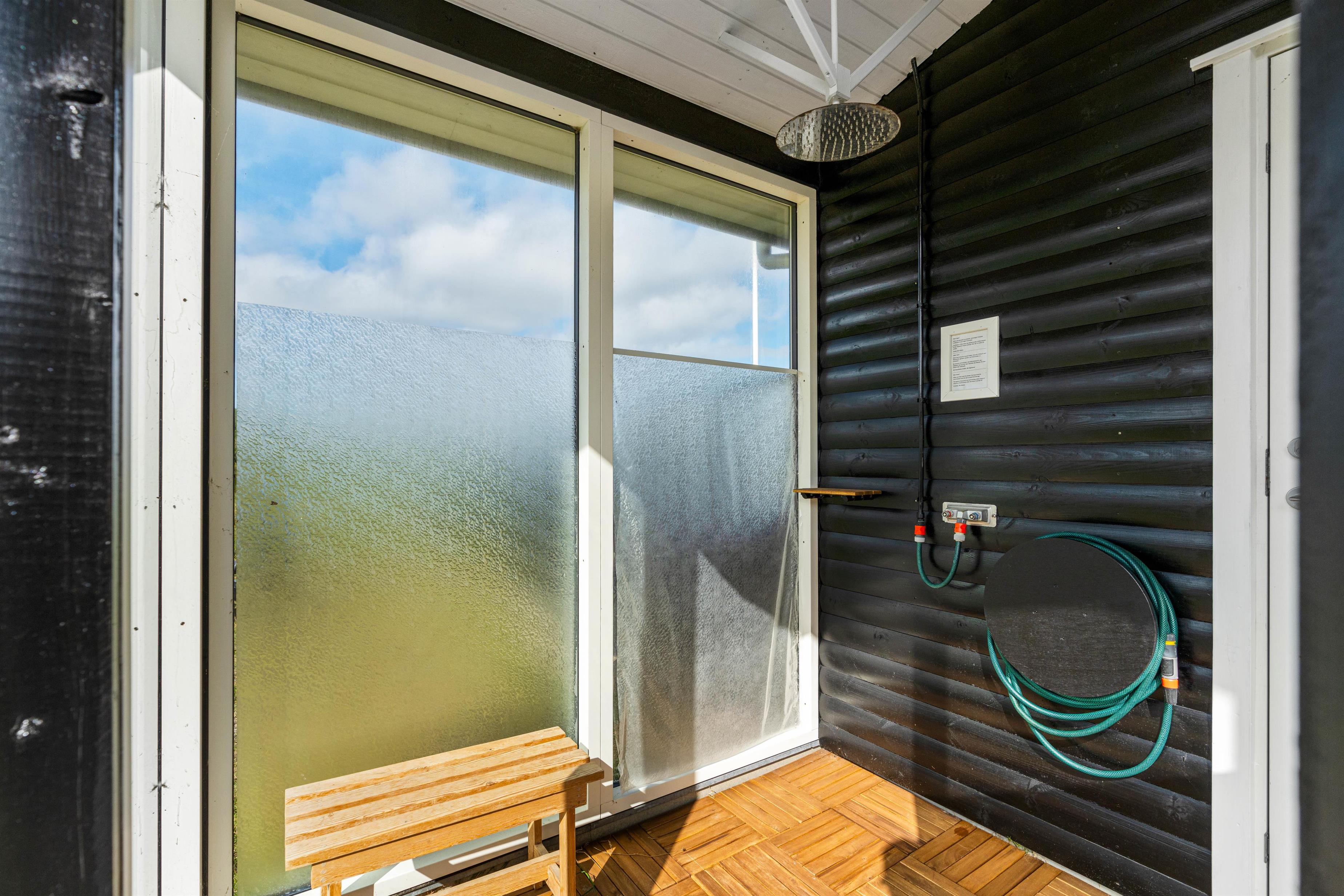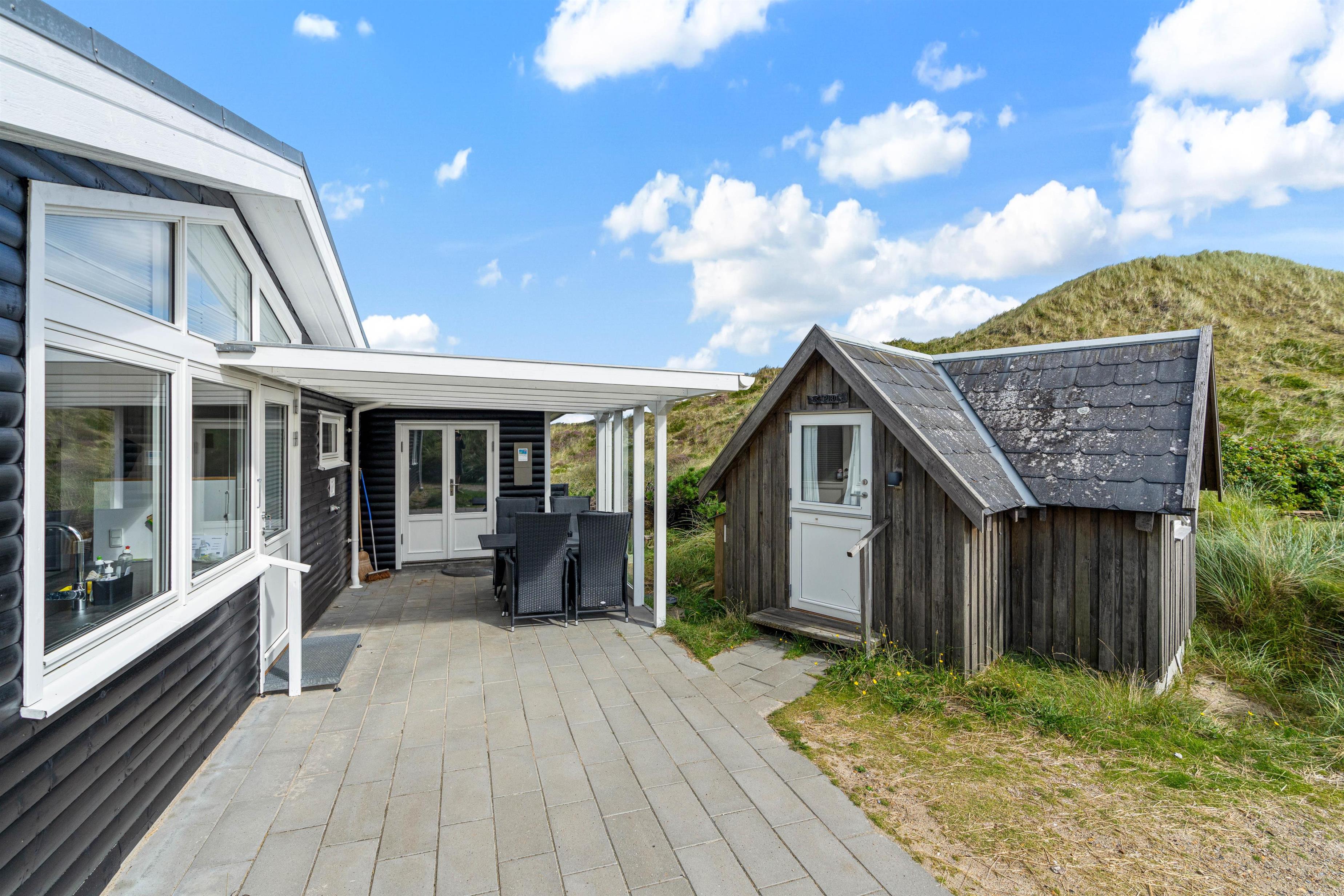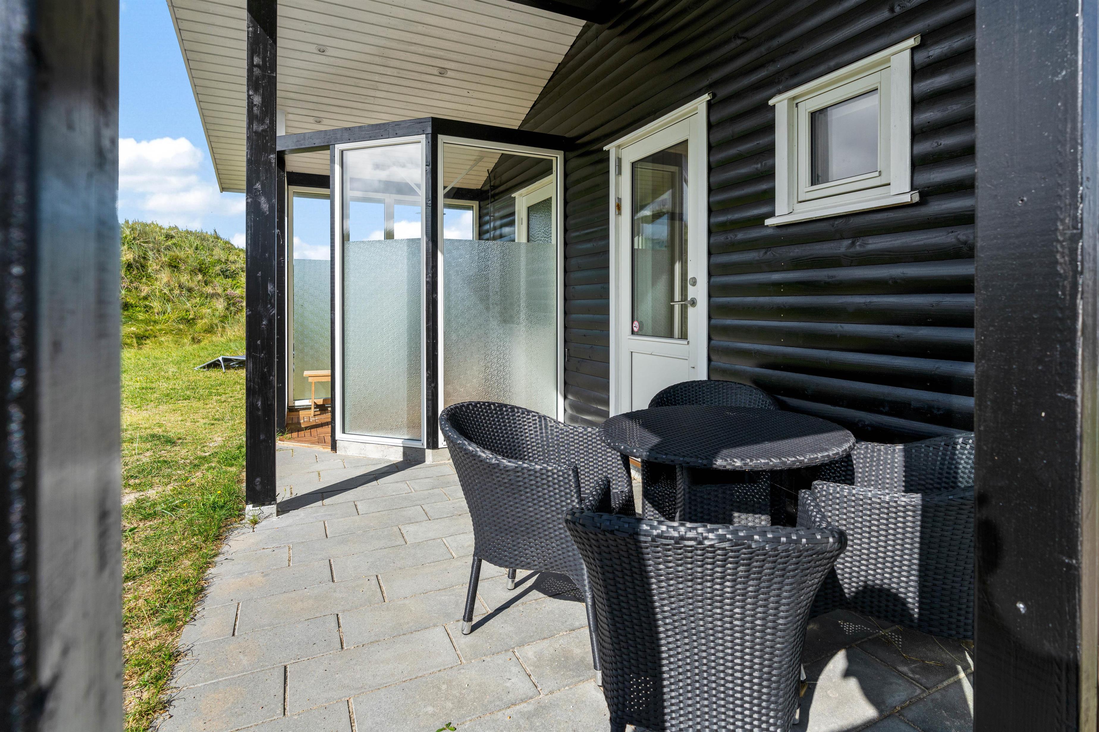 Udendørs har I flere skønne terrasser, hvor I kan finde jer til rette i havemøblerne og liggestolene på de solrige og varme feriedage. Mens I slapper af og nyder ferien på en af terrasserne, kan I høre lyden af brændingen i baggrunden. På sommerhusets udeområde har I desuden en udebruser, hvor I kan skylle det sidste sand af tæerne efter en tur på stranden. Den udendørs bruser kan benyttes i perioden april til november.