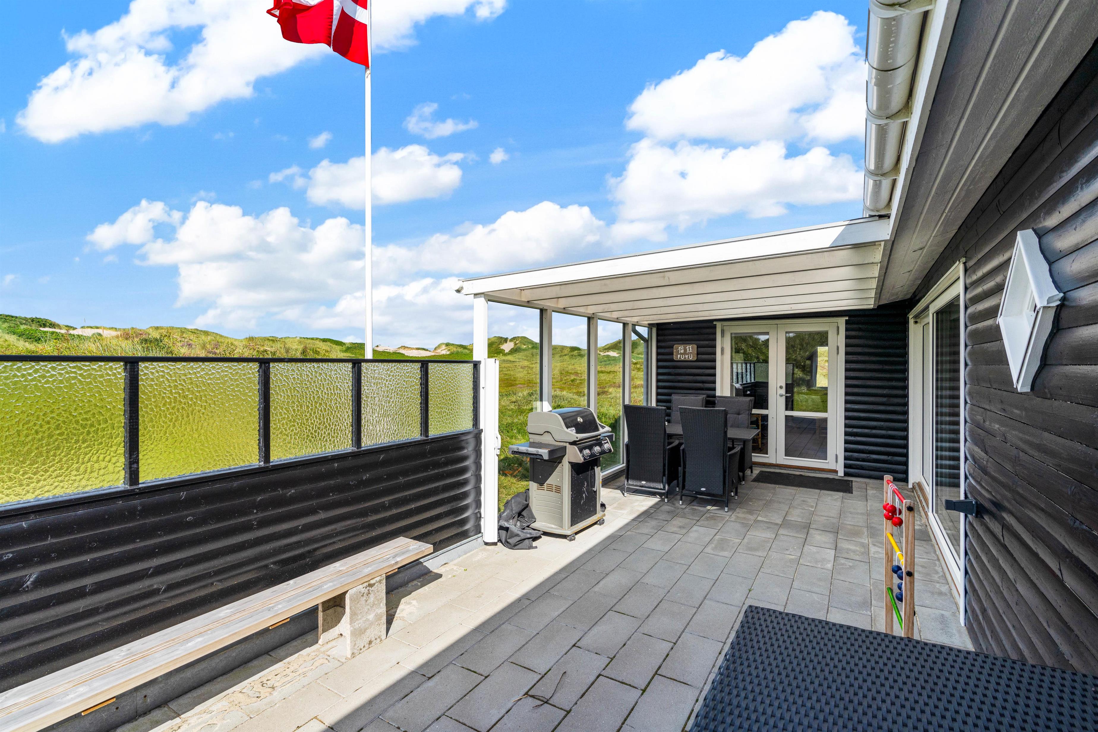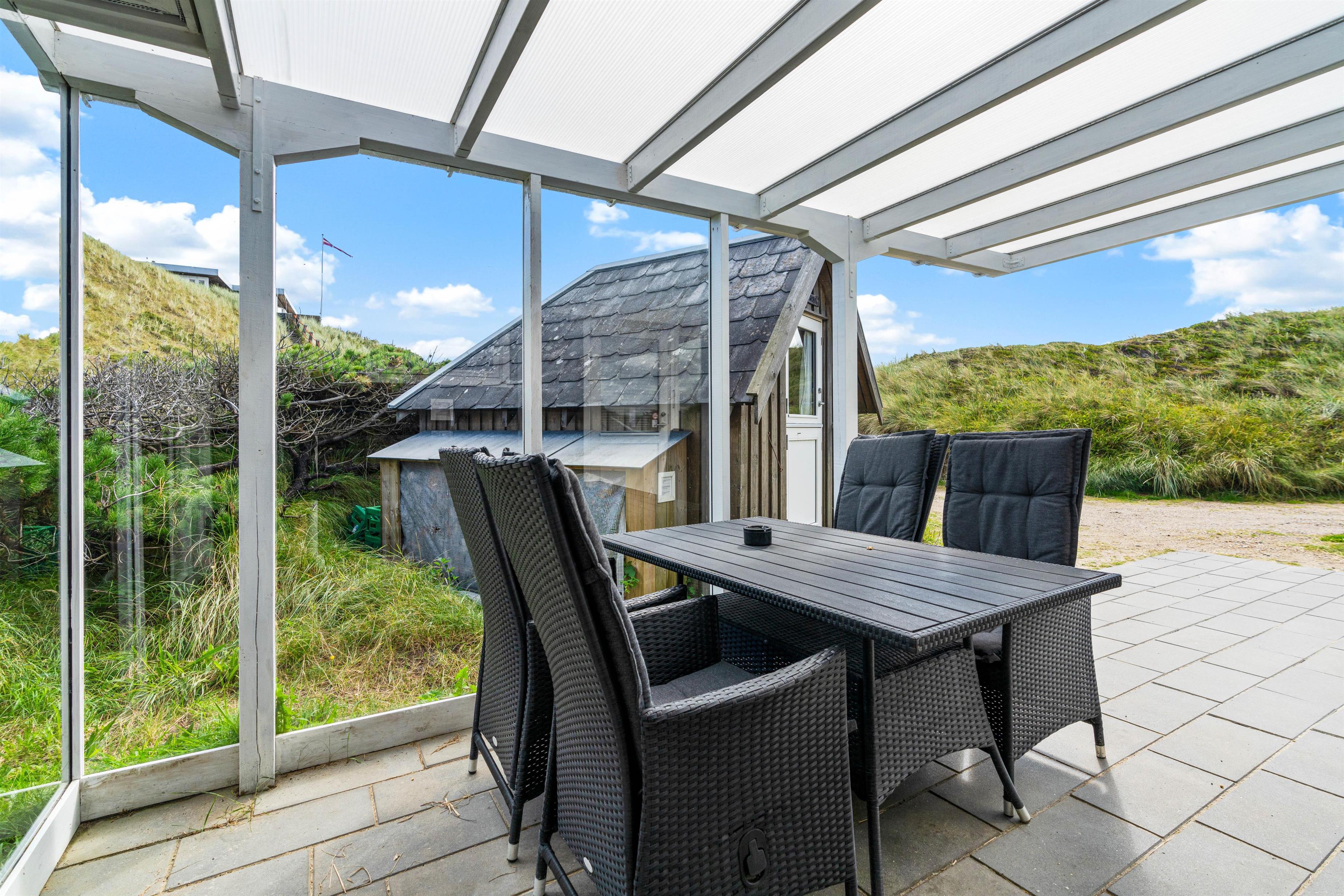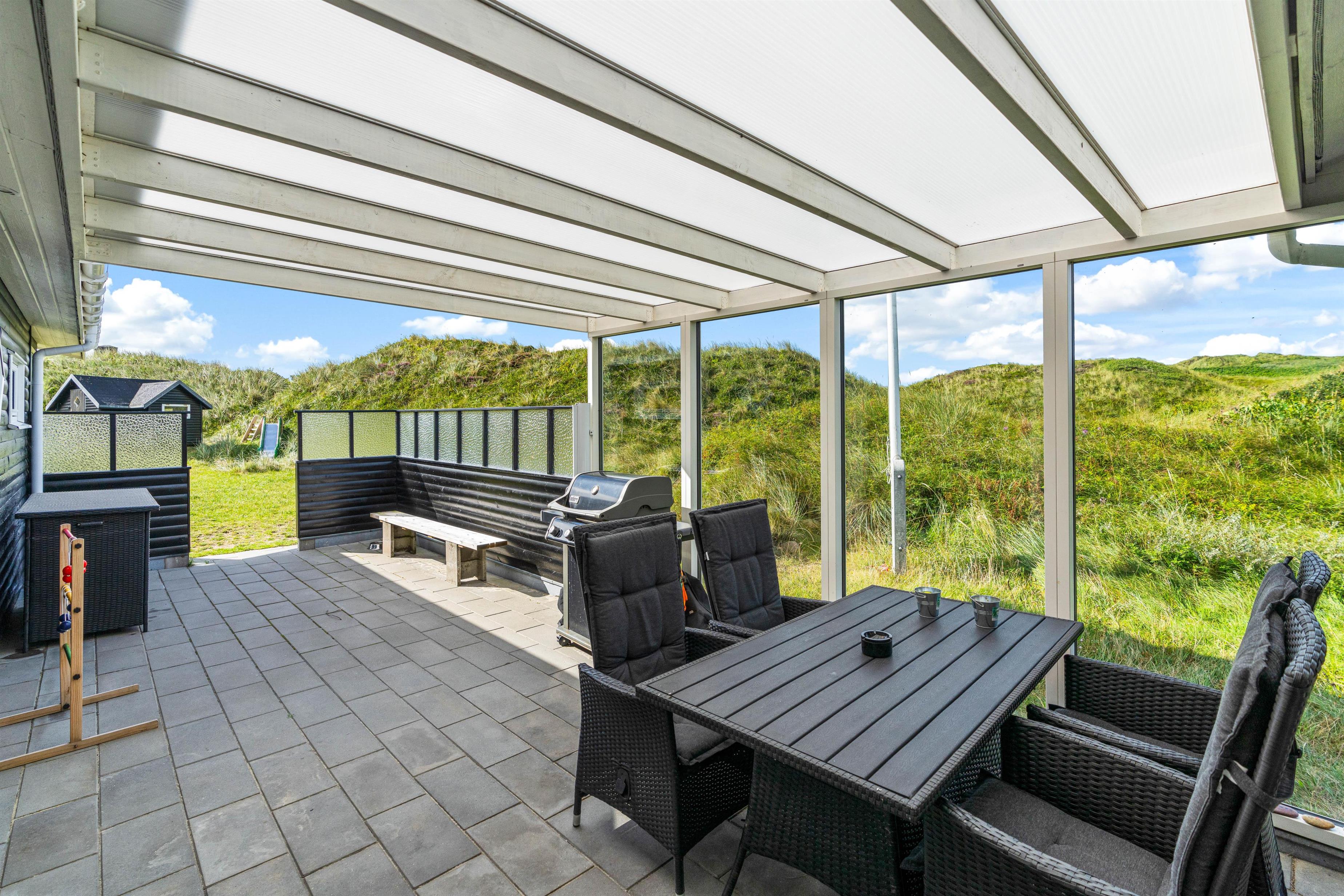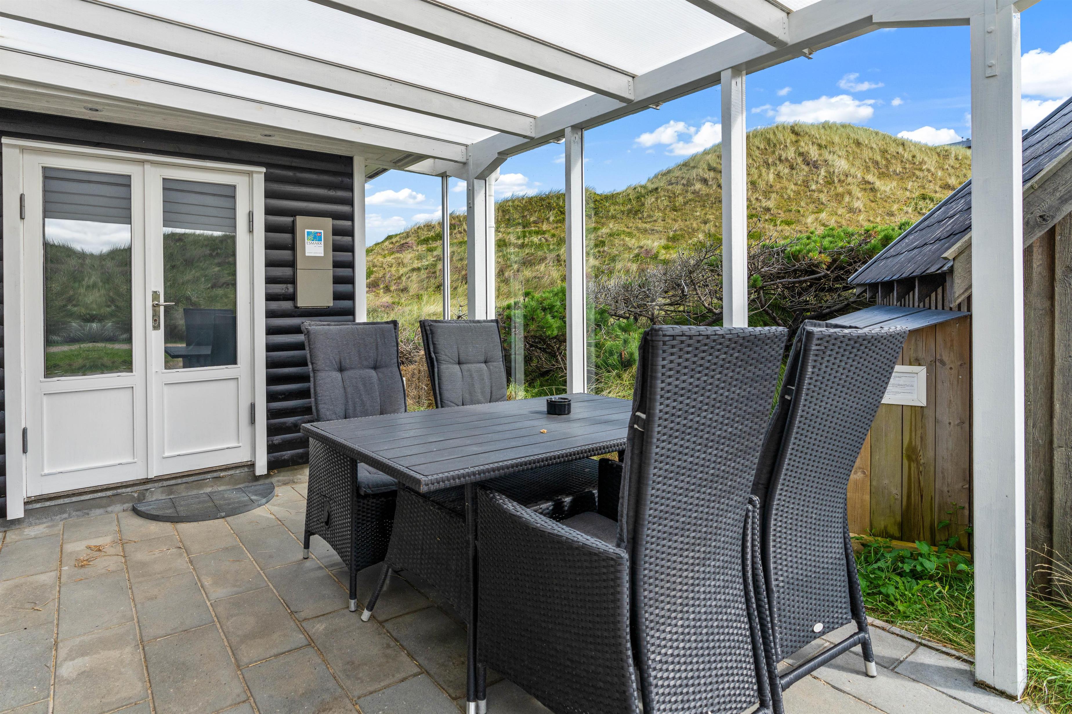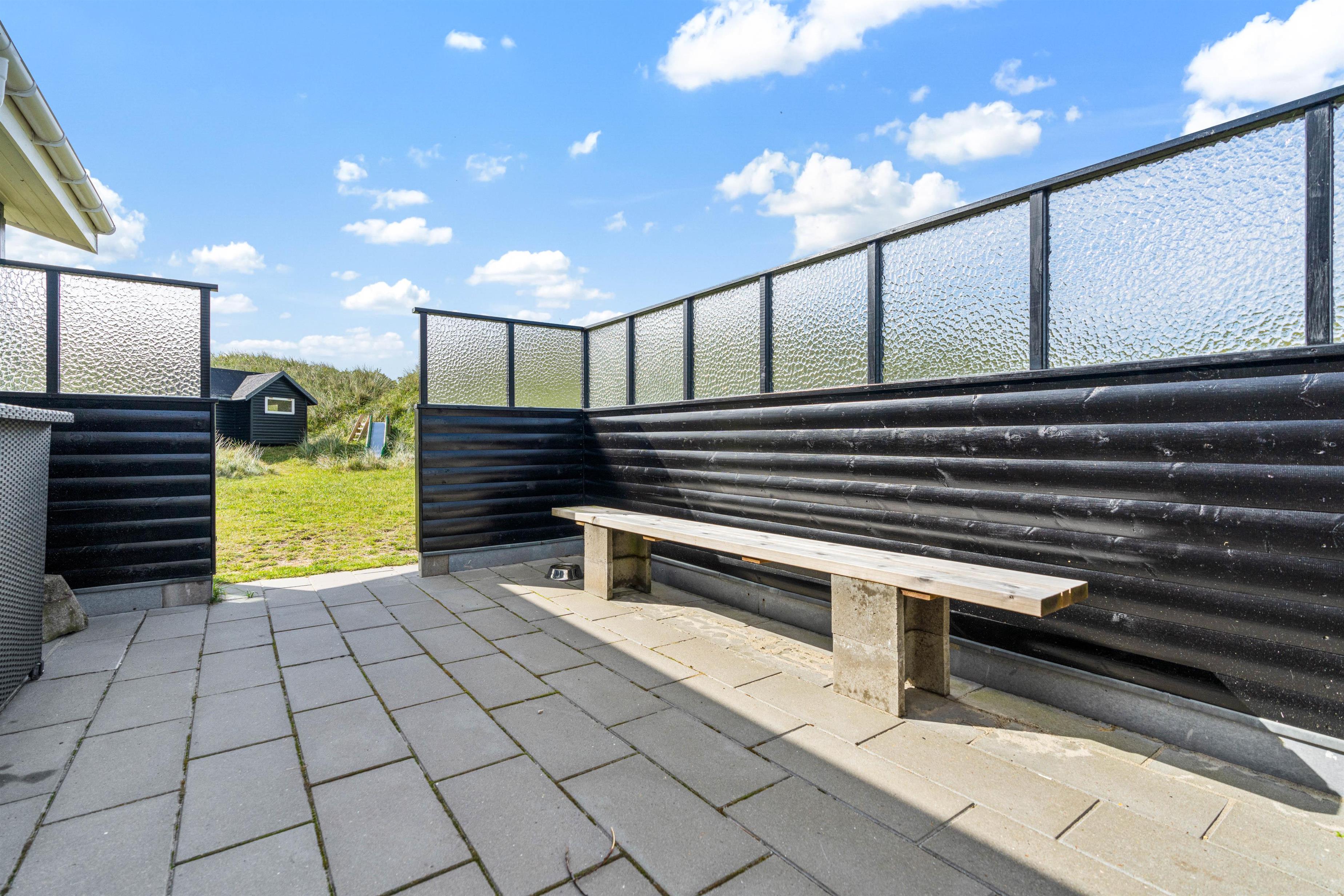 Udendørs har I flere skønne terrasser, hvor I kan finde jer til rette i havemøblerne og liggestolene på de solrige og varme feriedage. Mens I slapper af og nyder ferien på en af terrasserne, kan I høre lyden af brændingen i baggrunden. På sommerhusets udeområde har I desuden en udebruser, hvor I kan skylle det sidste sand af tæerne efter en tur på stranden. Den udendørs bruser kan benyttes i perioden april til november.