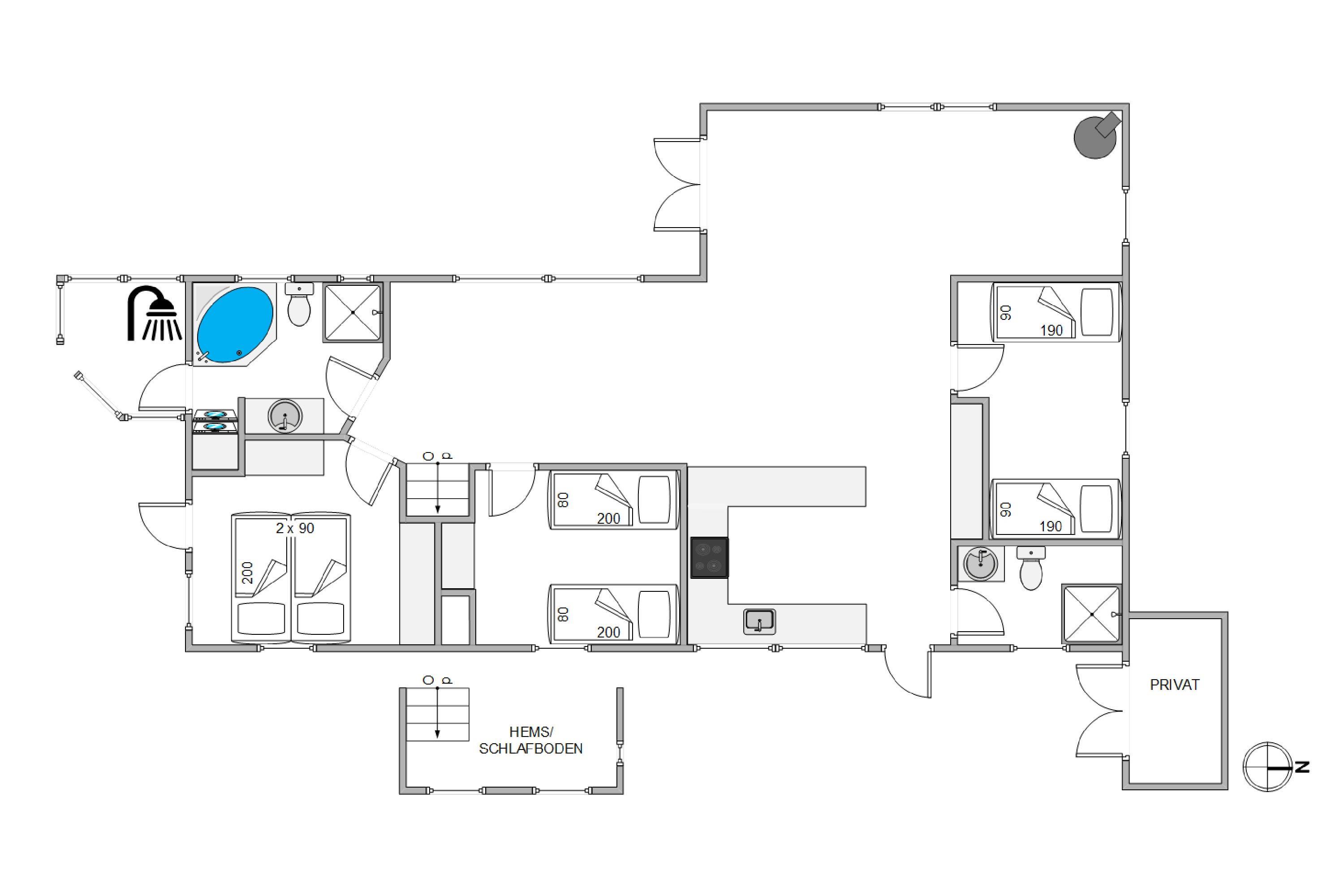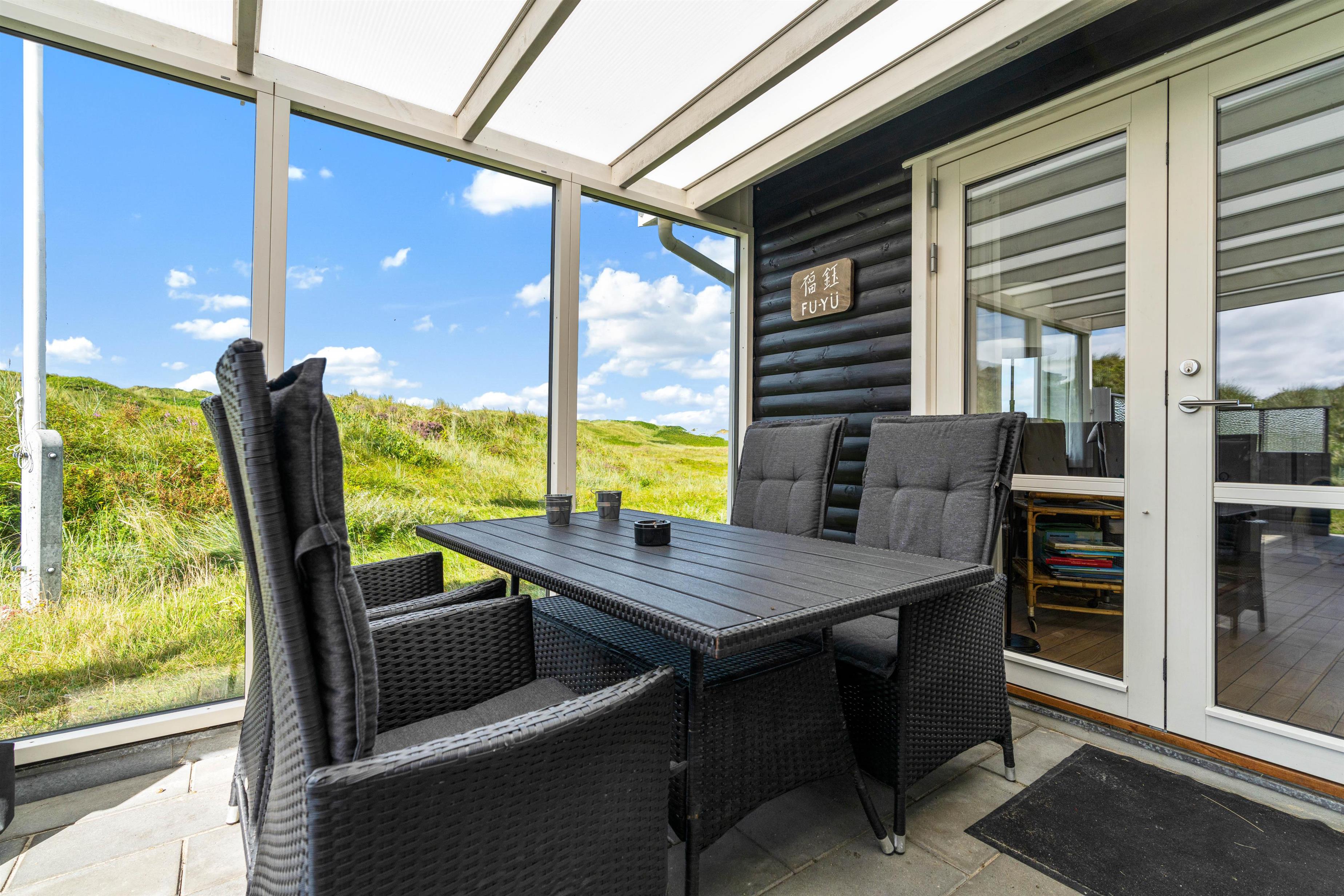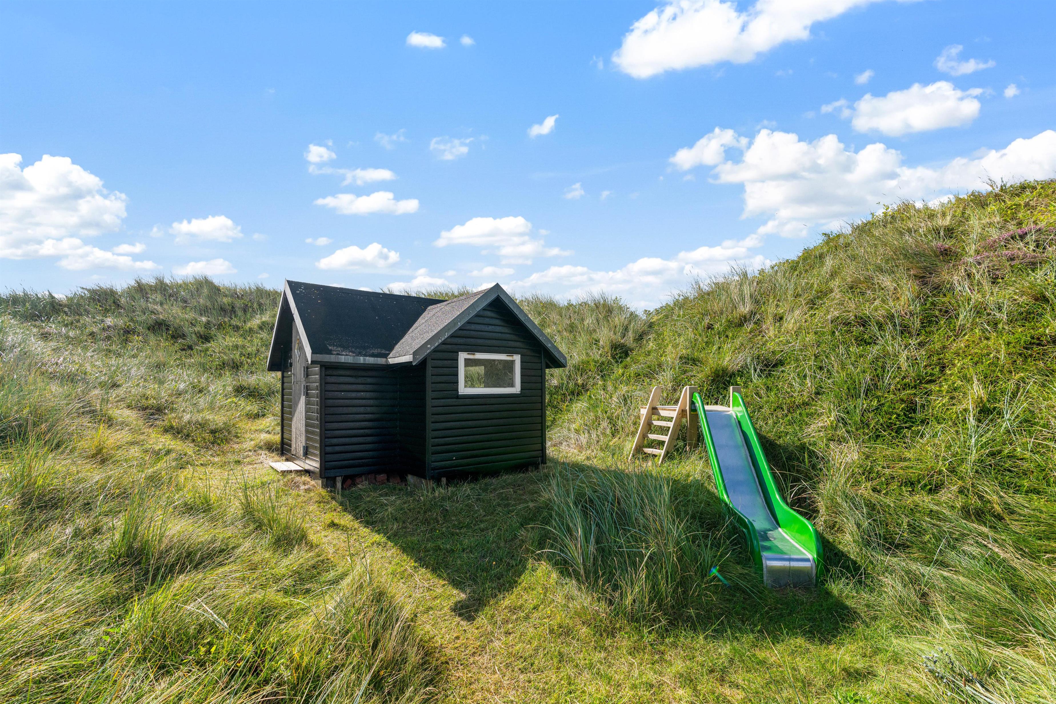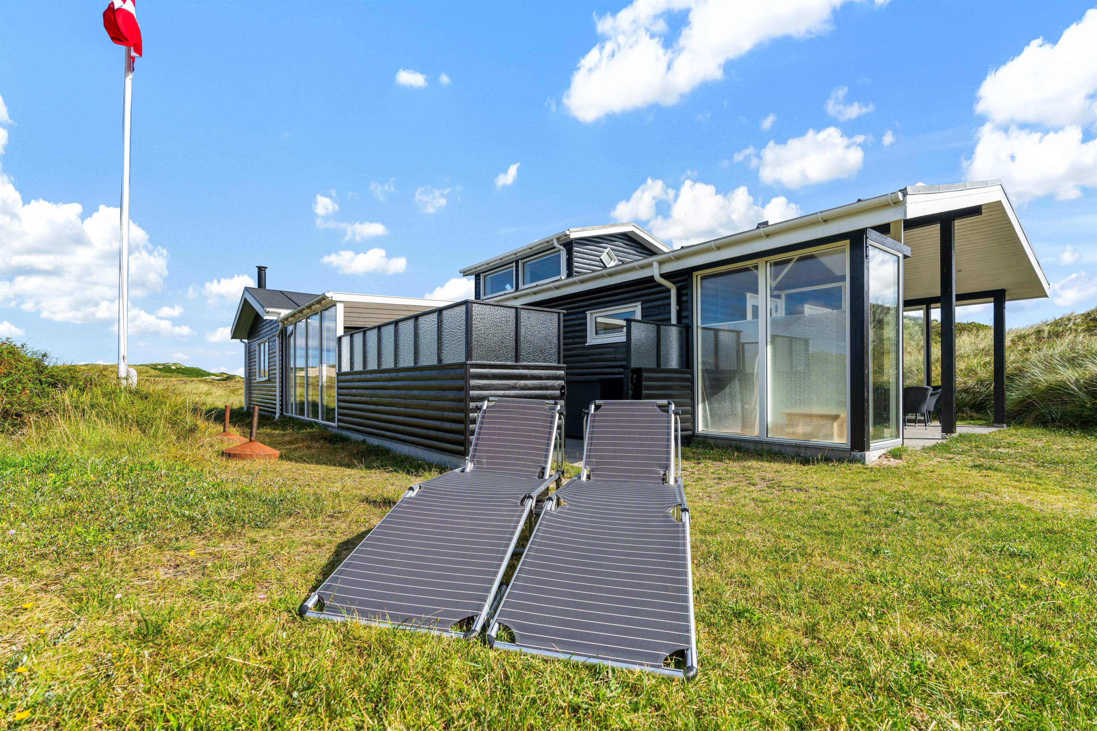 Udendørs har I flere skønne terrasser, hvor I kan finde jer til rette i havemøblerne og liggestolene på de solrige og varme feriedage. Mens I slapper af og nyder ferien på en af terrasserne, kan I høre lyden af brændingen i baggrunden. På sommerhusets udeområde har I desuden en udebruser, hvor I kan skylle det sidste sand af tæerne efter en tur på stranden. Den udendørs bruser kan benyttes i perioden april til november.