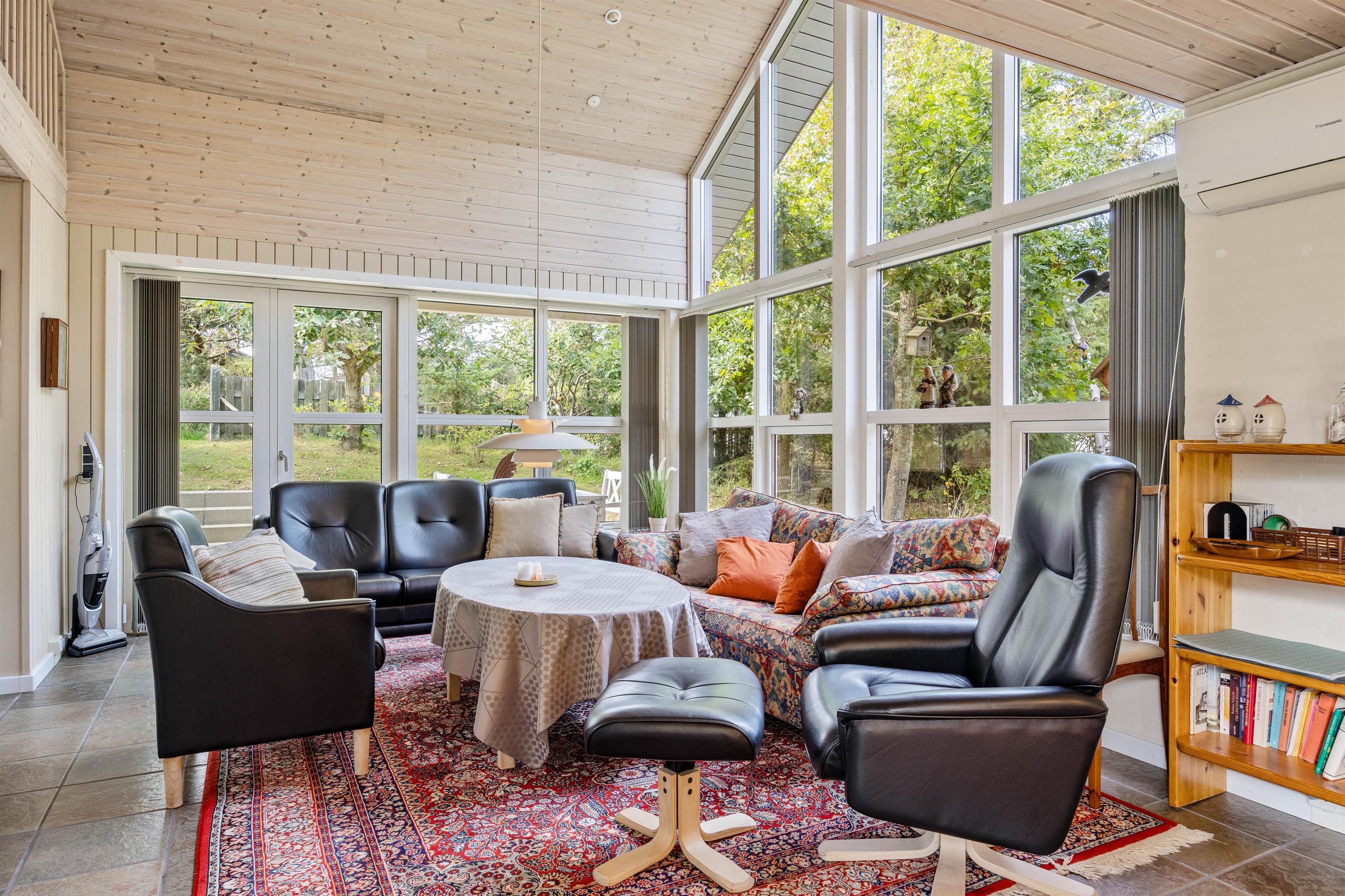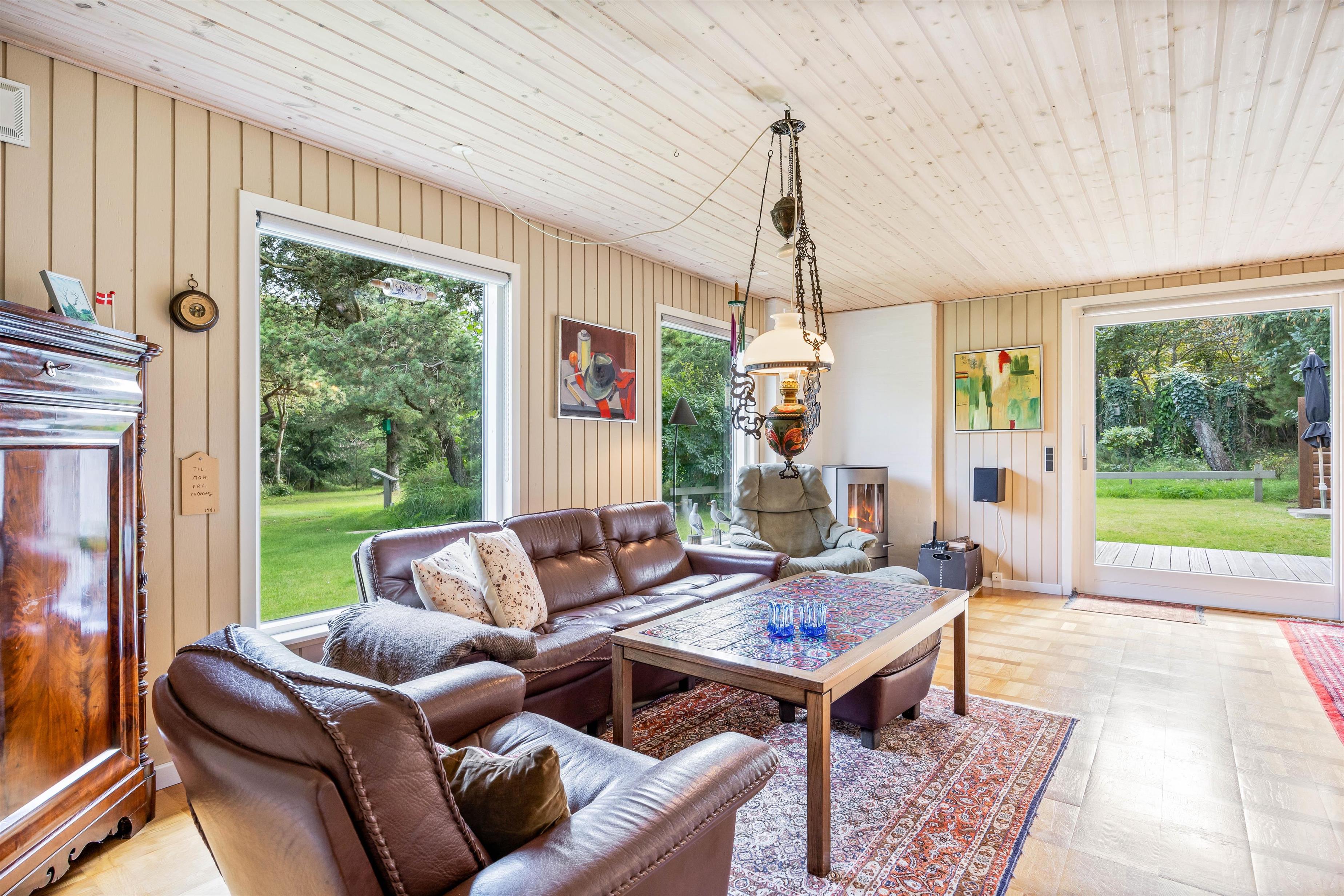 Indenfor er huset meget personligt indrettet. Grundet de mange og store vinduespartier er her lyst og pænt, og med hele 110 kvadratmeter er der er god plads. Særligt I husets ene stue, hvor loftet også går til kip er der dejligt. Den anden stue er også hyggelig med sine behagelige møbler. I kan nyde en behagelig aften foran brændeovnen, som giver rummet en hyggelig atmosfære, især på de køligere dage.
