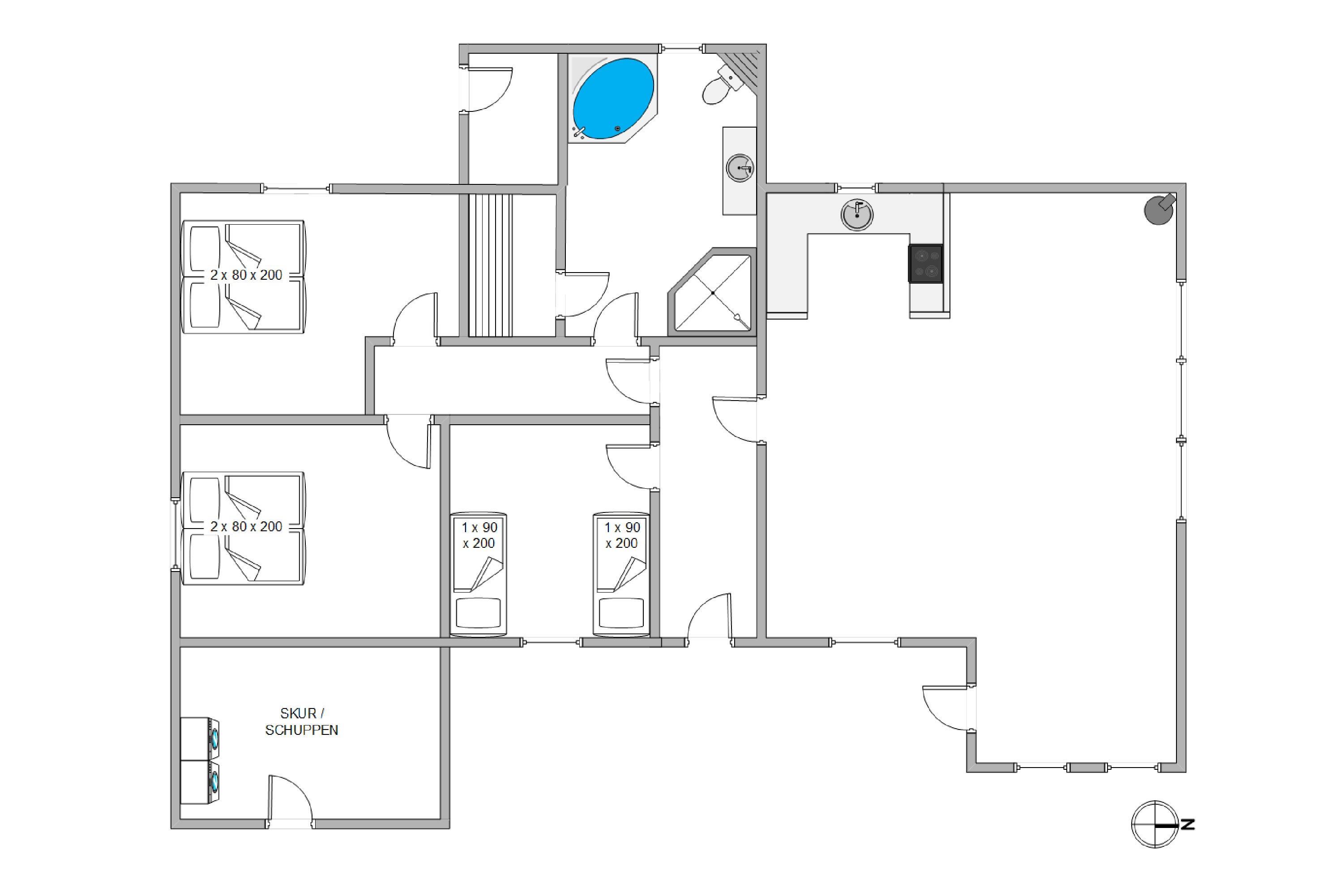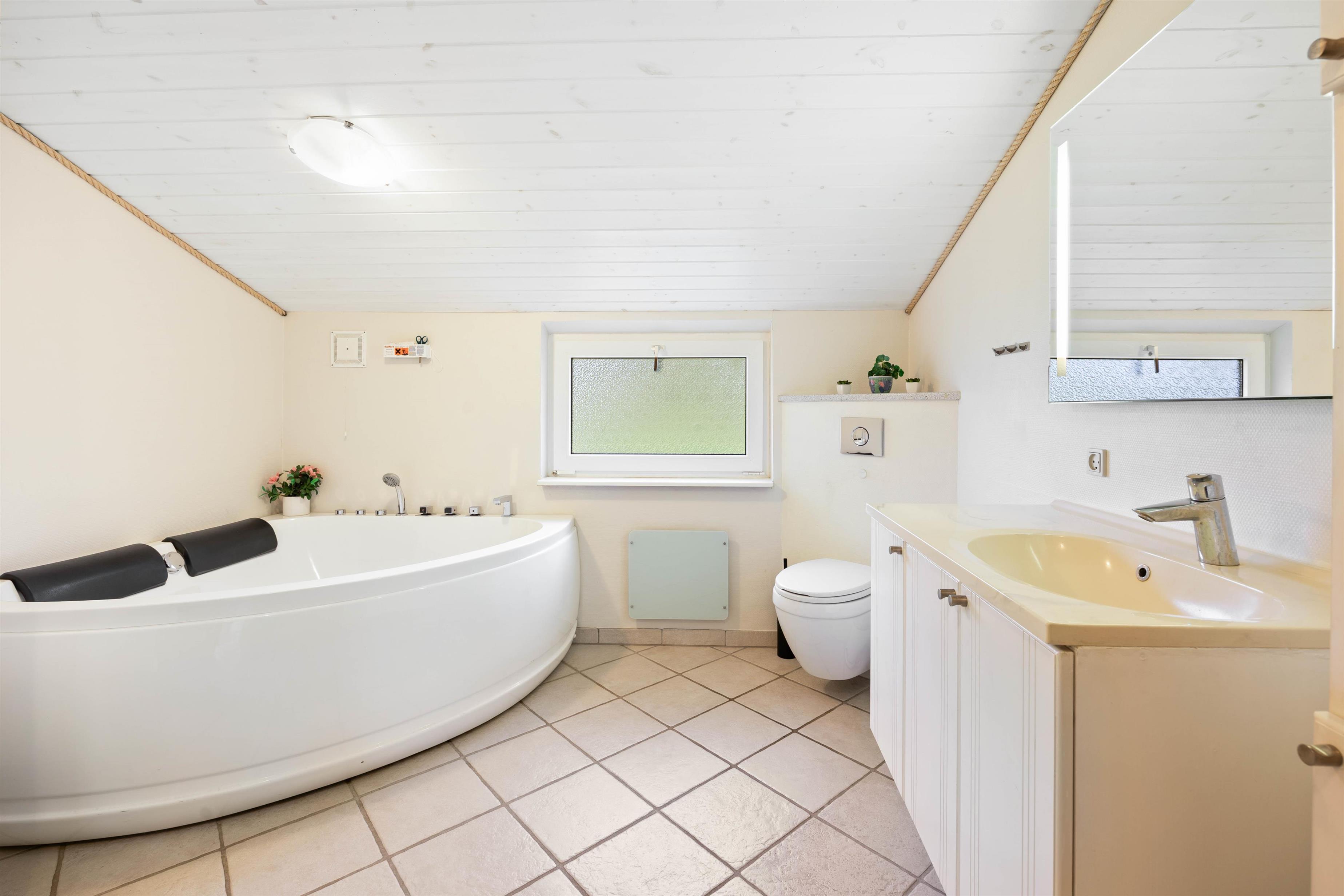 Sommerhuset er indrettet med 3 gode reelle værelser. 2 af værelserne er med dobbeltsenge og den sidste med enkelt senge. Derudover er det et dejligt badeværelse med både spa og suana. Sommerhuset indeholder et stort og lækkert ’wellness’ badeværelse med både spa og sauna. Så uanset vind og vejr ude, kan man sagtens blive varmet igennem inde og komme helt ned i gear og stresse af, enten i den dejlige, varme sauna eller de afslappende bobler i spabadet.