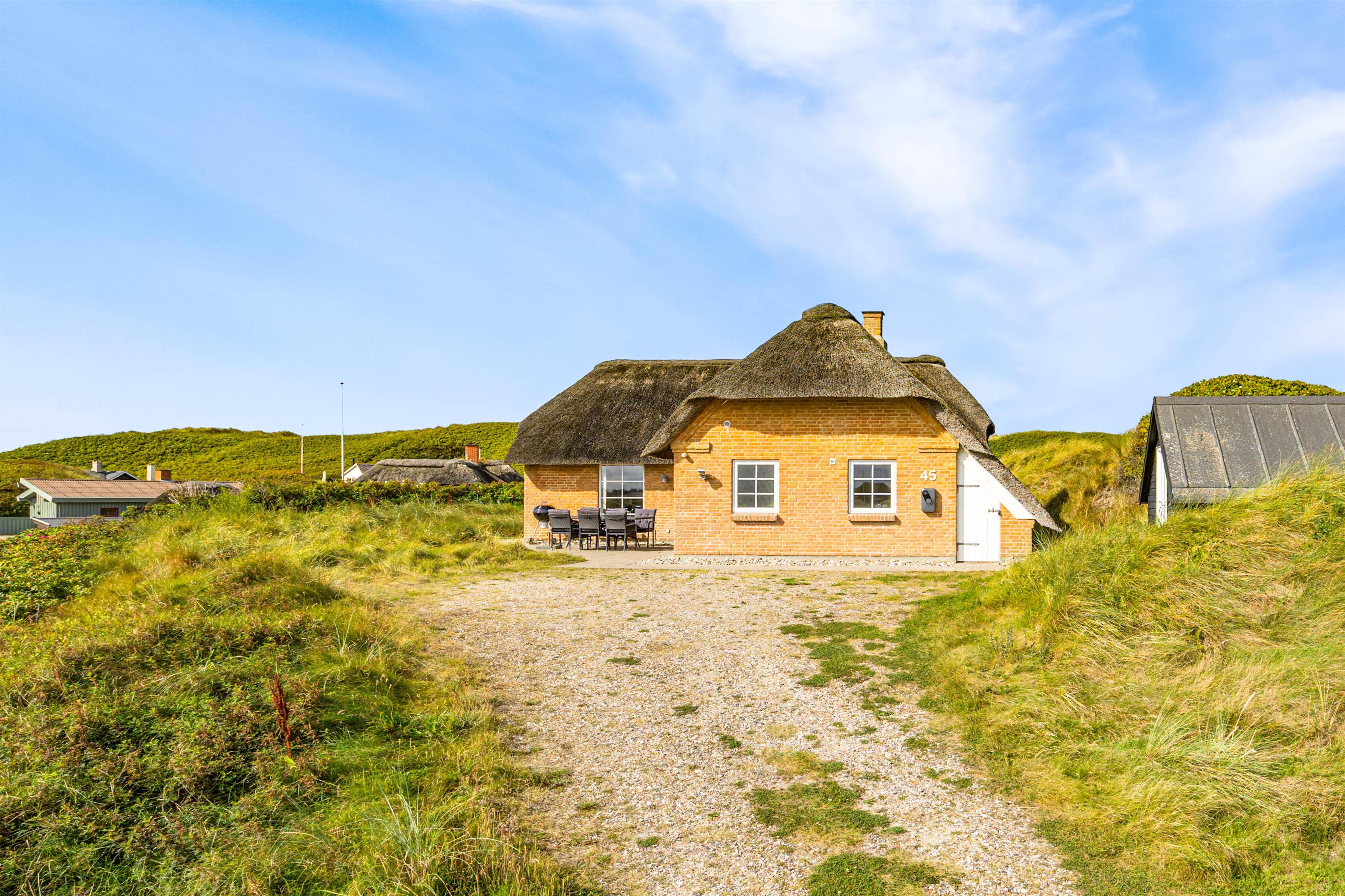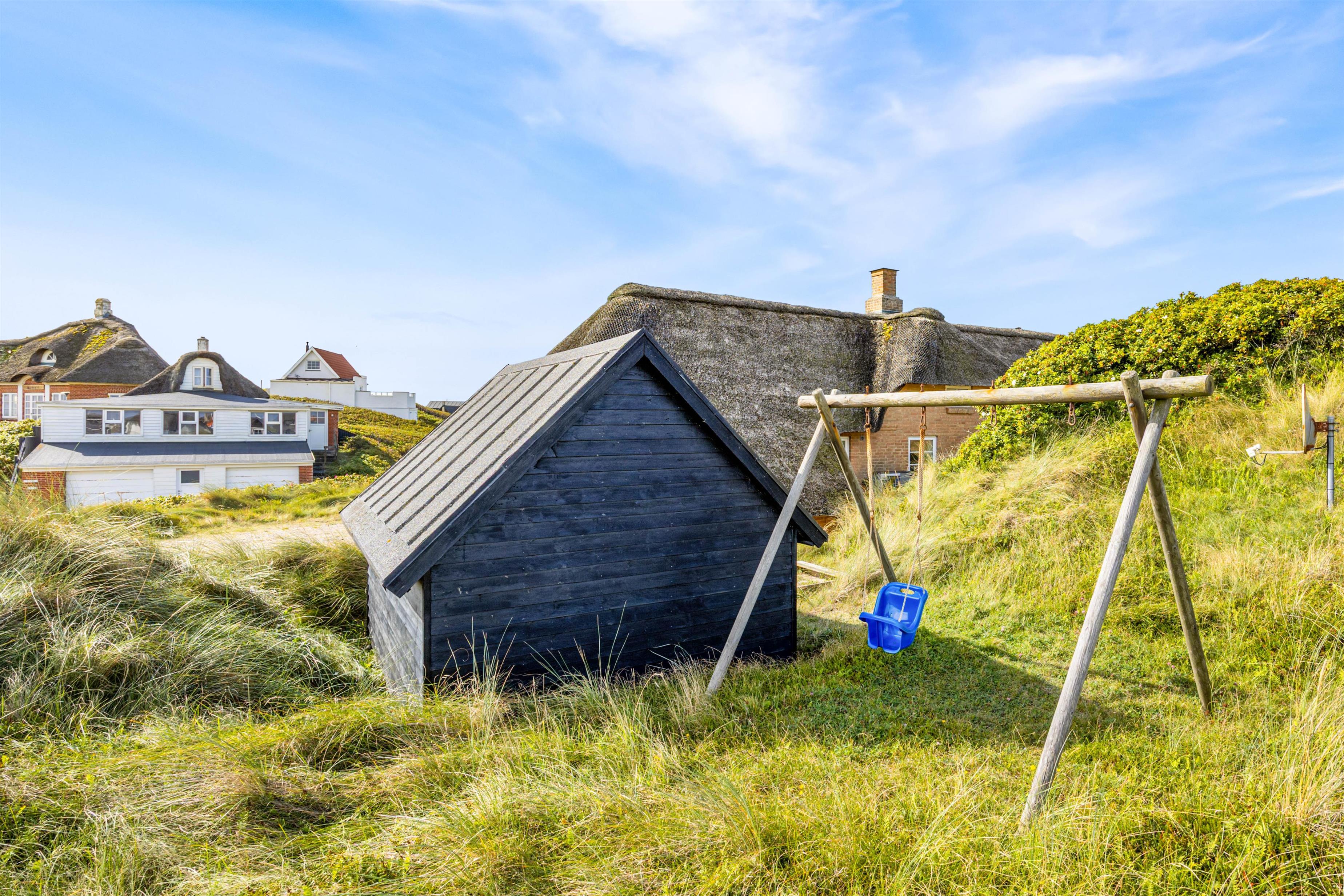 Sommerhuset er omkranset af gode terrasse, så der er altid mulighed for at sidde ude og nyde de smukke omgivelser. På den ene side af huset danner klitterne en naturlig afskærmning for vinden, og den ene af terrasserne er lukket, hvilket er helt perfekt, hvis man har nysgerrige småbørn med. Fra sommerhuset på Hafavej 45 har I også kun 150 meter til Vesterhavet. Der er derfor ingenting som står i vejen, for en dejlig lang gåtur på den kilometerlange sandstrand.