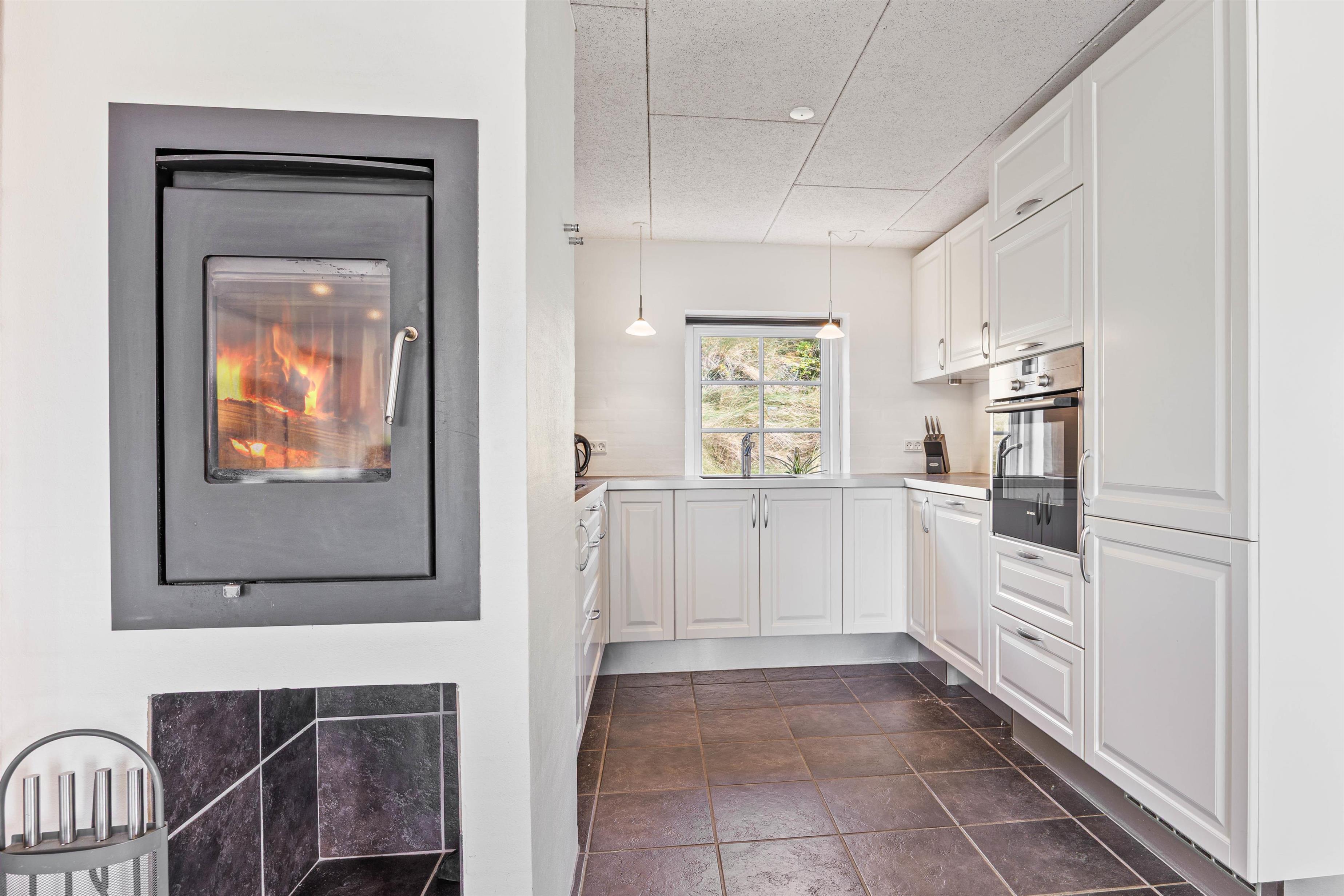 Stuen, spisestuen og køkkenet er i åben forbindelse og indrettet i hjertet af huset. Det er et helt fantastisk flot og spændende rum, hvor man får lyst til at tilbringe mange timer i selskab med familien. De mange behagelige møbler giver jer muligheden for at slå jer ned, og bare slappe af og nyde ferien. Til de lidt koldere dage kan brændeovnrn varme hele rummet op, samtidig med den skaber en hyggelig stemning i huset. Her er selvfølgelig også et stort fladskærms-TV og trådløst internet.