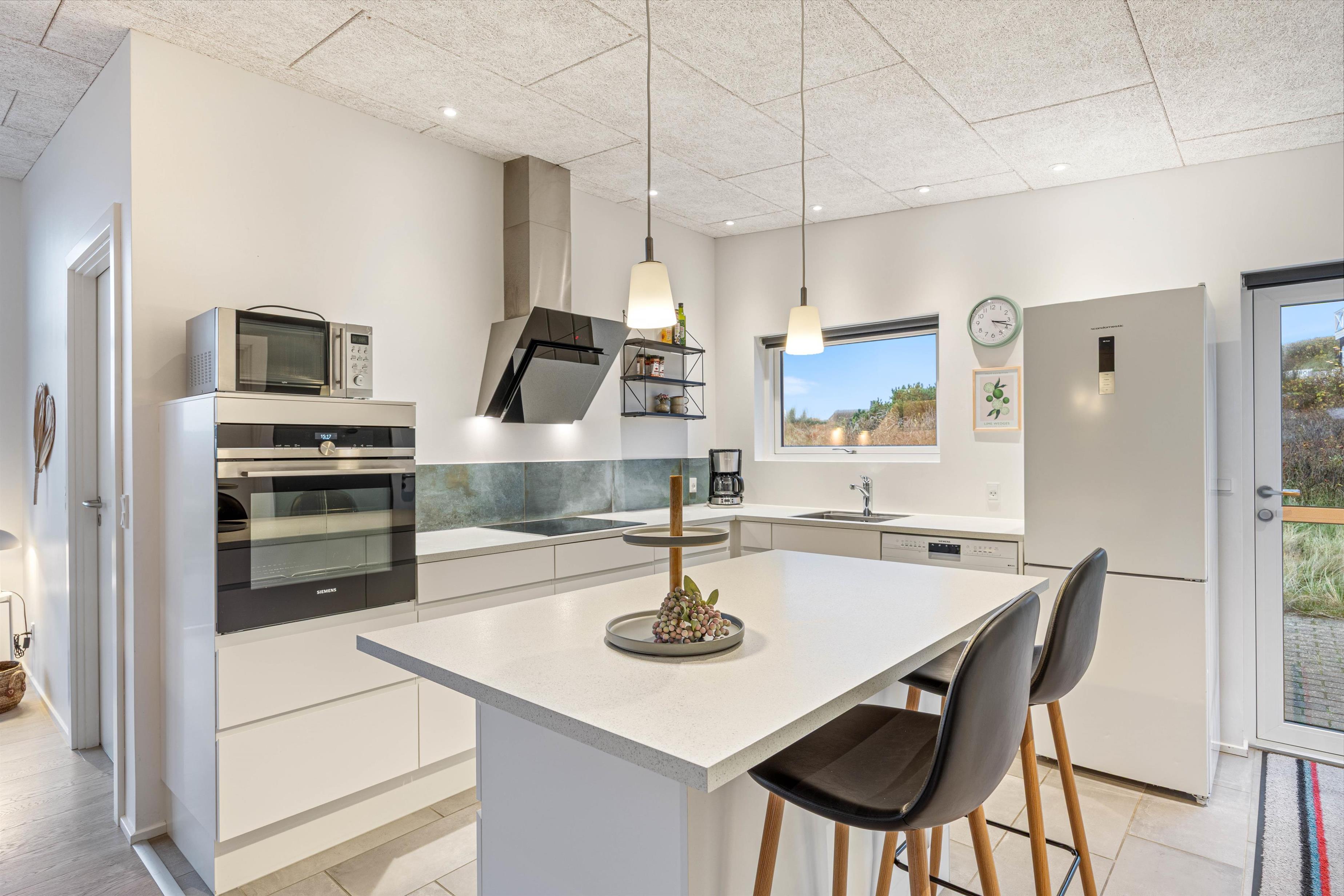 Det smarte og veludstyrede køkken indbyder til hygge med fællesskab omkring madlavningen, om man selv rører i gryden eller har åbnet en flaske vin og holder kokken med selskab siddende på en barstol ved køkkenøen. For god og økonomisk varme sørger husets varmepumpe.