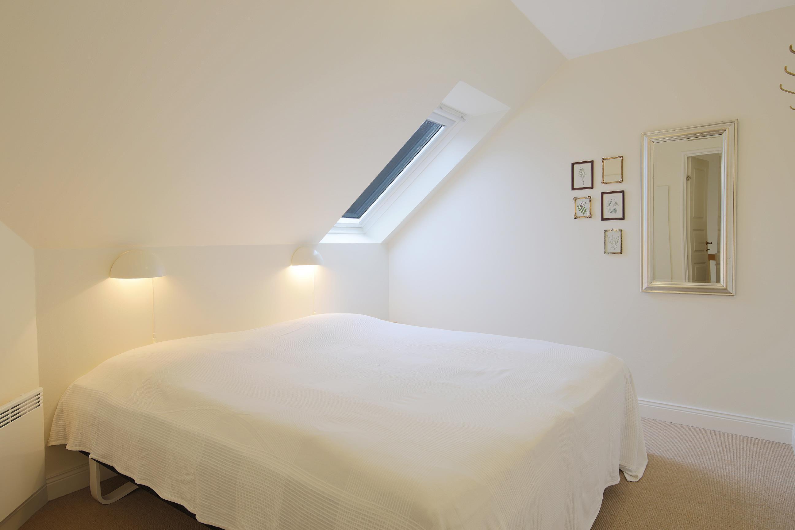 Via trappen fra stuen kommer I op til balkonen, hvor der er direkte udsyn til stue- og spiseafdelingen. På førstesalen finder I lejlighedens 2 soveværelser, der fremstår lyse og pæne og som begge er indrettet med komfortable dobbeltsenge. I stuen er der indbygget chrome-cast i tv'et.