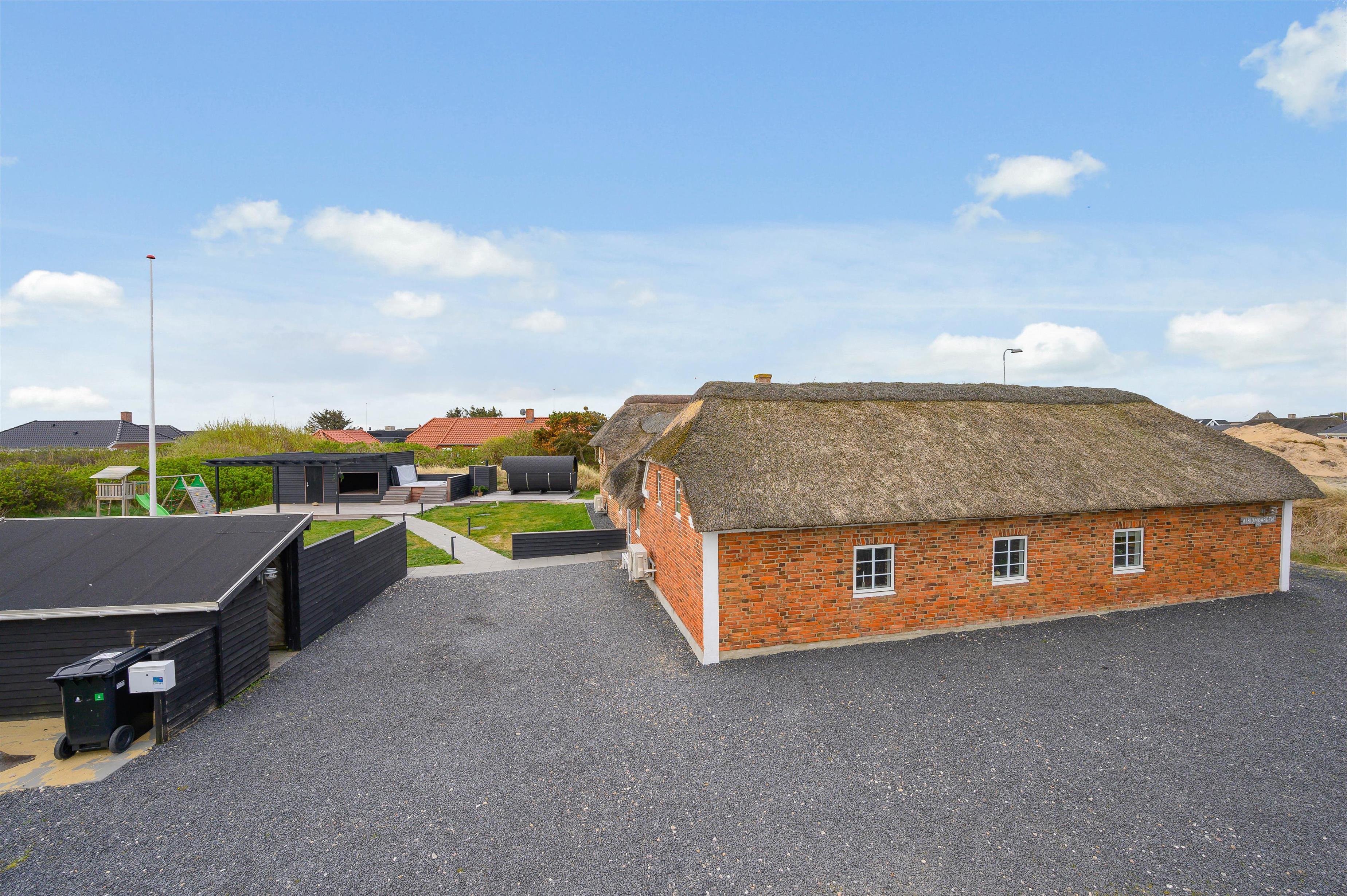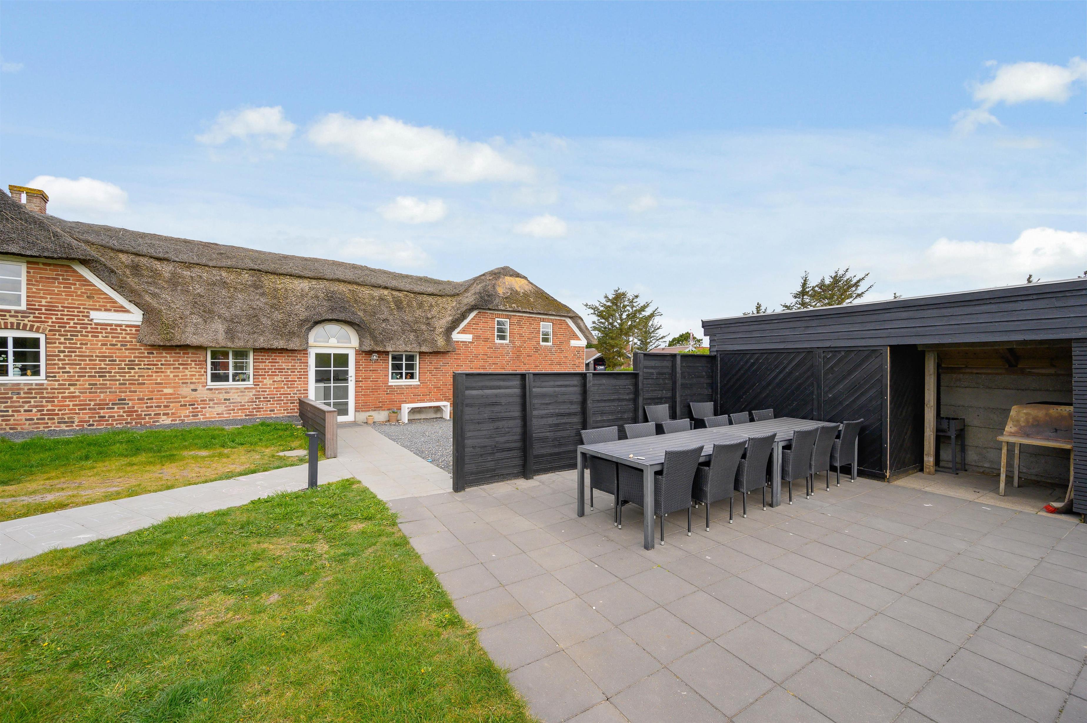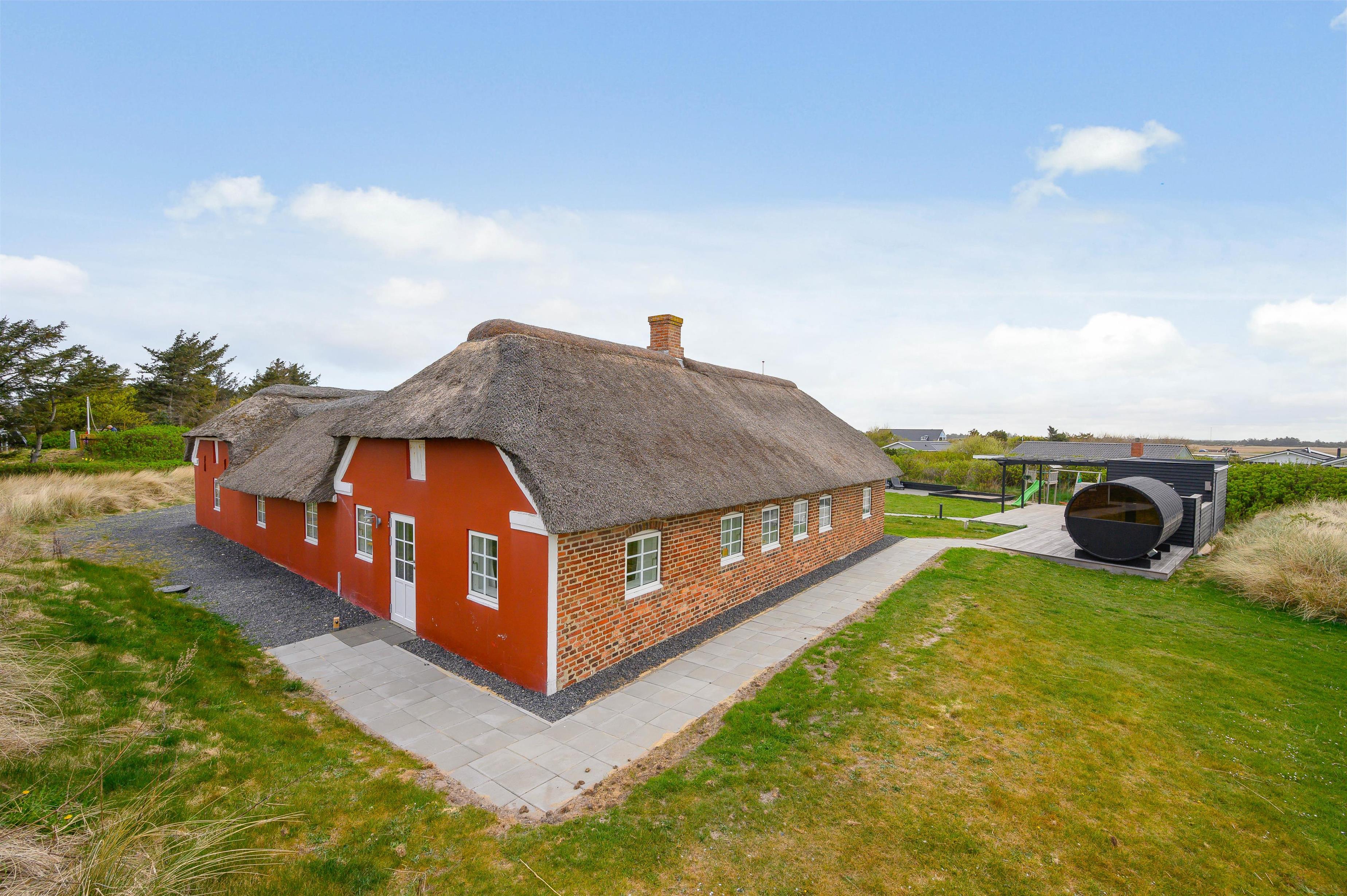Leder I efter et sommerhus til den næste familieferie? Dette stråtækte feriehus i Søndervig har plads til intet mindre end 14 personer (og 2 hunde) og egner sig perfekt til en eller flere familier. Med en totalrenovering i 2019 er en gennemført moderne indretningsstil lagt, og et stort udeareal med græsplæne gør sommerdagene til et hit for både store og små - og en ekstra bonus er udespaen, som står klar til at give jer de skønneste wellnessoplevelser under åben himmel. Både stranden og Søndervigs centrum ligger desuden kun fem minutters gang væk!