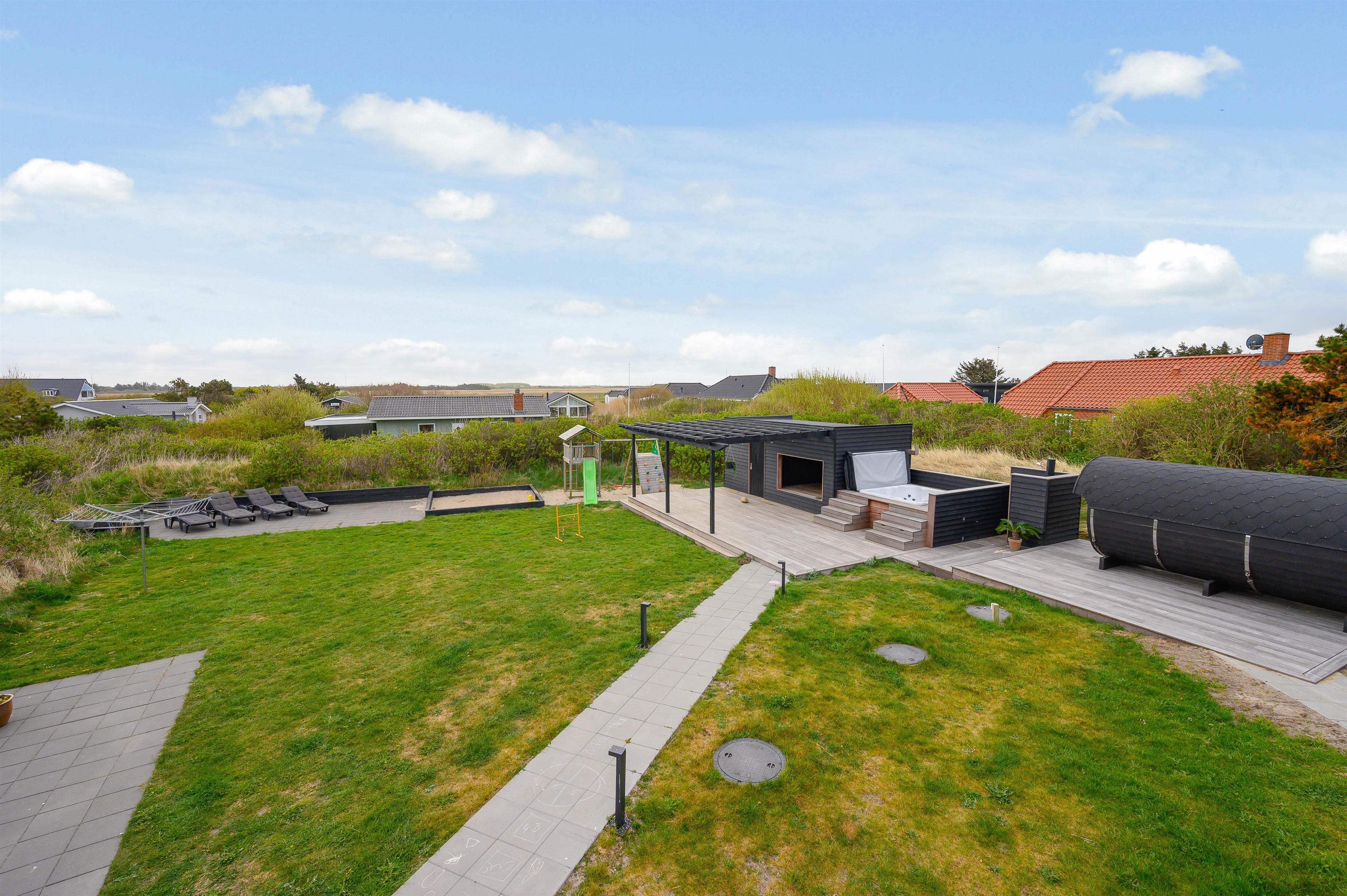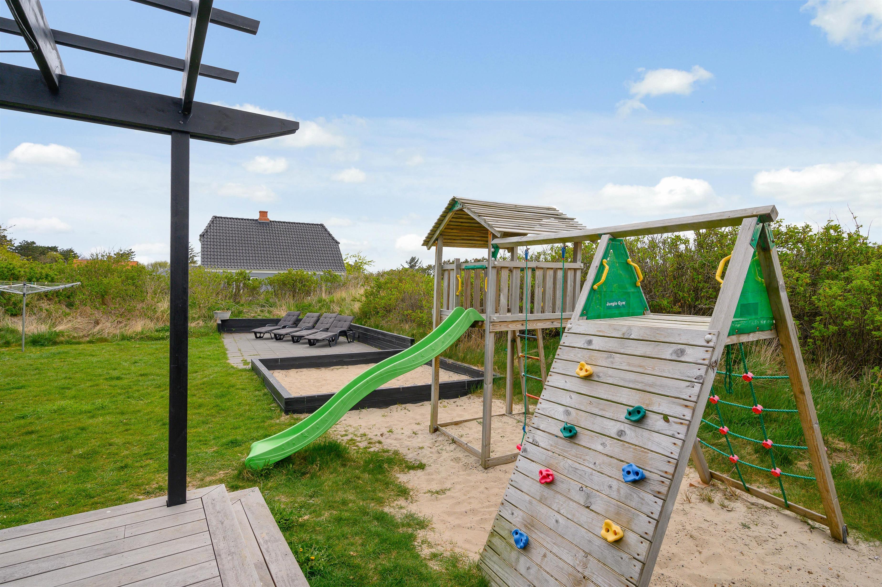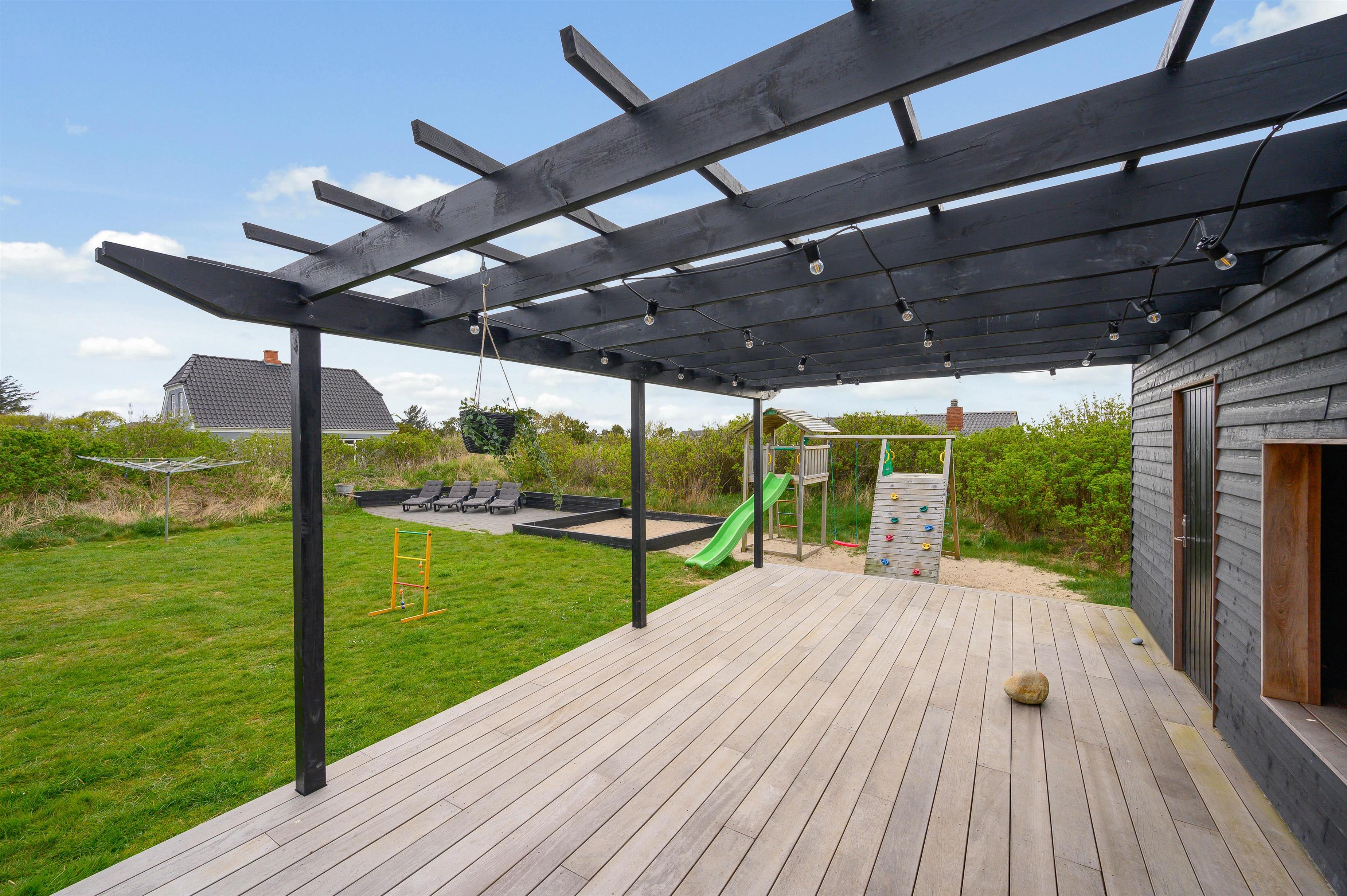 Med en tilhørende grund på mere end 2.000 kvadratmeter, er der masser af plads at opholde sig på i solskinsvejret. På den store græsplæne kan børnene og hundene tumle og spille bold, mens I slapper af i liggestolene, og til glæde for børnene får I jeres eget private legeområde med sandkasse og legetårn med gynge og rutsjebane.