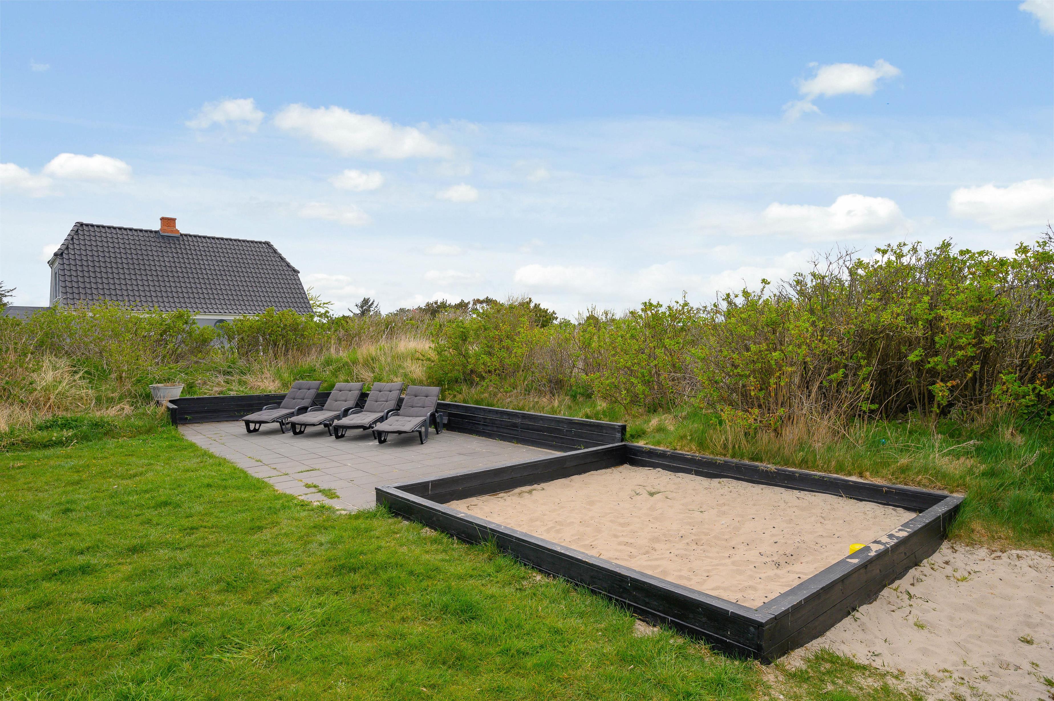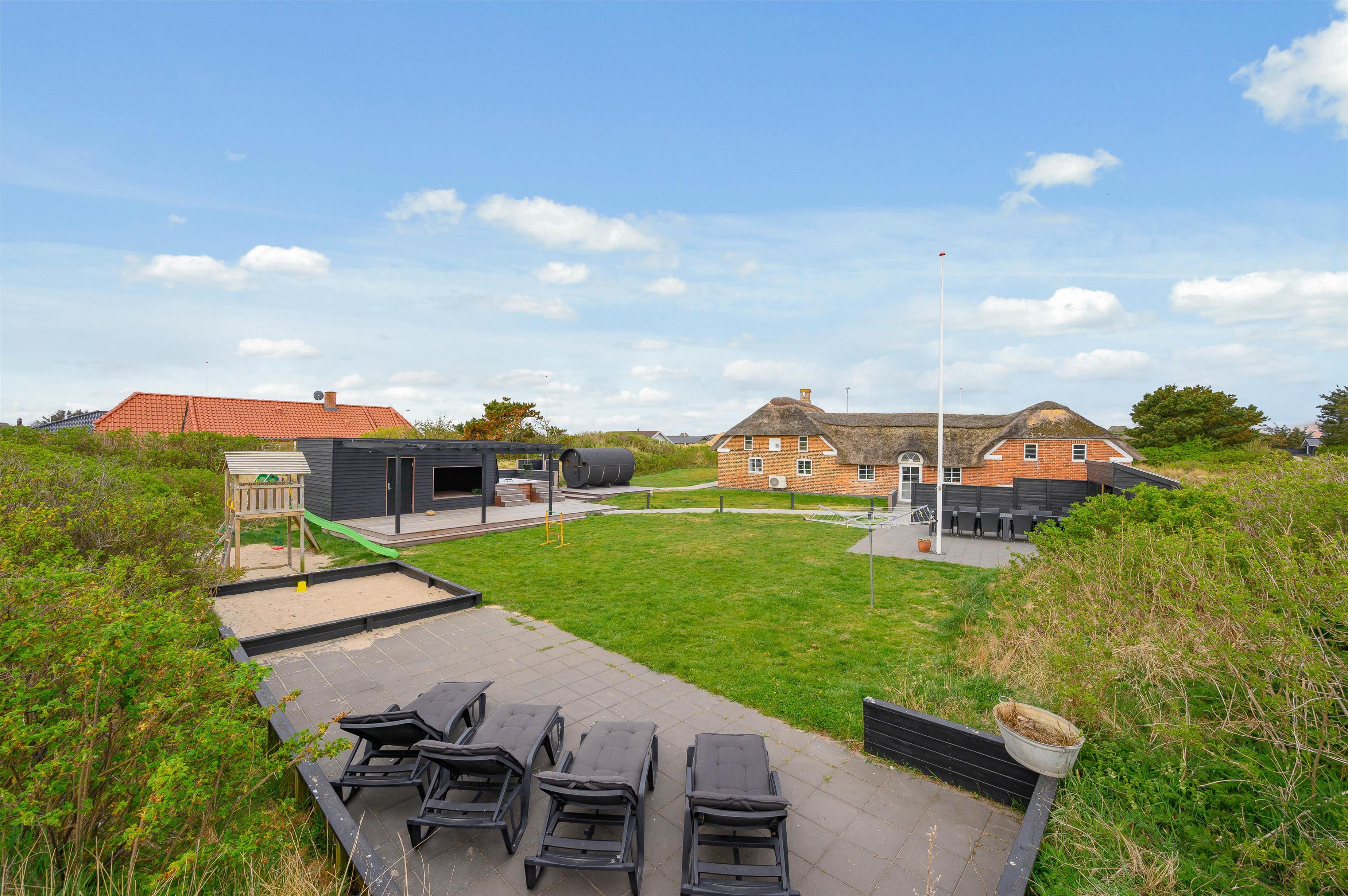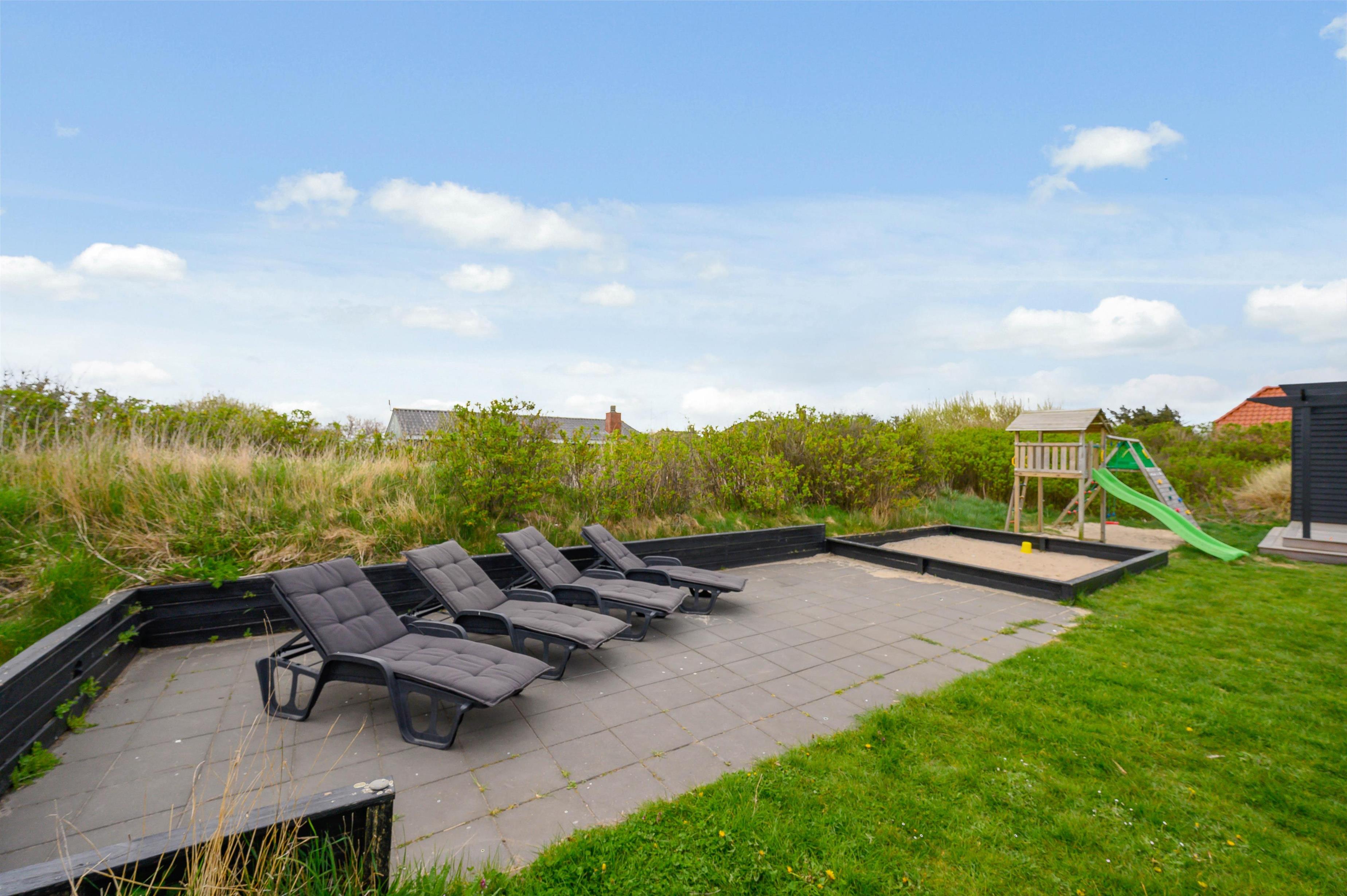 Med en tilhørende grund på mere end 2.000 kvadratmeter, er der masser af plads at opholde sig på i solskinsvejret. På den store græsplæne kan børnene og hundene tumle og spille bold, mens I slapper af i liggestolene, og til glæde for børnene får I jeres eget private legeområde med sandkasse og legetårn med gynge og rutsjebane.