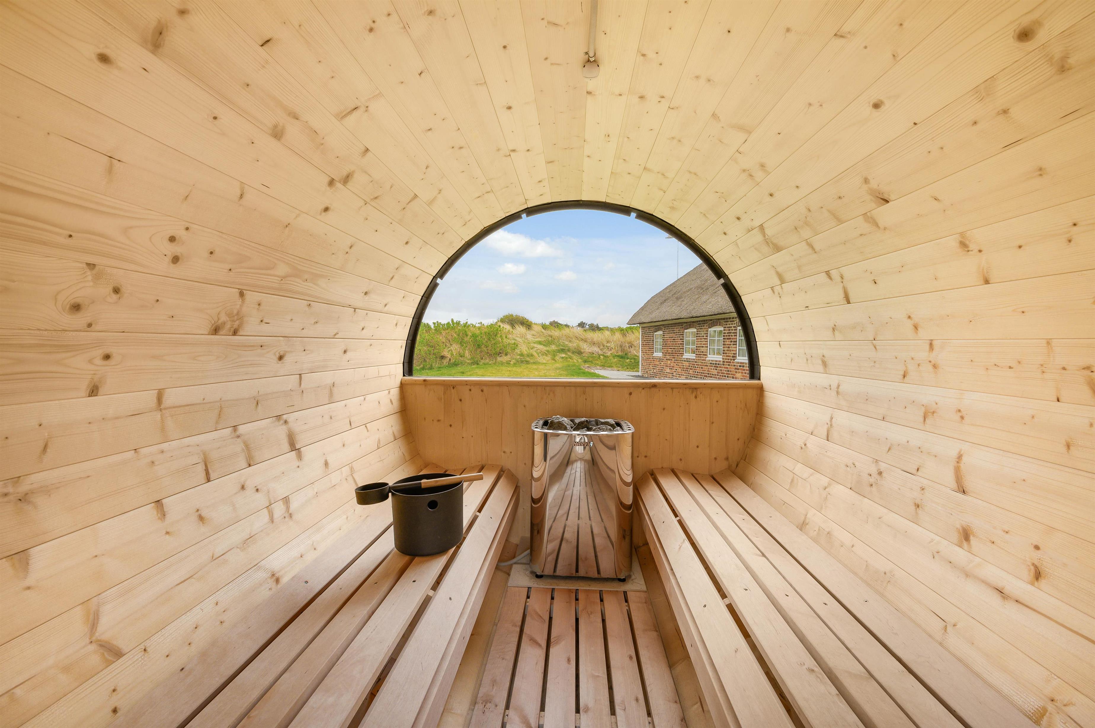 Sommerhuset har flere gode terrasser - en afskærmet del og en åben del, som især er perfekt til solbadning i liggestolene. Udearealet byder også på et af feriehusets absolutte højdepunkter i form af et lækkert udendørs spabad. Her kan I rigtig skrue op for wellnessfornemmelsen og nyde et varmt boblebad under åben himmel. Derudover er der installeret en udebruser, hvor I nemt kan skylle sandet af fødderne, inden I går indenfor. Udebruseren står til rådighed i perioden fra april til november.