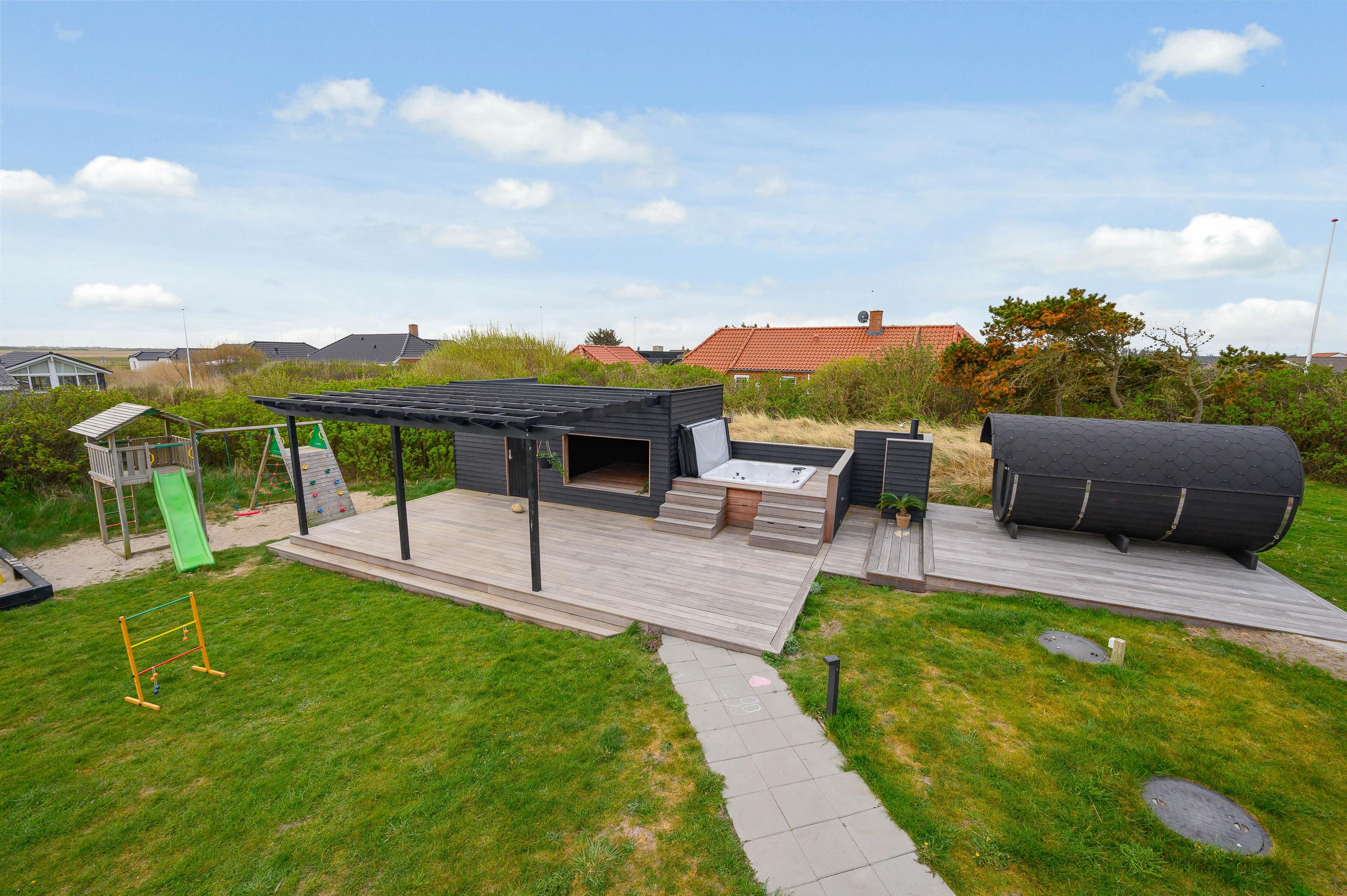 Terrasse med udendørs spa og stort udeareal med plads til leg