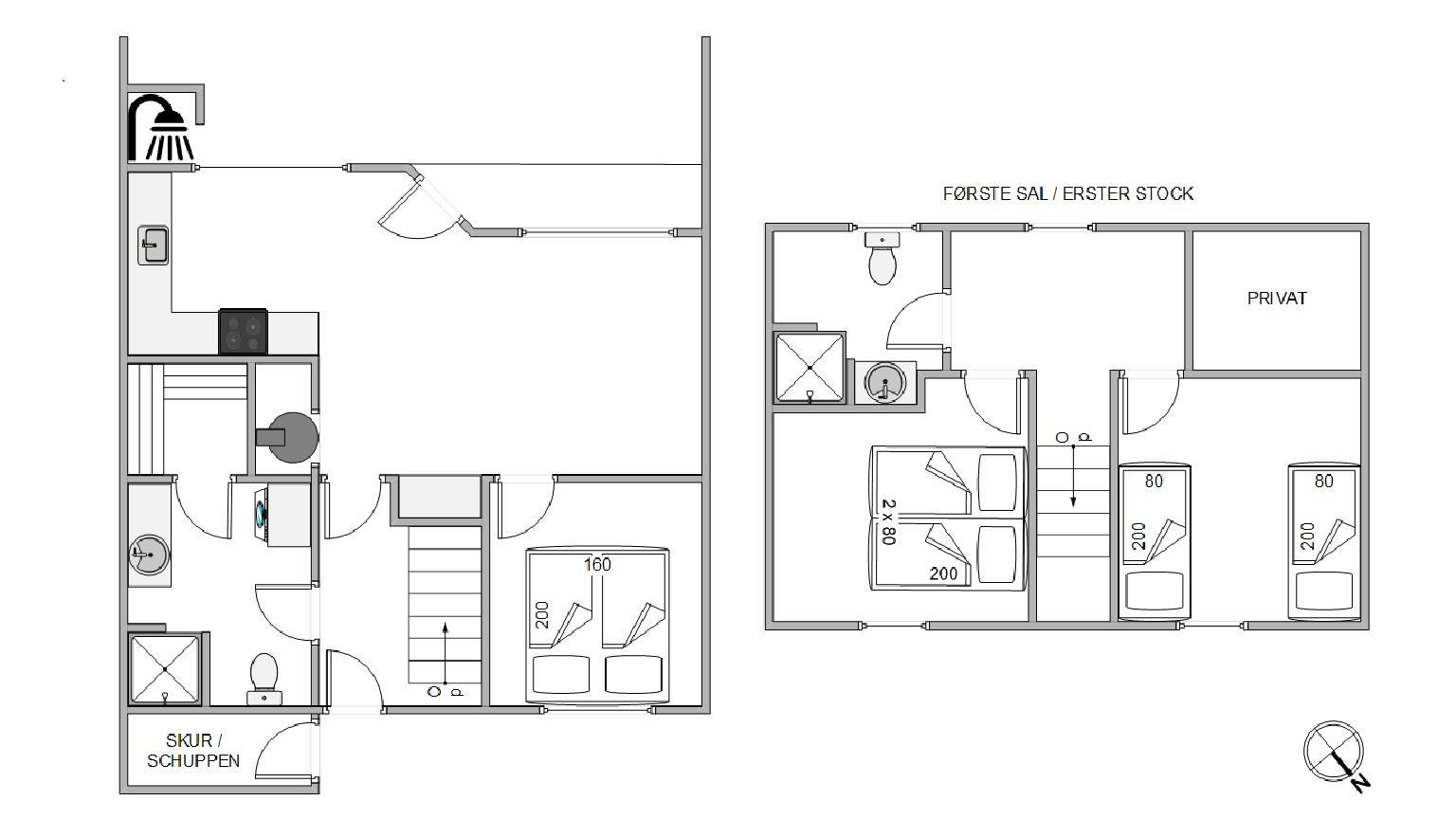 Ligeledes indeholder feriehuset også to badeværelser, et ovenpå og et nedenunder. Begge badeværelser er smukt renoveret, med flotte nye bademøbler, messingdetaljer og lækker rainshower bruser. Med et badeværelse på begge etager, giver dette igen også gode muligheder for at kunne indrette sig helt som man ønsker. Badeværelset nedenunder er også udstyret med gulvvarme.