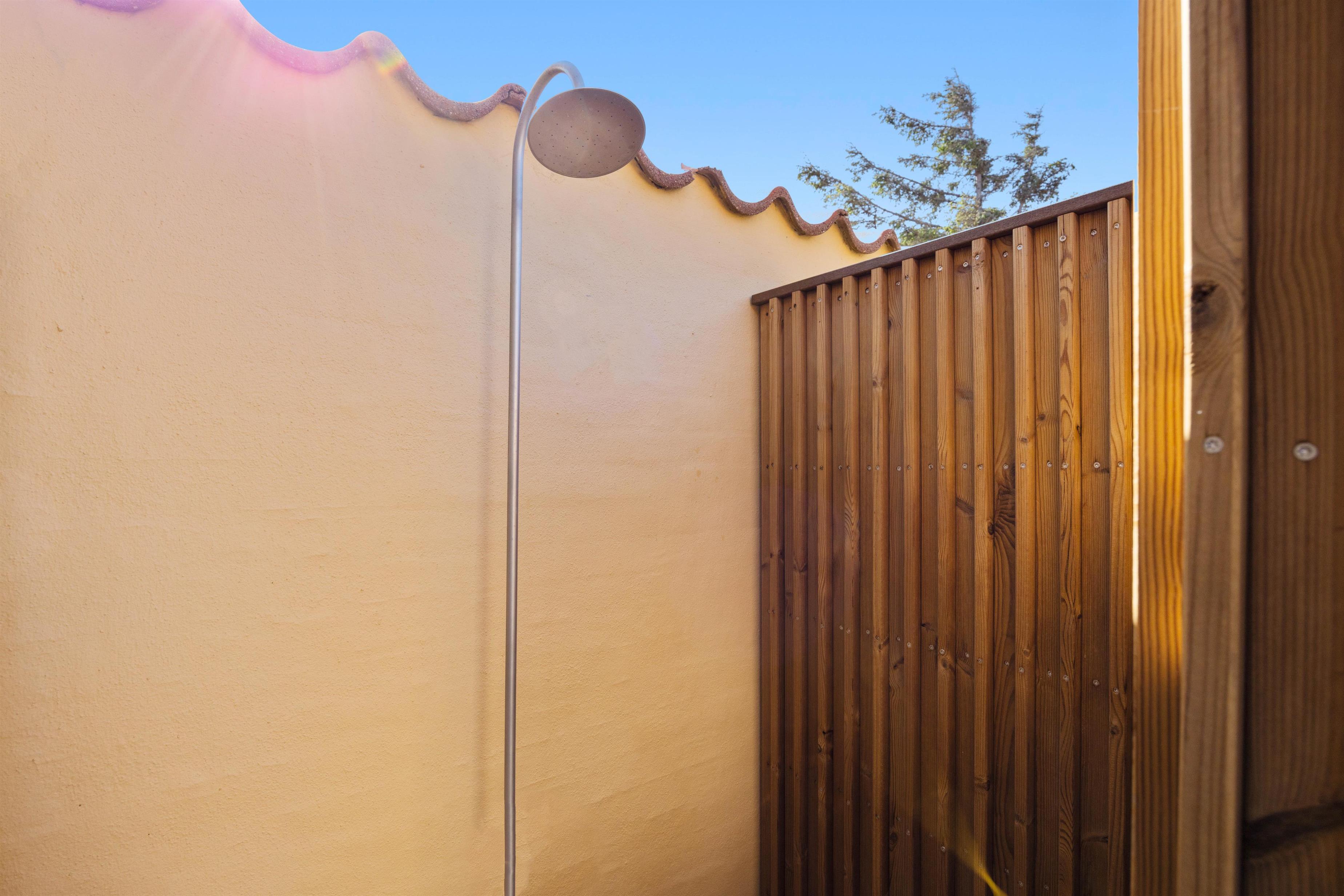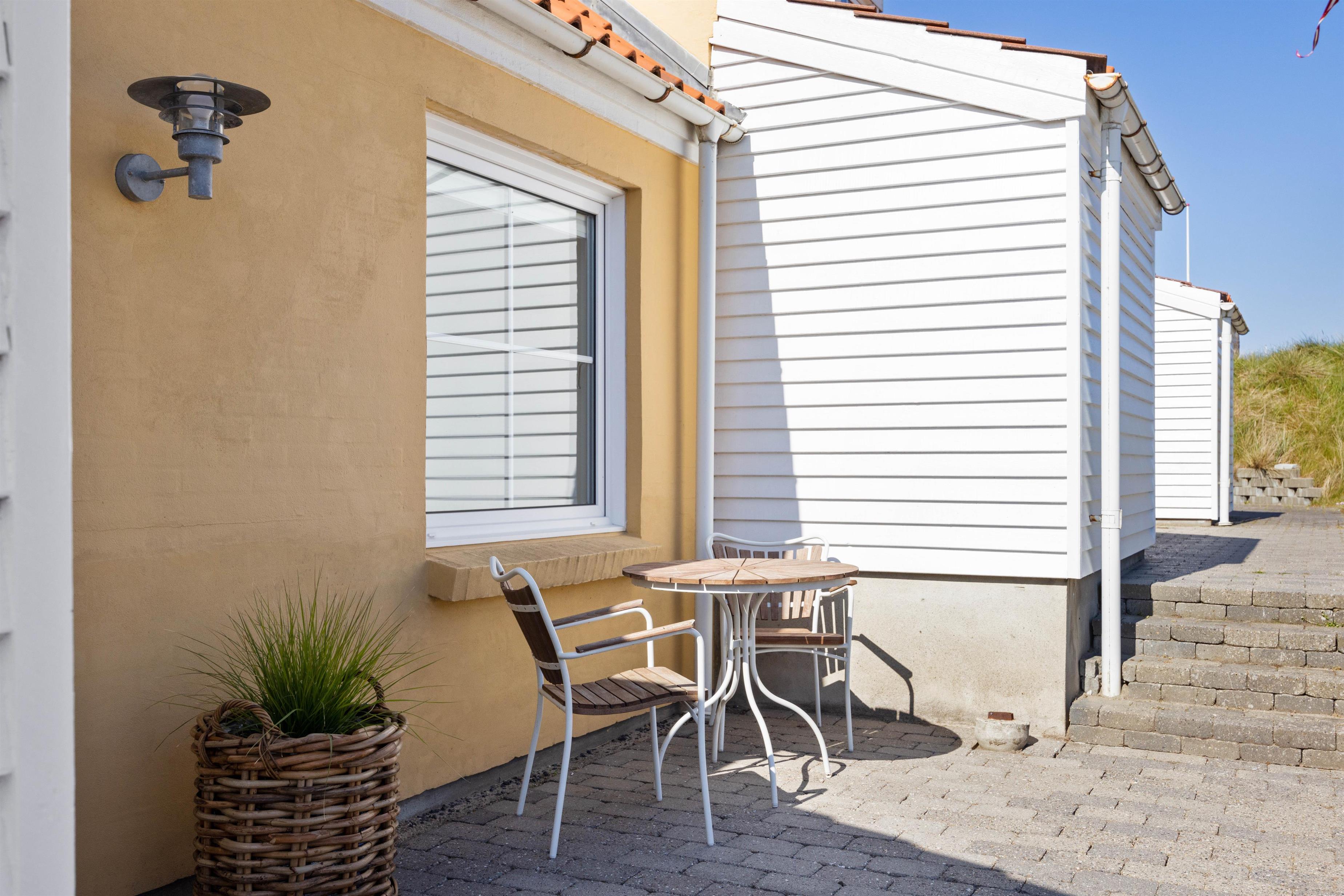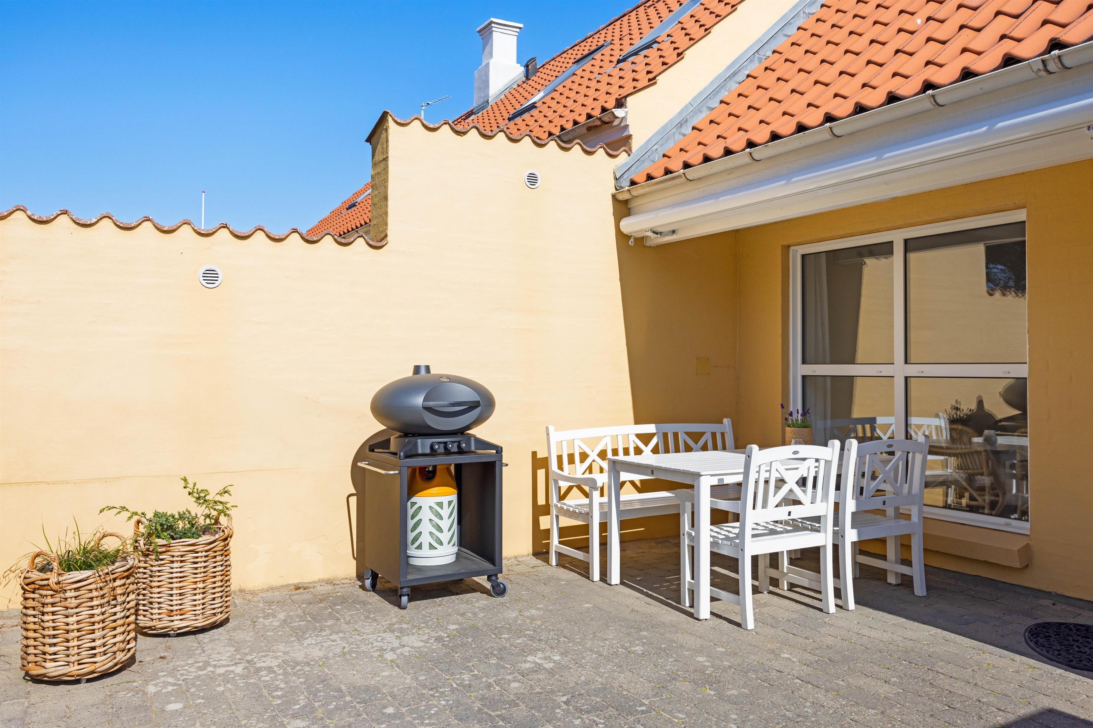 Til ferielejligheden hører en ca. 40 m2 stor terrasse, hvor både morgen-, eftermiddags- og aftenssolen kan nydes i fulde drag. Hvis solen bliver for skarp, kan I slå markisen ud og trække jer tilbage i skyggen eller hoppe under den skønne udebruser og tage et nedkølende brusebad. Den udendørs bruser vil kun kunne benyttes i perioden april til november.