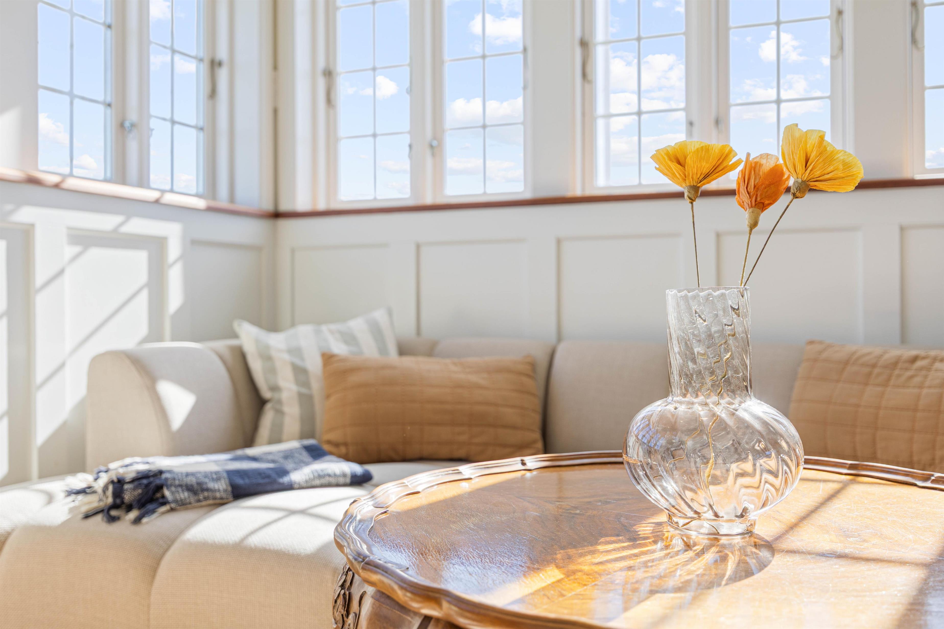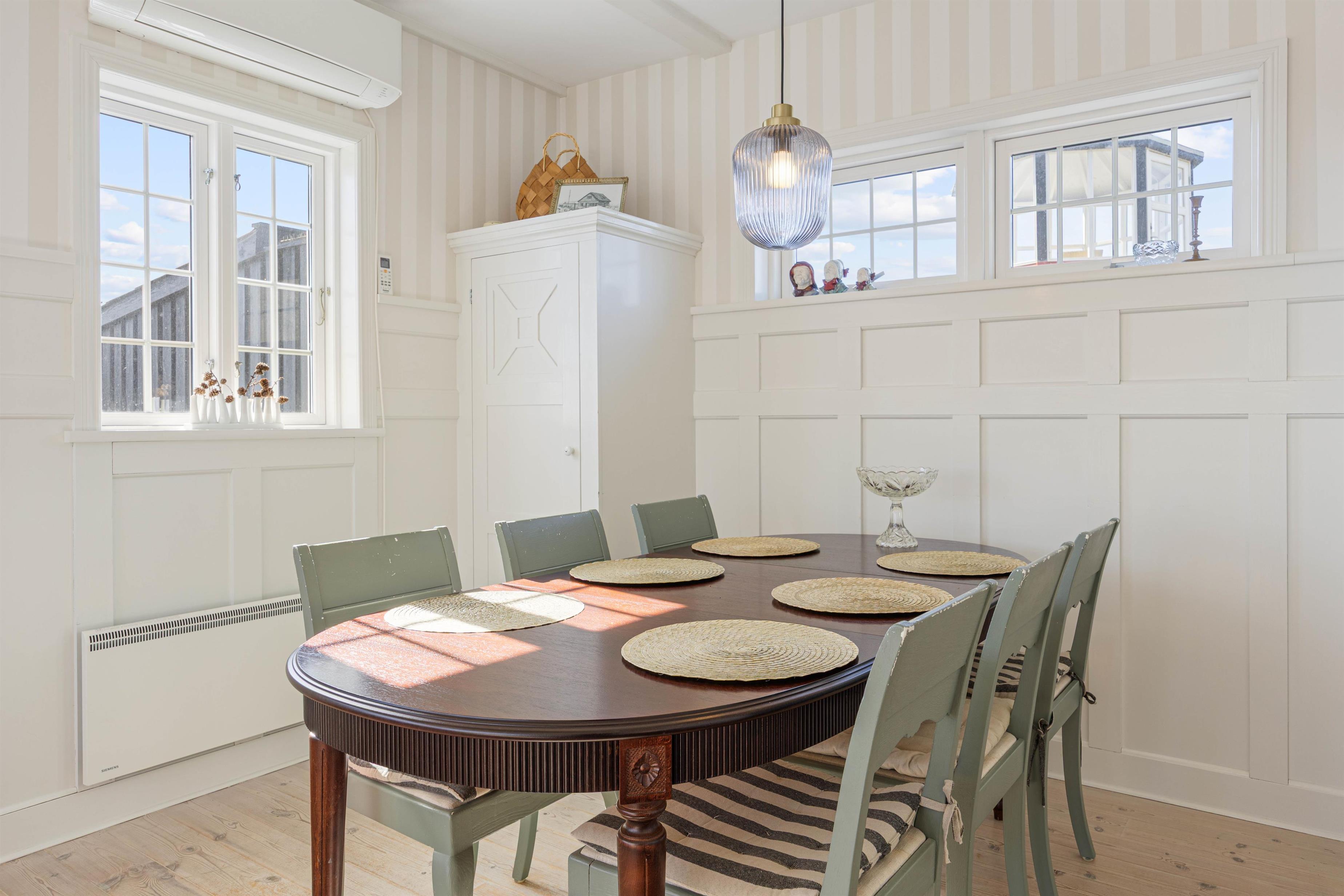 Allerede når I træder indenfor i dette sommerhus i Søndervig, vil I opleve den særlige badehotelsstemning, som gør huset helt unikt. De smukke vægpaneler, flotte tapeter og sprossede vinduer skaber en autentisk og hyggelig atmosfære, som man sjældent finder i traditionelle sommerhuse til leje.