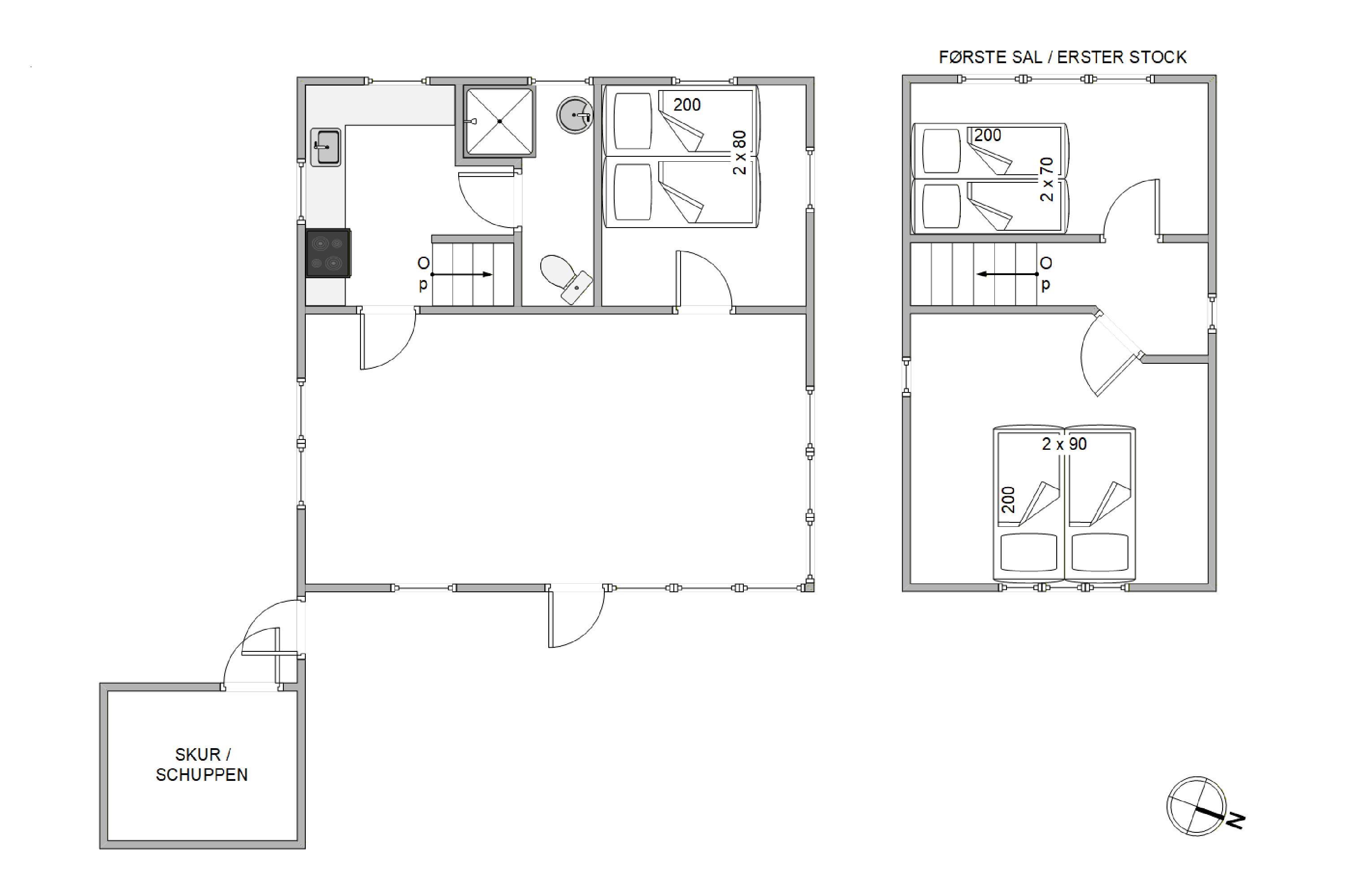 Selvom sommerhuset kun er på 72 kvadratmeter, er det optimalt indrettet med god plads til hele familien. Der er 3 soveværelser: 1 i stueplan med enkeltseng og 2 værelser på førstesalen – begge med dobbeltsenge. Et ideelt valg for dem, der søger et mindre, men velfungerende sommerhus tæt på Vesterhavet.
